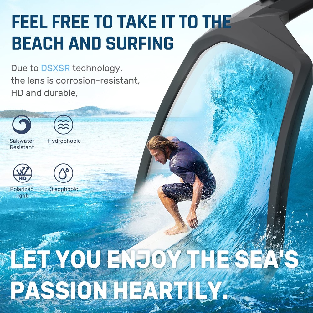LENS TECHNOLOGY - DSX-SR Saltwater Resistant Hydrophobic & Olephobic coating technology Protects mirrored lenses from being corroded by seawater.100% polarization kills reflected glare and reduces eye strain,colorful coating enhances vision and contrast, great for fishing inshore and on flats. TAC material lens provides high clarity, impact- and scratch-resistance along with lightweight all day wear-ability. FRAME TECHNOLOGY -sunglass frames are lightweight, extremely flexible, and heat and UV resistant.Durbility and lightweight TR90 frame with no-slip nose pad and temple increase grip with perspiration to offering all day comfortable fit.Spring hinges are adjustable and suitable for medium to large faces.Ergonomic design fits many face shapes comfortably and all sporty event IDEAL FOR ANY OUTDOOR SPORTS - Best for fishing, boating, sailing, jet skiing, driving, running, cycling, climbing, hiking and traveling. You can barely feel it on your face even wear it all day, a reliable partner when you enjoy outdoor. Fashion and stylish design, with rich color combinations of frames and lenses is also suitable for daily wear. WE FOCUS ON YOUR COMFORT - 1. You don’t have to squint in direct sunlight with polarized sunglases. 2. Zero pressure around ears&nose because of soft rubber nose pad and flexible rubber temples. 3. Zero fogging issuses: good air flow around top, sides and bottom to prevent fogging from sweat. 4. These sunglasses are perfect with wrap, coverage, block light from the sides perfectly. 5. It is made to fit this snug on your face and you could do any activities, it will stay in place all the time... LIFETIME WARRANTY - Frames and lenses are unbreakable for no risk purchasing. If something wrong with our sports sunglasses, contact eyewear experts without hesitation to solve the problem until satisfaction. provides lifetime warranty after sale service for all products.