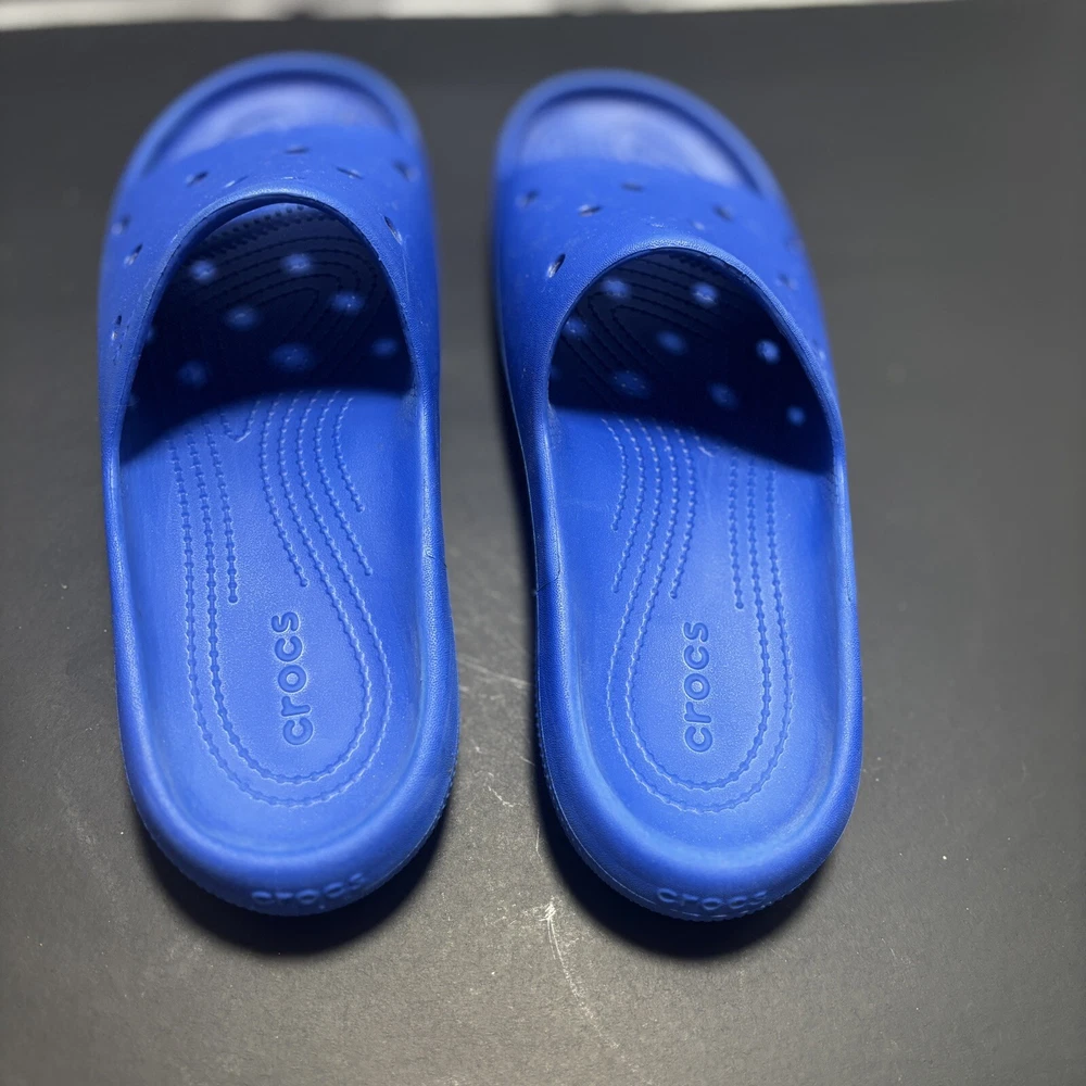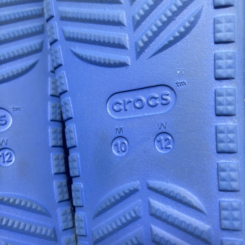 These Crocs slides are unisex and come in a blue color, suitable for both men and women. Designed with a slip-on and a round toe shape, they are perfect for casual wear and travel. With a solid pattern and a comfortable rubber outsole, these slides are great for outdoor activities and sports. The size is suitable for a men's 10 or women's 12, featuring a foam insole and a synthetic lining for added comfort. Ideal for the summer, fall, and spring seasons, these Crocs slides offer a stylish and practical option for everyday wear.