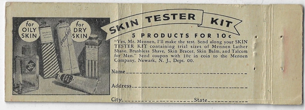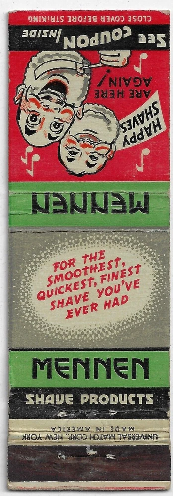 Mennen Shave Products Coupon Inside FS Empty Matchbook Cover Note the condition from the high resolution scans. The striker has been used overall the cover is in excellent condition with very minor wear. NO MATCHES IN THIS SALE COVER ONLY Your purchase will be sent by First Class Letter with tracking