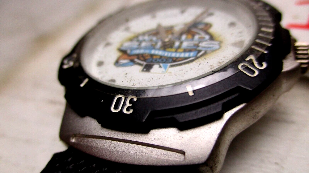 Men's 40mm Silver Tone Game Time Agent World Series 100th Anniversary Watch. I could not find any traces of use, with the film on the glass, the belt spike holes without damage looks like new to me. However, I marked the holes as used. Required battery installation. Good overall condition, the item may have some signs of cosmetic wear, but fully operational and functions as intended - see actual pictures for details. You will get exact same item what you see on LISTING PHOTOS. I accept return. Buyer pays return shipping. Please ask Questions before bidding or paying for item. Measure tape is not part of sale. Thank you for visiting my store.