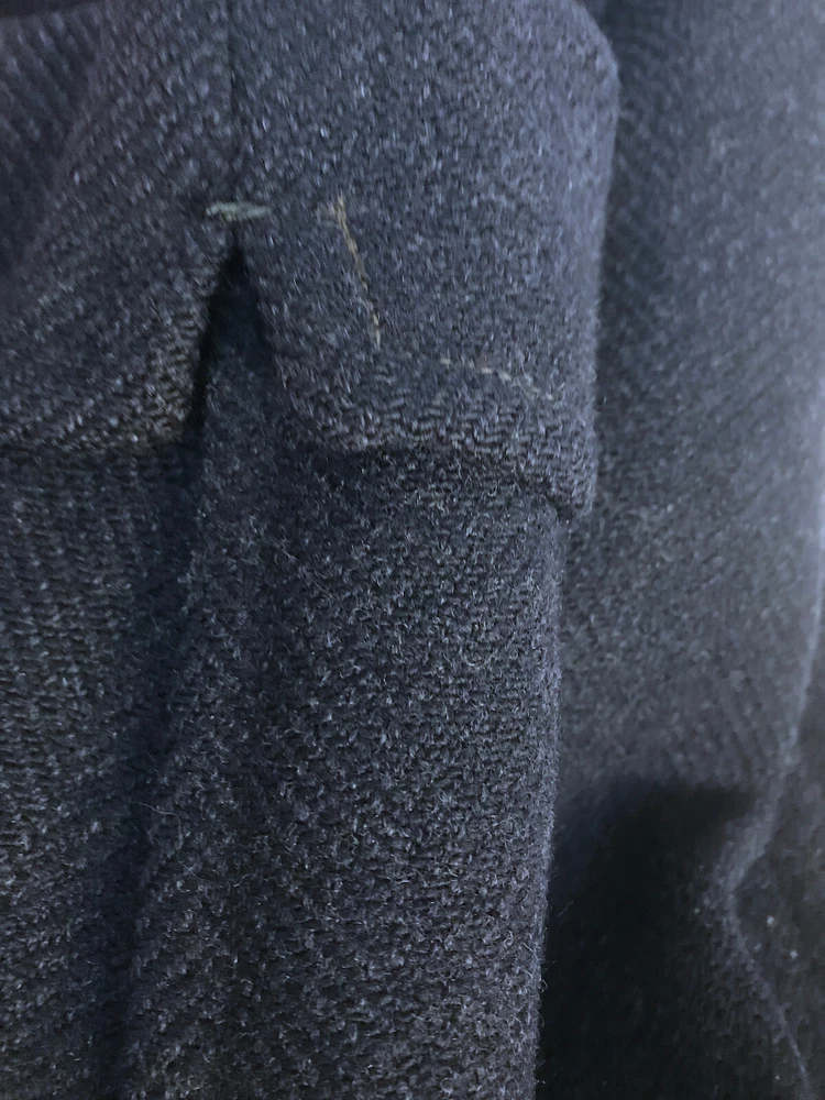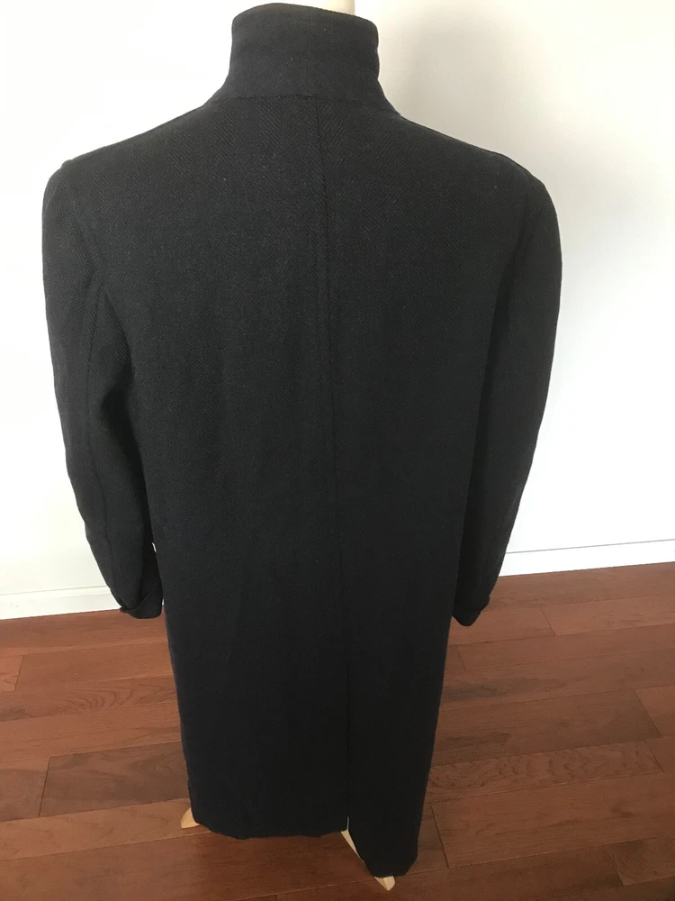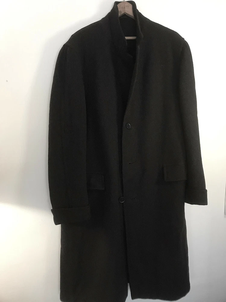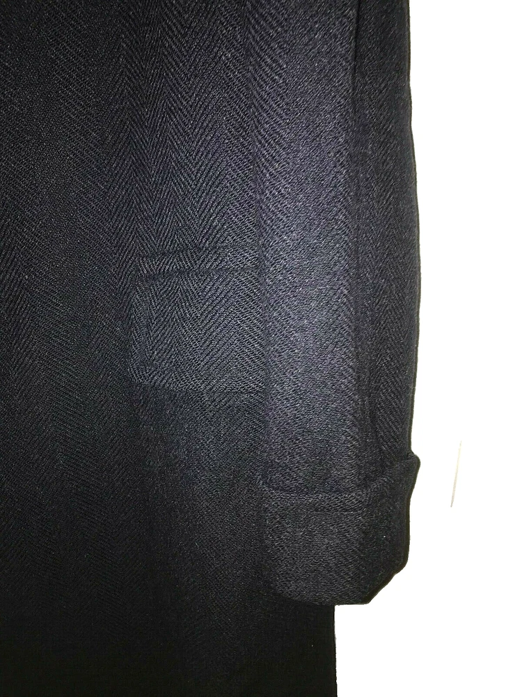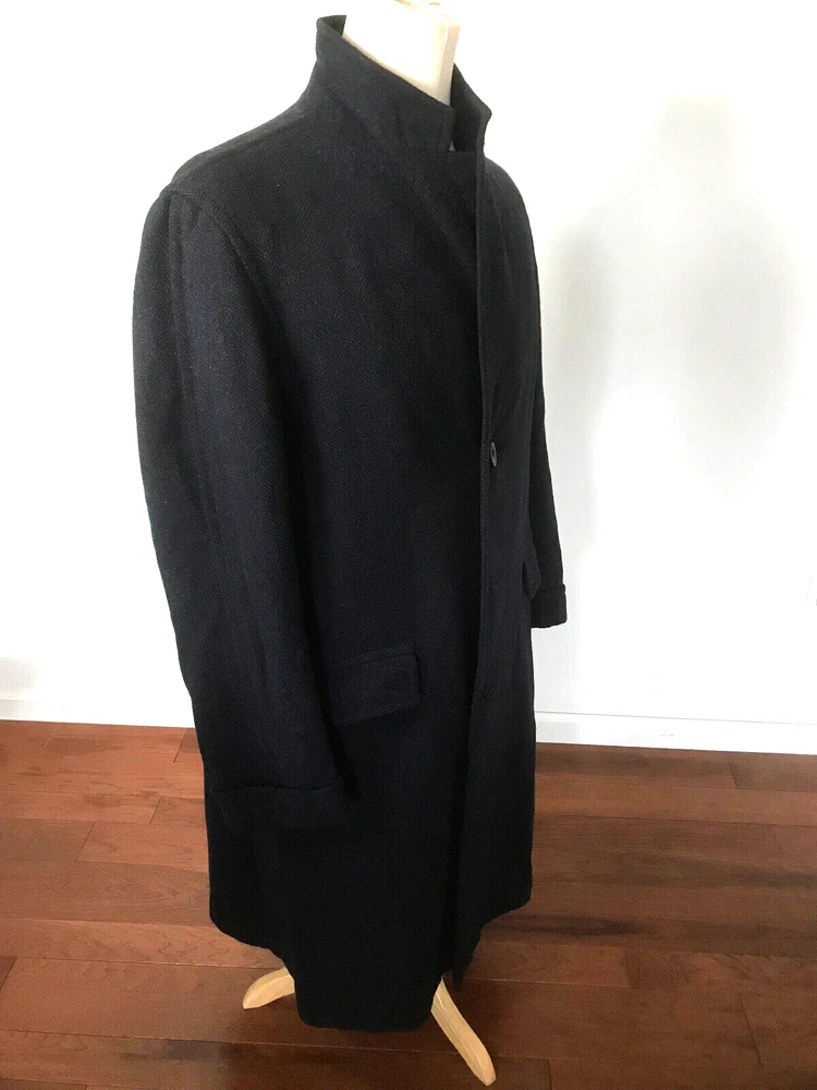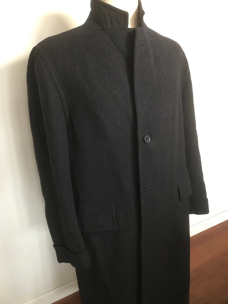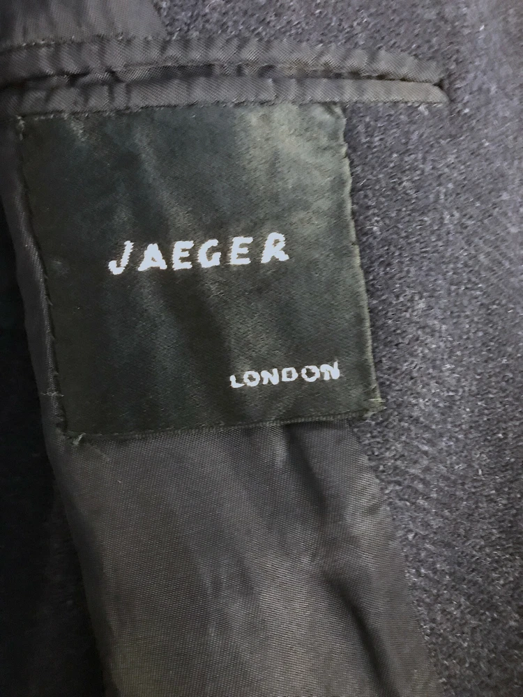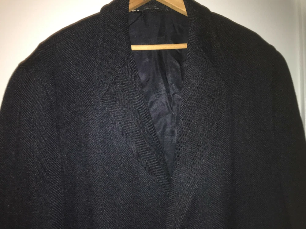1960 British topcoat JAEGER reknowned maker of men's wear Dark Blue Gentleman's overcoat Size 44 note British size 44 made to accomodate sweater or jacket (thus chest 48 inch + to accomodated sweater or tweed jacket and drape properly.) Jaeger heavywieght tweed chevron in ex. vintage condition. No rips no moth work and little wear evident partial lining good condition. the blue is so dark it is difficult to photograph. sleeves are beautifully cuffed, note gathering of material at shoulder (which is unpadded), typical of higher end tailoring of the period. no wear to the bottom hem, back shoulder one side has ancient repair to 1/2 cm of wear. Overcoat is VINTAGE, c.1959 - 60. Length back collar to hem= 47 inches approx shoulder to shoulder between 20 - 21 inches Chest 44 - 48 across front Shoulder to end sleeve 26 + inches Under arm to end sleeve 18 + inches
