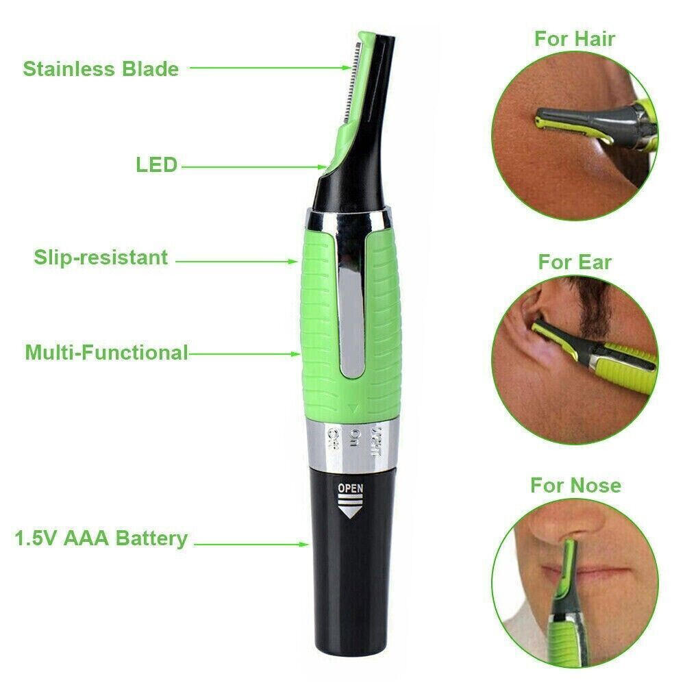 Men’s Nose Ear Face Neck Eyebrow Hair Mustache Beard Trimmer Shaver Clipper Hot product details Ear and Nose Hair Trimmer Clipper - Painless Eyebrow & Facial Hair Trimmer for Men Women, Battery-Operated Trimmer for Easy Cleansing, Makes you more perfect and more attractive. Multi-feature clipper, perfect for nasal, ear, eyebrow and sideburn grooming, Use on face, neck, eyebrow and body. Features - Quiet motor with smooth precision trimming, Lightweight design with rubber non-slip grip and built in LED light. Comfortable and Safe to the touch the blade. Note - To avoid damage to your trimmer, be sure that the battery is installed in the proper direction indicated by the +/- signs; If your trimmer will not be used for a long period of time, remove the battery from the unit. Package List: 1x Eyebrow Ear Nose Trimmer; 2x Comb attachments; 1x Cleaning brush