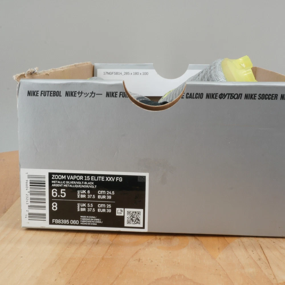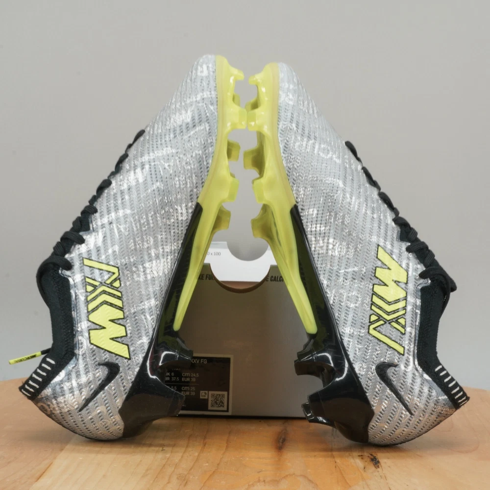 Product Details Item Name: Nike Zoom Vapor 15 Elite XXV FG Mercurial Soccer Cleats NEW Condition: Brand new, in box(No Lid) Style Code: FB8395-060 Size: Mens 6.5 / Women 8 (Sizes are listed as US equivalents) *Please be sure to look at all pictures before purchasing this item!* Even if we specifically state that the pair is new, it is possible that a shoe may have a defect from manufacturing / shipping. Please review the photos as we do our very best to show you every angle of the shoes you are purchasing. As always, do not hesitate to reach out if you have questions! Shipping We always ship same day or next! (Unless otherwise stated. Excludes holidays/weekends) Payments Immediate Payment is Required. All payment methods are accepted. If there are any questions in regards to the product, please contact us. All products are 100% Authentic. Pictures are taken to the best of our ability to make sure you clearly know what you are getting. All of our pictures are of the actual product you will be receiving. Thank you for shopping with Salty Soles!