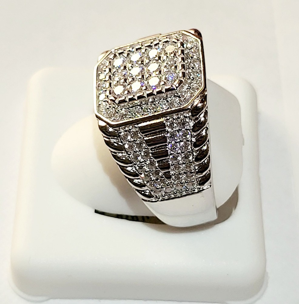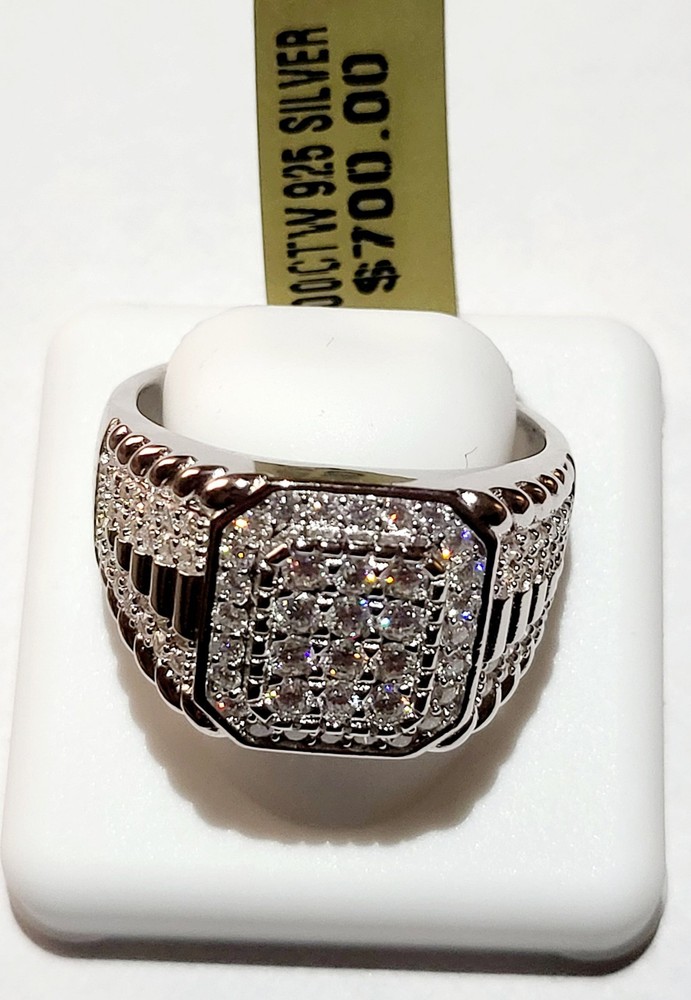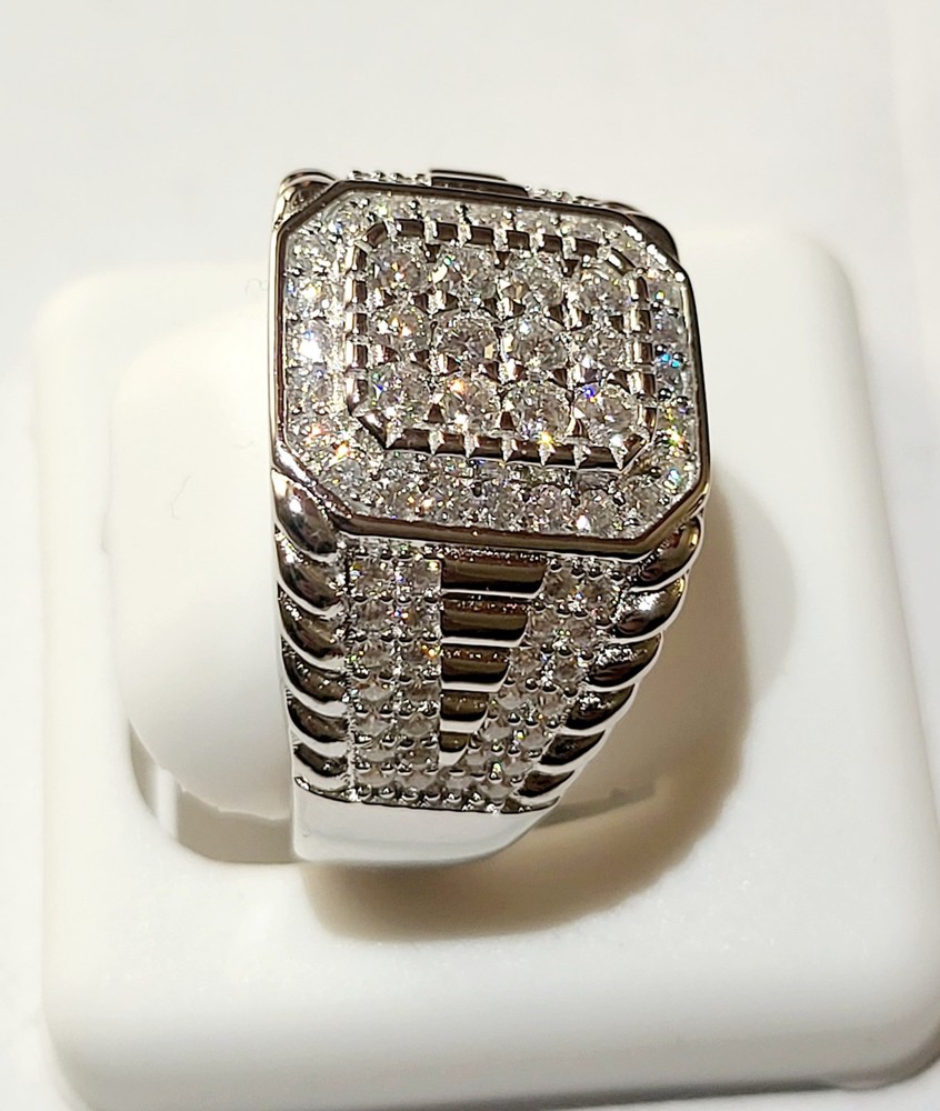 This real 925 sterling silver men's hip hop ring features a square shape with a round moissanite stone in a 2ct size. The ring is designed with an eternity style, adorned with iced moissanite stones, and has a silver color look. It is suitable for various occasions such as engagement, Christmas, graduation, Father's Day, and christening, making it a versatile piece for the modern man. The ring is stamped 925 for certification and is made in Italy with a lifetime warranty. Overall, this hip hop-inspired ring is a bold and stylish accessory for men.