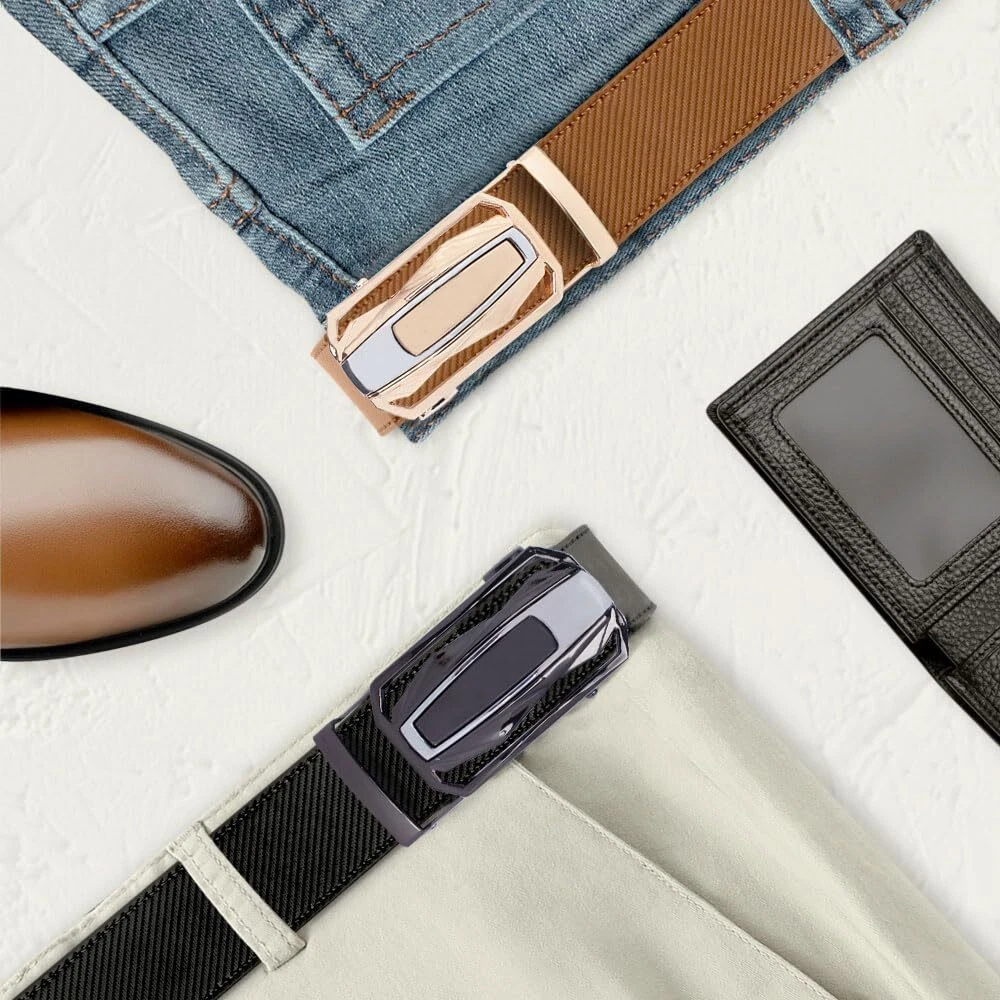 Customizable Fit:Achieve the perfect fit with up to 1/5" adjustments. Tailor the belt to your unique style with the easily removable buckle Effortless to Use:Slide into the sliding buckle, pull through, and click-it locks in place. Release with a gentle push on the lever.32 ratchet notches provide precise waist adjustments of 0.25". Enjoy a comfortable and precise fit every time Maximum Durability:Crafted with genuine leather for a refined look. High-density buckle is scratch-resistant for longevity Exact-Fit:Easy to customize size by removing the buckle and cutting the strap. Avoid the hassle of too short belts Elegant Perfect Gift Box:-Comes in elegant gift box packaging. Featuring construction for comfortable wearing all-day long, fashion leather belt men will meet almost any occasions and outfits, which is also the utmost suitable gifts for men.