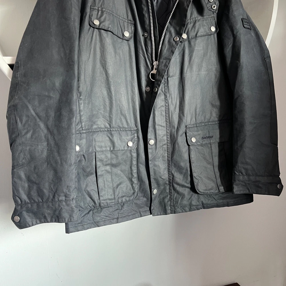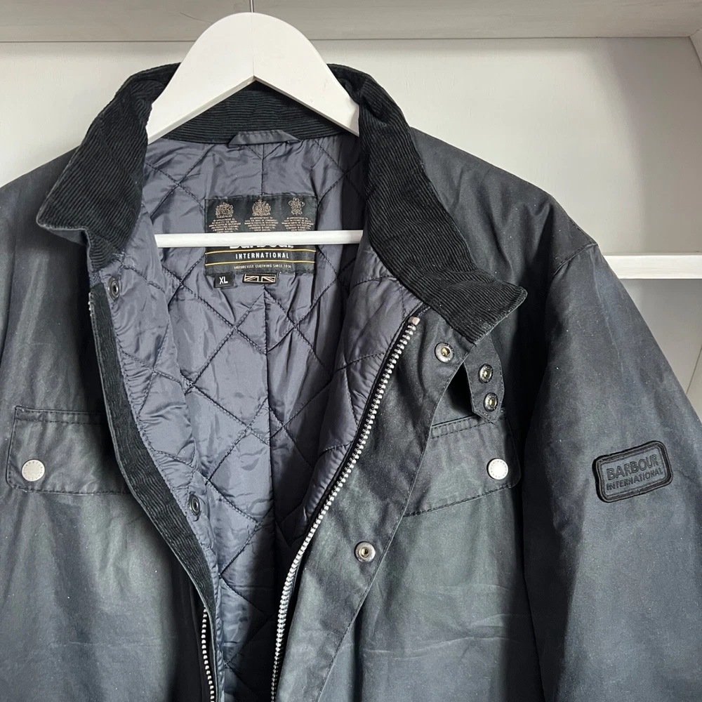 Men's BARBOUR INTERNATIONAL DUKE Waxed Cotton Navy Jacket Size XL Condition: excellent used condition, has small signs of wear, no defects Size: XL , but please check measurements below! Length back 75 cm / 29.5" Pit to pit 60 cm / 23.6" Shoulders 50 cm / 19.7" Sleeve length from shoulder 65.5 cm / 25.8" Feel free to ask any questions! Worldwide shipping with tracking from outside Ukraine, estimated time to US / UK / EU and other countries - from 15 to 25 days!
