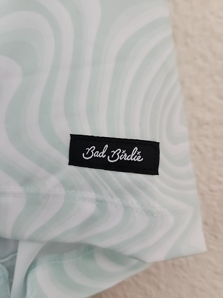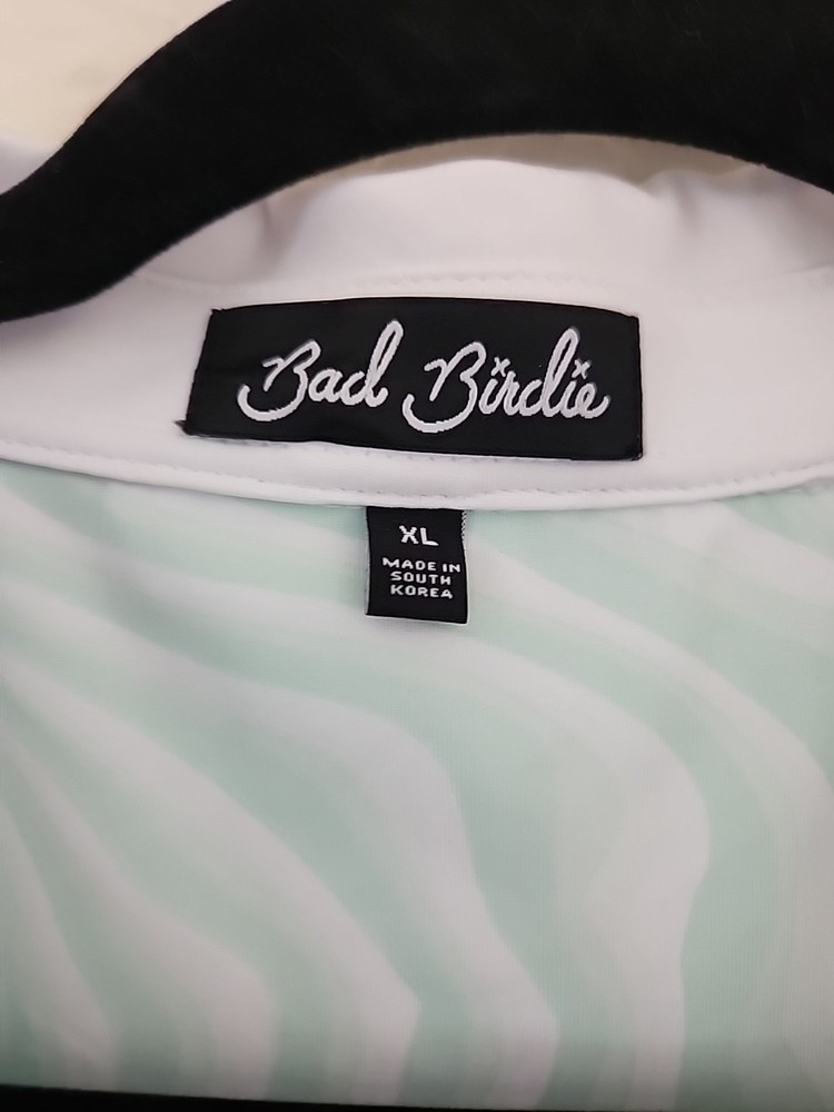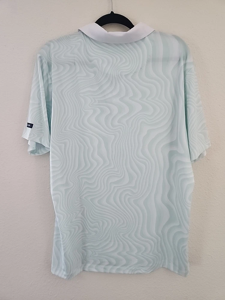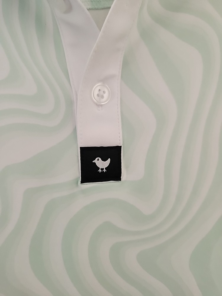 This Men's Bad Birdie Green and White Swirl Short Sleeve Polo in size XL is a stylish and versatile addition to any wardrobe. Made from a blend of polyester and spandex, this polo offers a lightweight, breathable, and stretchy fit perfect for travel, activewear, or casual occasions. The collared neckline and button closure give it a classic look, while the embroidered logo adds a touch of sporty flair. The green color and swirl pattern add a pop of personality to this regular fit polo, making it a great choice for the summer, fall, or spring seasons. Has a custom embroidery. Look at pictures.