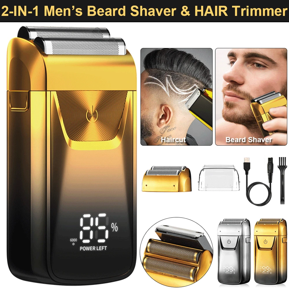 Description ★ Foil shaver: Easily and comfortably trims face, neck and chin. Safe and clean without hurting the skin. ★ Speed: The shaver has 3 speed adjustments. 6 500RPM at most. Give you a quick shave. ★ Pop-up trimmer: Easily and quickly trim longer beards and sideburns for you. Leaves your face refreshed and cleansed. ★ LED: The LED display clearly shows the remaining percentage of the battery. Reminds you to recharge your hair shaver. ★ Battery power: The shaver has a built-in 1 4 00mAh battery, which can be used for up to 1 2 0 minutes after charging for 2 hours. Product Details : Material: ABS Color: Gold /Sliver Power: 5 w Charging Time: 2 Hours Use Time: 120 Minutes Battery: Lithium Battery 14 00mAh Size: Approx. 12x6x3.8cm / 4.7*2.3*1.5inch What You Get : 1 * Men's Shaver 1 * Spare Shaving Head 1 * USB Charging Cable 1 * Clean Brush 1 * Protective C over 1 * Instruction manual