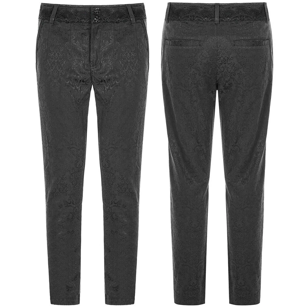 Elevate your wardrobe with these Men's Black Brocade Gothic Regency Dress Pants by Tripp Apparel. Tailored for a regular fit, these medium-sized pants boast a sleek, solid black brocade fabric that ensures both comfort and style. The rayon material offers a smooth finish, perfect for any formal or business occasion. Designed with versatility in mind, the pants feature an adjustable waist, convenient pockets, and a zip and button closure to accommodate your needs. Whether you're dressing up for a wedding or heading to a business meeting, these pants are suitable for a wide range of events, ensuring you look sharp year-round.