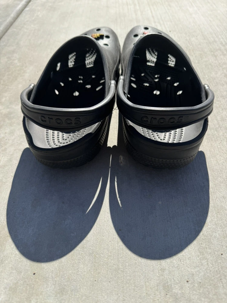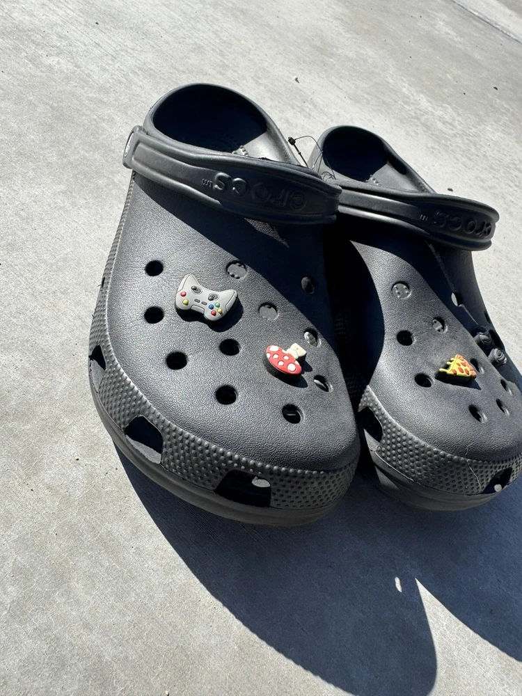 You’re looking at a pair of men’s black crocs. These crocs are a size 11 men’s come with four charms featuring a pizza charm a game controller, charm, headphone, charm, and a mushroom charm. NOTE: the left croc on the heel is a little bent, but will relax after use. These crocs were barely worn. They are in great condition. There is some signs of wear. All sales are final All items come from a smoke and pet free environment Shipping for this item is only $8.99 ( love to combine by shipping ) If you have any questions, please feel free to ask thank you for looking and happy bidding