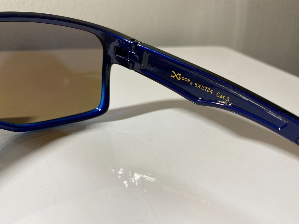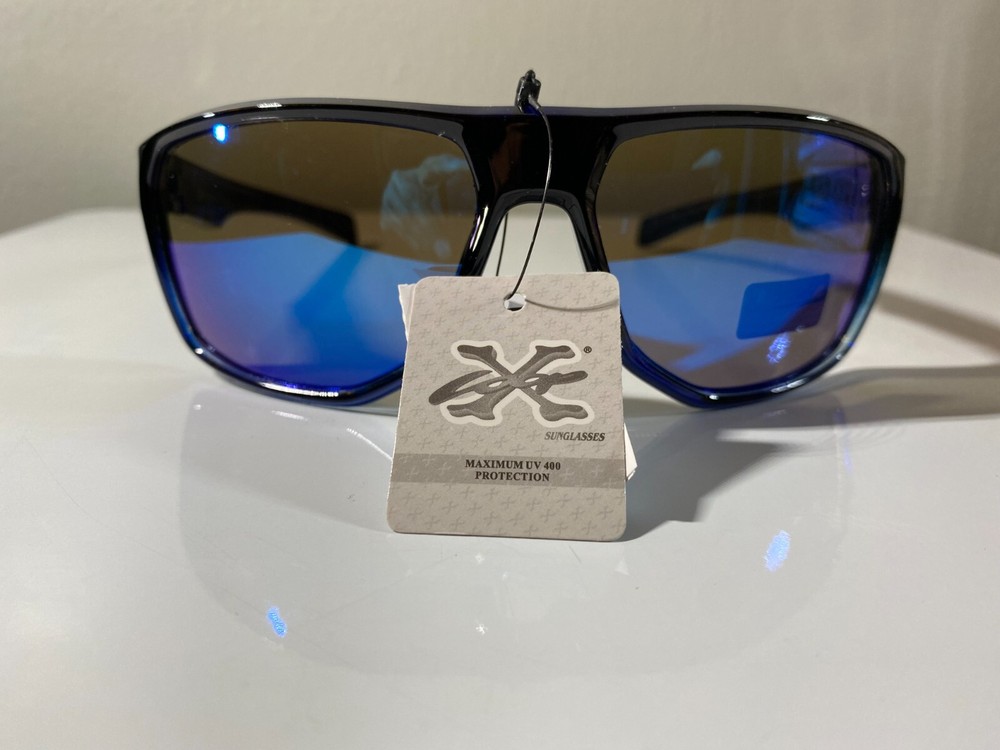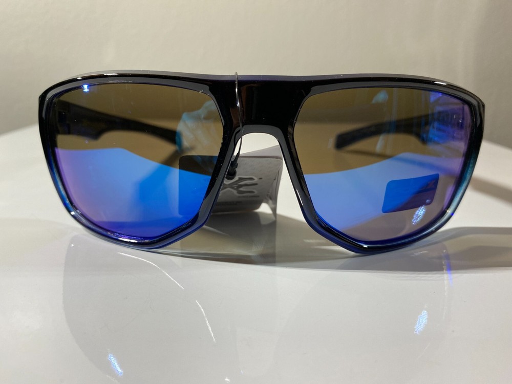 Men's wrap around sunglasses with black frame and blue reflective lenses. Great price.