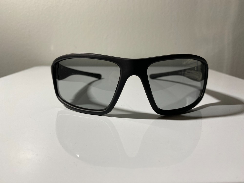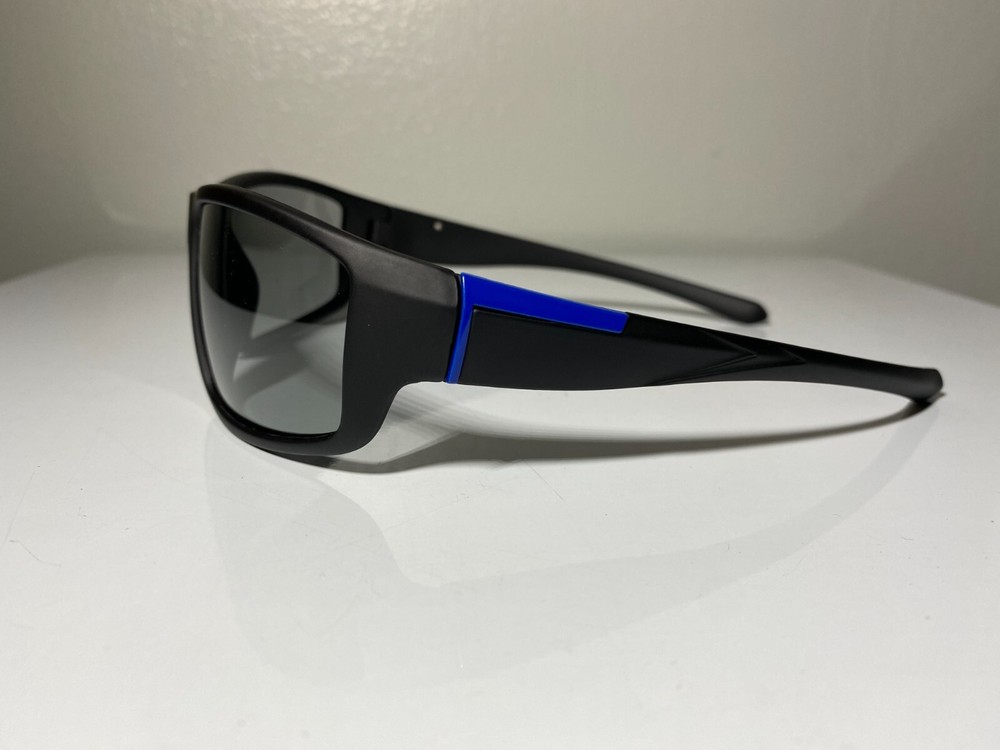 Men's motorcycle riding type sunglasses with black frame with blue trim and gray lenses. Brand new and only opened to take display picture.