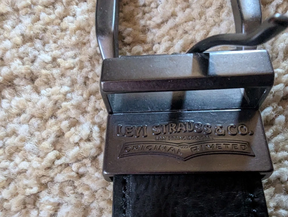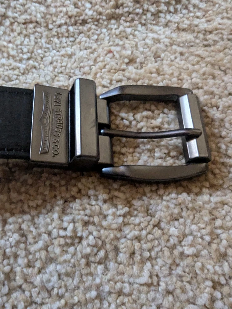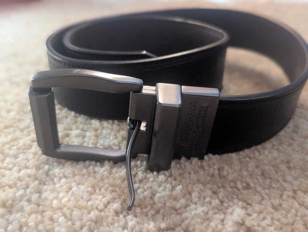 This black Levi's dress belt is perfect for any occasion. Made of bonded leather, it features a solid pattern and a brass buckle. The belt is 1.5 inches in width and can fit waist sizes up to 35 inches in length. The size L (30-32) belt is suitable for men and is a regular size type. It is not vintage and is not handmade. The belt is not personalized and is not suitable for children. The Levi's brand is known for its quality clothing and accessories, and this belt is no exception.