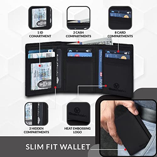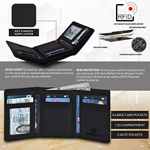 Return Policy Fast Delivery Trusted seller Men's Genuine Leather RFID Blocking Slim Trifold Wallet for Men with 7 Cards+1 ID Window+2 Note Compartments (Black Nappa) Product Description Trifold closure Dry Cloth Clean 100% Genuine leather credit card is specially designed to carry currency note,Ids & credit cards, RFID BLOCKING TESTED & APPROVED BY INDEPENDENT LAB TESTS. Our wallets have been tested for 13.56 MHz Frequency in which our credit cards, debit cards, driver license and ID cards operate. PLEASE BE NOTED THAT the signal of some ID badge, access cards and hotel room cards which operates in 125 KHz, can not be blocked by this wallet. FUNCTIONALITY: 1 Note Compartment, 4 credit card slots & 1 ID compartment ENHANCES PERSONAL SECURITY: We leverage top RFID technology to block RFID signals used to electronically scan your wallet as someone passes by unnoticed. This keeps your vital information in driver license, debit cards and credit cards from being stolen. Shipping Returns Payment Shipping Shipping is FREE to all addresses other than APO/PO boxes in the lower 48 states. All our stock ships from US-based warehouses. Shipped via USPS or UPS (depending on location and package weight) Unless stated otherwise, all orders will ship within 24-72 hours of your payment being processed. Check our feedback to see the great reviews of FAST shipping we offer. Returns Seller does not accept returns Payment We currently accept payment via eBay managed payments only. Once payment is cleared, we will dispatch your shipment within 1-3 business days. Please refer to the "Shipping" tab for more information regarding shipping speed to your destination.