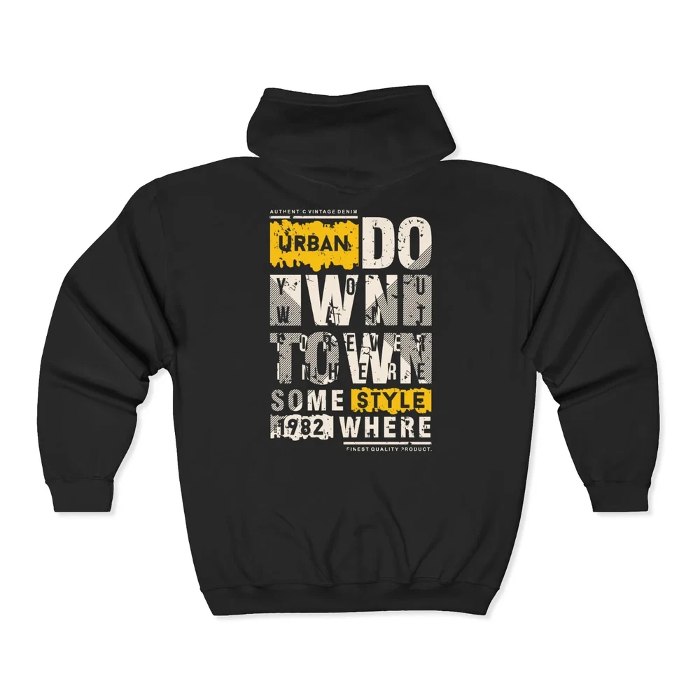 This black zip-up hoodie for men combines style and comfort with a distinctive graphic printed on the back. Crafted from a soft, durable fabric blend, it offers warmth and breathability for everyday wear. The full-length zipper provides easy on-and-off convenience, while the adjustable hood adds extra protection against the elements. Designed to fit comfortably, this hoodie is perfect for casual outings or layering during cooler weather, making it a versatile addition to any wardrobe. Overview; The classic comfy zip-up, featuring air-jet spun yarn for a softer fleece with reduced pilling. Once put on, it will be impossible to take off. Durable silver-colored metal zipper with metal puller. This heavy blend hooded sweatshirt is relaxation itself. Made with a thick blend of cotton and polyester, it feels plush, soft and warm, a perfect choice for any cold day. In the front, the spacious kangaroo pocket adds daily practicality while the hood's drawstring is the same color as the base sweater for extra style Points. Fabric; Made with a medium-heavy fabric (8.0 oz/yd² (271 g/m²)) that consists of 50% cotton and 50% polyester for that cozy feel and warmth you need in a Hoodie. Fit; The classic fit along with the pouch pocket make for a highly comfortable, scratch-free wearing experience. Adjustable hood with self-colored woven cord and buttonhole openings for the Cord. Fabric blends; Heather Sport colors -may contain more than 50% Polyester.