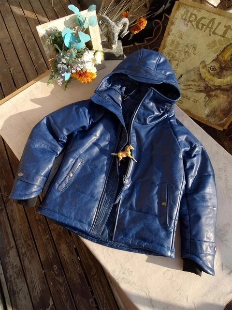 Mens Blue Genuine Leather Lambskin Padded Quilted Down Puffer Jacket