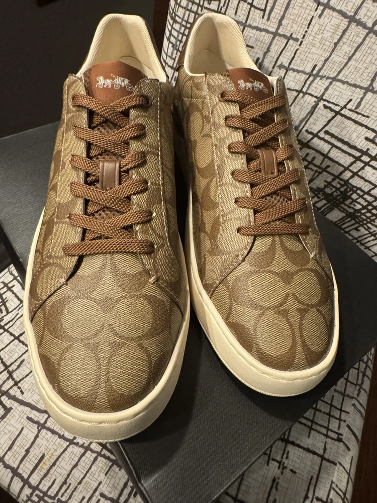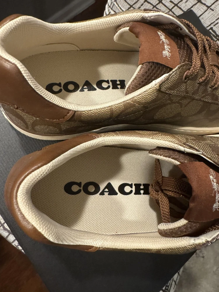 Mens COACH Signature Logo Coated Canvas Low Top G4949 Sneaker/ Shoe (Khaki/Saddle) Size 11.5 Coach Signature Logo Coated Canvas Sneakers DESCRIPTION Named for the bustling trail on New York City's West Side, our High Line sneaker combines sophisticated good looks with maximum comfort. Crafted of our Signature Logo print coated canvas and smooth leather, the low-top silhouette features a comfortable cushioned insole and a lightweight EVA outsole. feature: * Signature coated canvas and leather upper * Lace-up closure * Fabric lining and footbed * EVA outsole