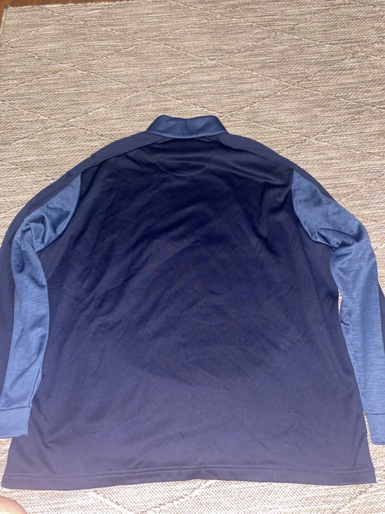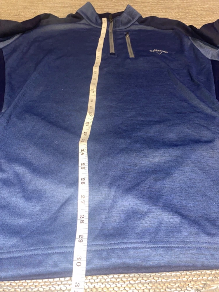 This is a Men's Callaway Golf 1/4 Zip Fleece-lined Pullover in size XXL. It features a solid navy/heather blue color, long sleeves, mock neck, and a zipper closure. Made of 100% polyester fleece, it offers UPF50 sun protection. The pullover is designed for activewear, specifically for golf, and is machine washable. It is branded by Callaway and has a logo accent on the zipper.