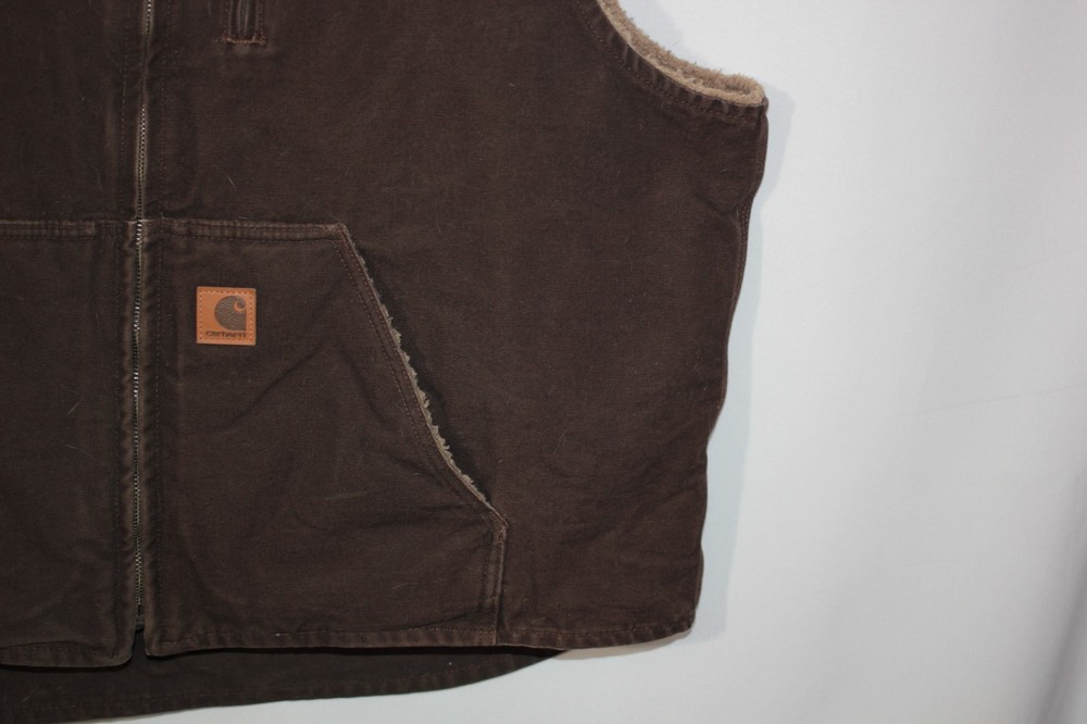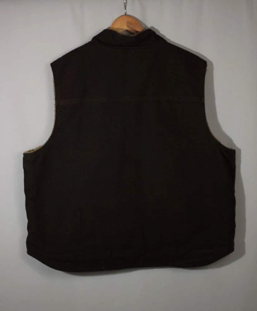The Mens Carhartt faded Brown Full-Zip Canvas workwear vest is a classic and durable piece perfect for rugged outdoor work. Made from sturdy canvas material with a comfortable polyester lining, this vest features a full zip for easy layering. The biker style and rugged design make it a versatile and stylish addition to any man's wardrobe, suitable for tough work environments or casual outings. With the iconic Carhartt brand and a size 2XL, this vest is a timeless piece that embodies American quality and craftsmanship. has fading throughout the vest as shown in pics. p2pXt2b 27X25