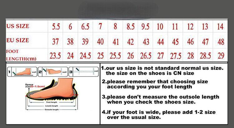 Size Chart: size 36 = foot length 23 cm / 9.06 Inch =US5 size 37 = foot length 23.5 cm / 9.25 Inch=US5.5 size 38 = foot length 24 cm / 9.45 Inch=US6 size 39 = foot length 24.5 cm / 9.65 Inch=US6.5 size 40 = foot length 25 cm / 9.84 Inch=US7 size 41 = foot length 25.5 cm / 10.04 Inch=US8 size 42 = foot length 26 cm / 10.24 Inch=US8.5 size 43 = foot length 26.5 cm / 10.43 Inch=US9.5 size 44 = foot length 27 cm / 10.63 Inch =US10 size 45 = foot length 27.5 cm / 10.83 Inch=US11 size 46 = foot length 28 cm / 11.02 Inch=US12 size 47 = foot length 28.5 cm / 11.22 Inch=US13 size 48 = foot length 29 cm / 11.42 Inch=US14 size 49 = foot length 29.5 cm / 11.61 Inch=US15 size 50 = foot length 30.0 cm / 11.681 Inch=US16 Shipping 1.We ship to your eBay or Paypal address. Please make sure your eBay and Paypal address is correct before you pay. 2.Items will be shipped within 1-4 business day when we received payment. 3.Delivery time depends on destinatio n and other factors; Return Policy All the items may be exchanged or refunded within 30 days of purchase. Returning item must be in same condition as sold. New in original package with all original accessories. Without any damages, scratches or signs of use. Contact *Pl ease contact us first with any issue, before leaving a feedback or contacting eBay. We're ready to assist you and provide the best communication to fix the existed problem. Thank you eBay Cross Border Trade powered by ChannelEffect