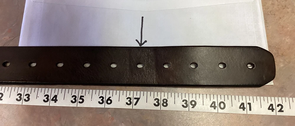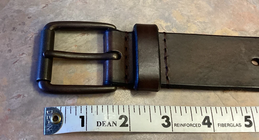 Mens Casual Jeans Genuine Leather Dark Brown Belt Size M From the buckle to the fifth hole from end was 37”. The width of the belt is 1.5”. Made in Guatemala. There are two spots where the back of the belt is ruff on the edge. See pictures. Looks like the belt loop was a little tight. Have questions, please write. Shipped USPS Ground Advantage