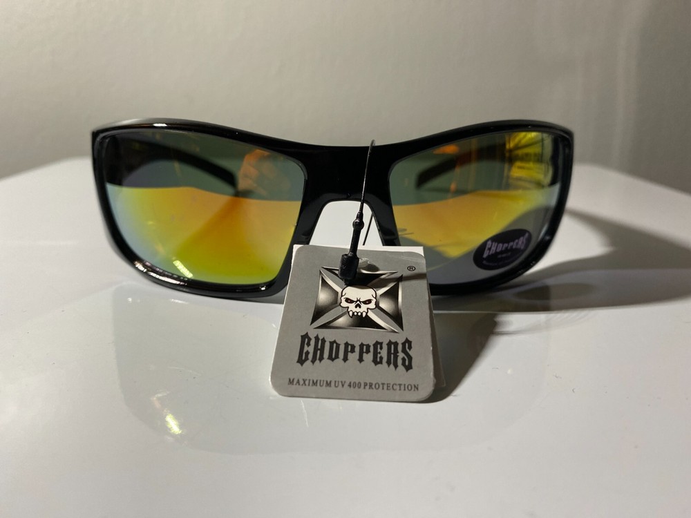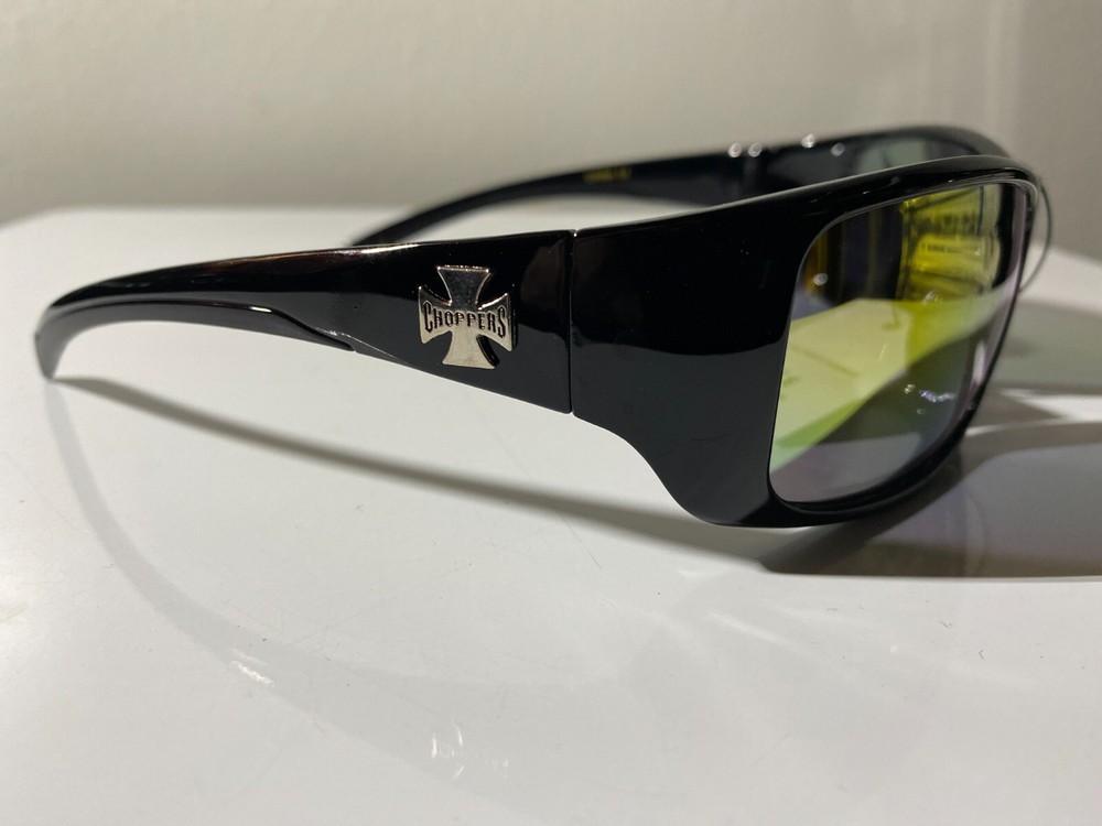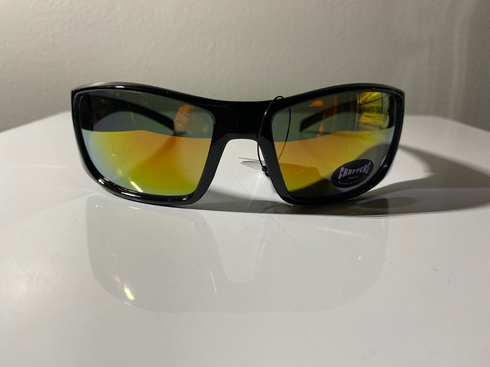 Men's "Chopper's" brand riding sunglasses with black frame and yellow lenses. Also good as workplace safety glasses where side shields are required.