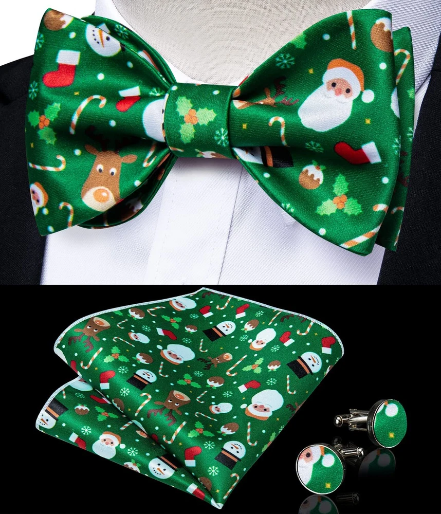 【Christmas Bowtie Set】Silk Green Christmas Self Bowtie+Woven Pocket Square+Cufflinks+Gift Box. The unique pattern and elegant style of the bowtie make your Christmas full of romance. As a Christmas gift for family or friends, the Christmas bowtie is definitely a big surprise 【Material and Craft】Christmas green and white snowman bowtie and pocket square are made from Silk. 2000 stitches jacquard woven craft, high-density fabric makes the festive bowtie soft and comfortable,non-deformed and durable.Make you look elegant and charming 【Unique Design】With a series of novel pattern and special colors for Christmas, Christmas self bowtie contains every Xmas element you can think of, so that you look full of Christmasy, Best match for Christmas,banquet,holiday party, festival prom and vacation etc 【CLASSIC SIZE】4.5 inches x 2.7 inches, for neck size(Adjustable): 14 inches-18 inches, pocket square size: 9 inches x 9 inches,Cufflink Diameter:0.55 inches. Exquisite men's bowties for a variety of dress shirts and suit tuxedo. Fill your Christmas with ritual 【More Choices】bowties with unsurpassed quality can attract more people's eyes in any occasion which is essential accessories for your wardrobe.To learn more about tie sets in different colors and styles, welcome to our tie