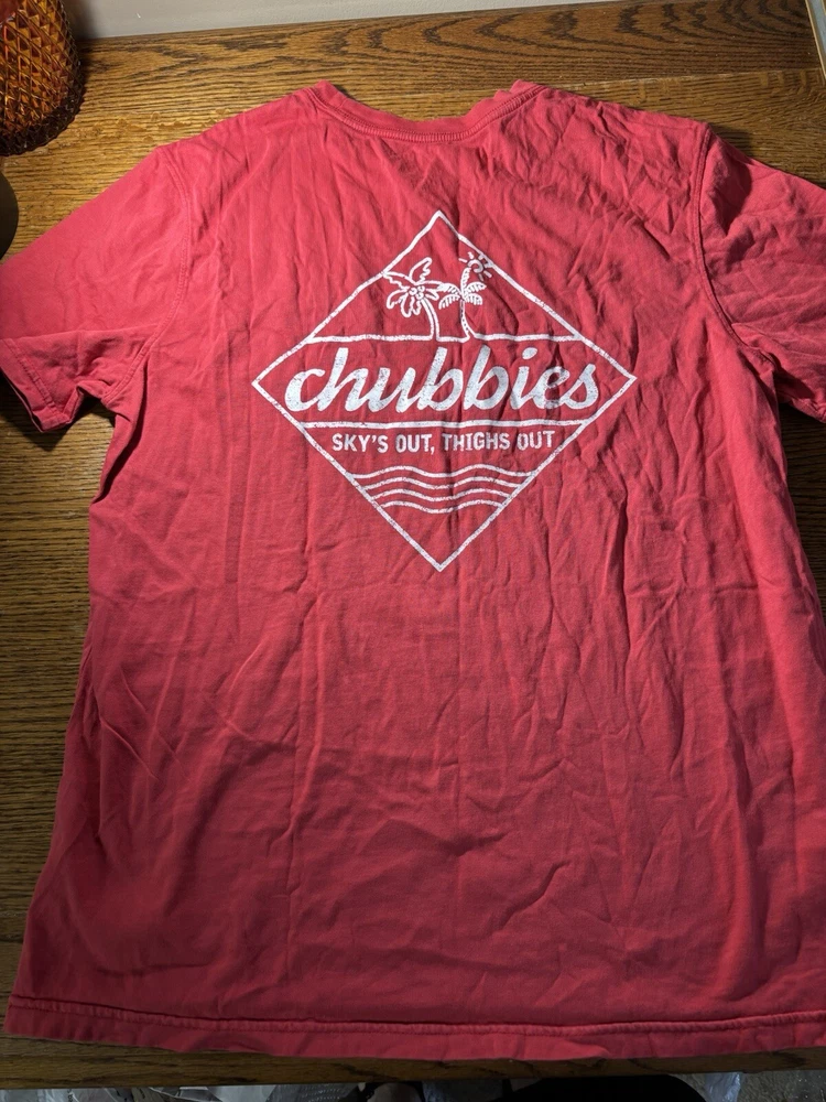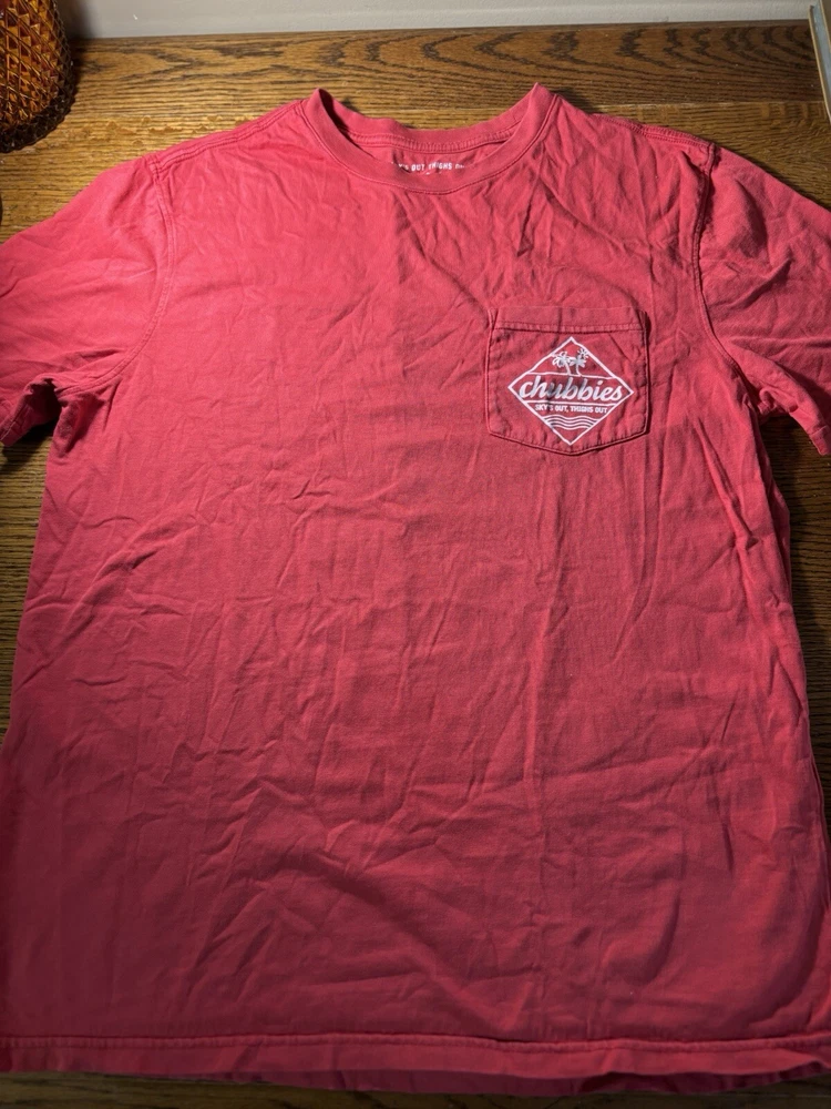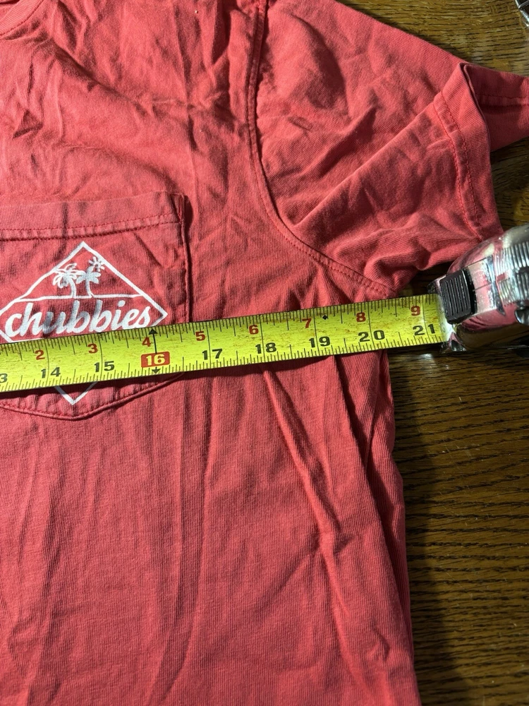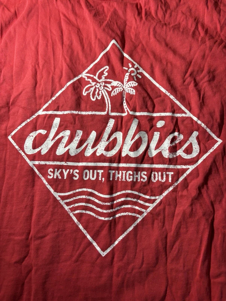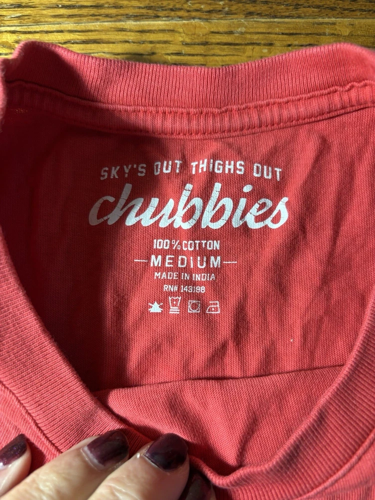 This Chubbies T-shirt is perfect for anyone who loves the beach or sports. The shirt features a graphic print on both sides, with a crew neck and short sleeves. It is made of jersey fabric, which is comfortable and machine washable. The shirt comes in size M and has a regular fit. The red color and logo accents make this shirt a great addition to any wardrobe. There is a front chest pocket with the Chubbies logo. Chest size 42". This T-shirt is perfect for men who want a comfortable and stylish shirt that is easy to care for. It is made in India and is not handmade.