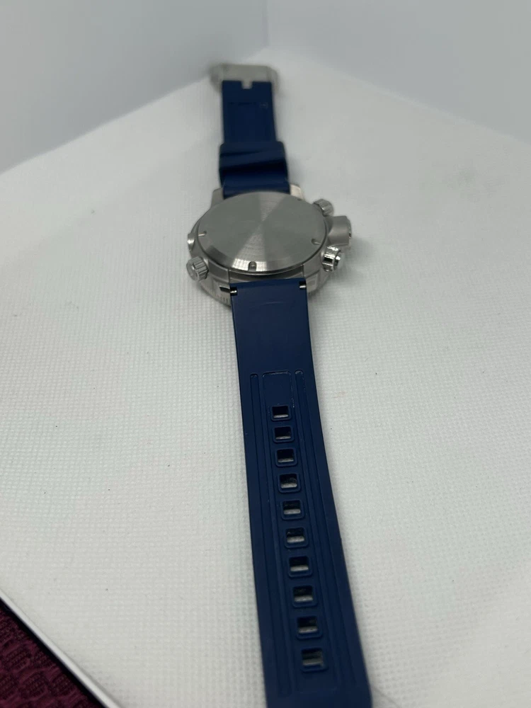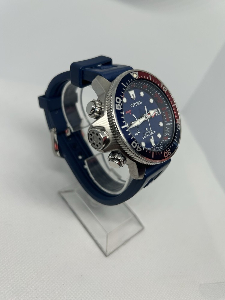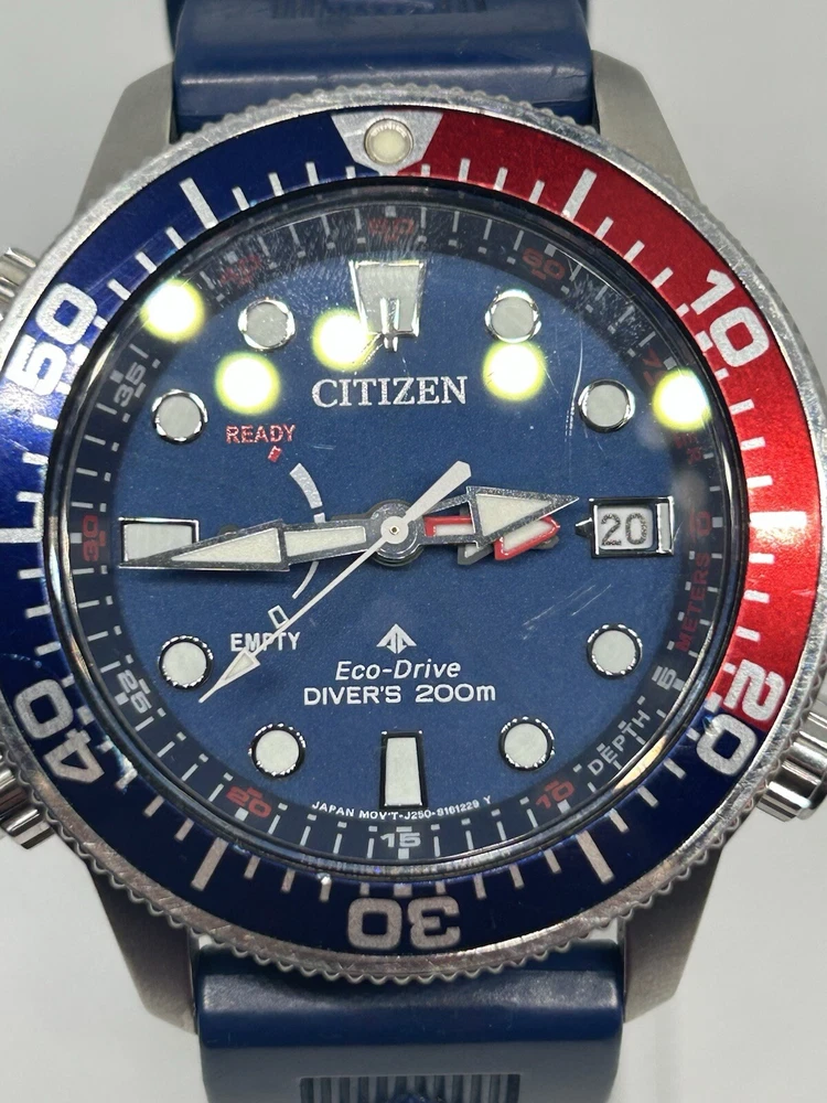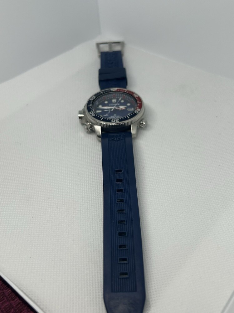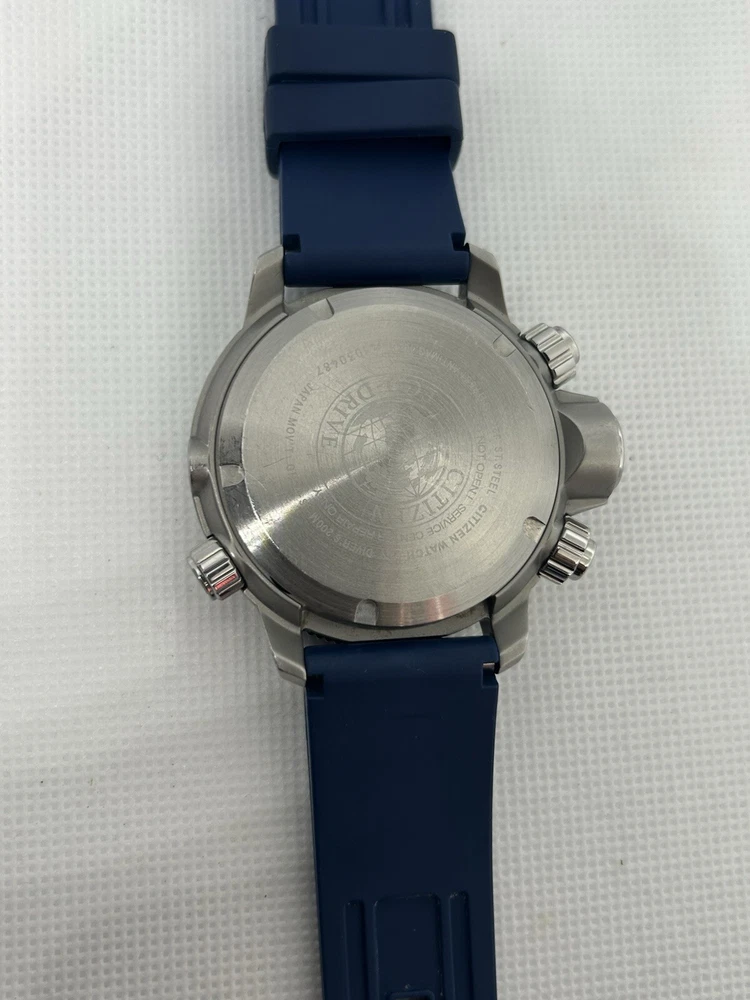 Elevate your style with this sophisticated men's wristwatch from Citizen. With a sleek silver case and a durable stainless steel caseback, this Eco-Drive watch is not only stylish but also designed to last. The blue two-piece strap made of rubber provides a comfortable fit while the watch is water-resistant up to 200 meters, making it perfect for diving and water sports. The analog display is powered by a reliable quartz movement and features a 12-HR. dial, multi-dial, and non-numeric hour marks. The watch also includes a date indicator, depth indicator, and mineral crystal for added functionality. The Citizen Eco-Drive BN203801L is a perfect accessory for any occasion, whether you're going to work or out for a dive. This Watch is pre-owned and has minor signs of use to it such as minor scratches on its crystal and caseback and some dirtyness on its strap. Watch is fully functional and works as it should measurement of the watch is shown in pictures. Message me if you are interested