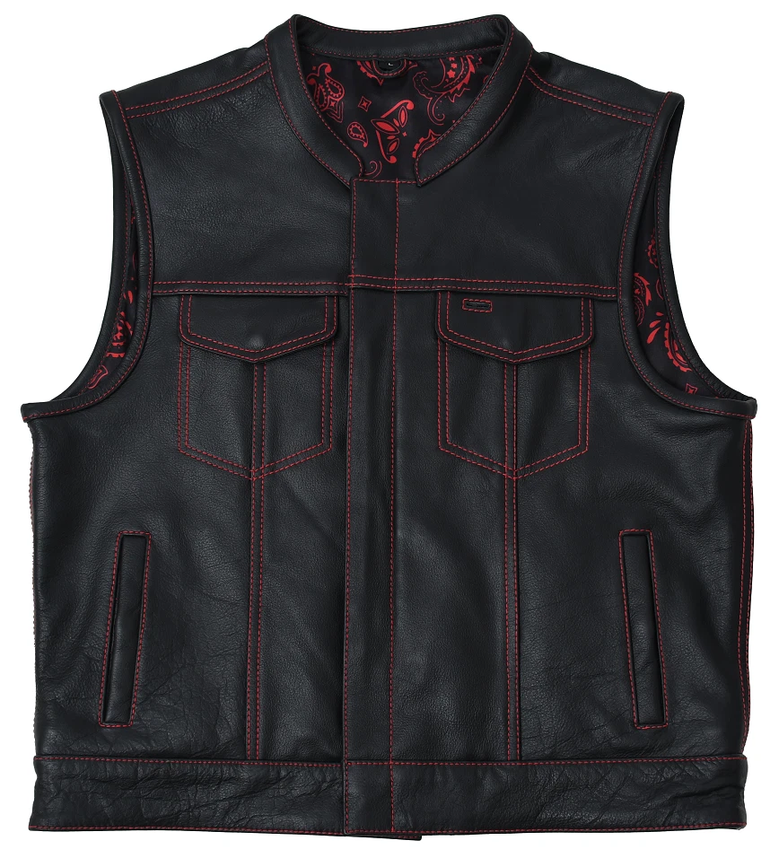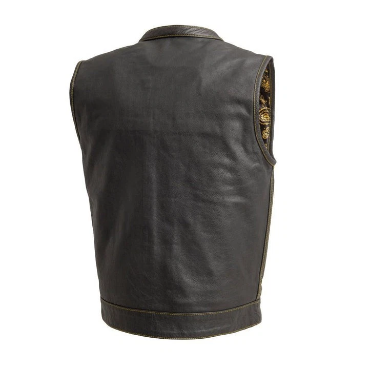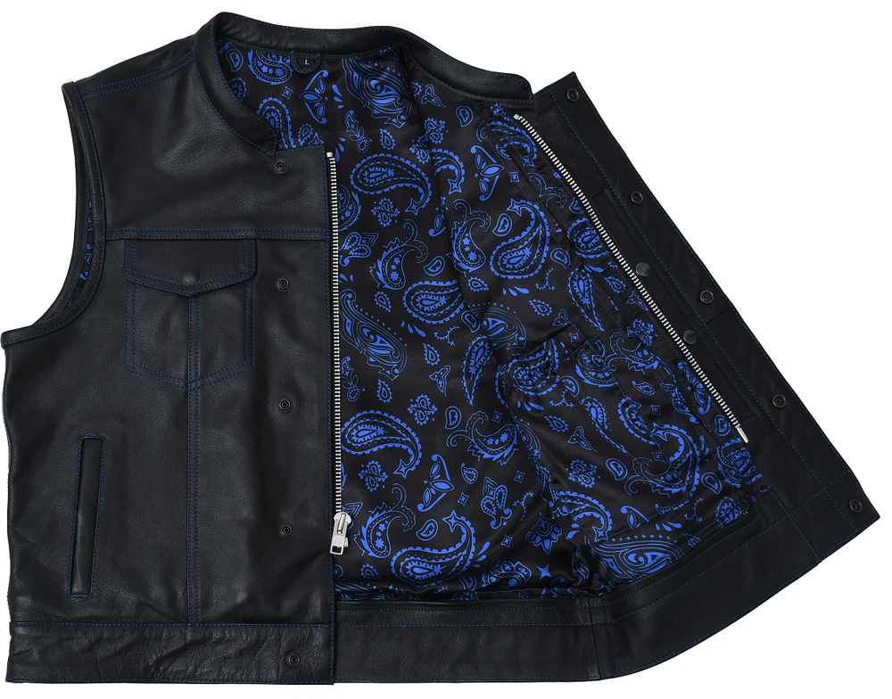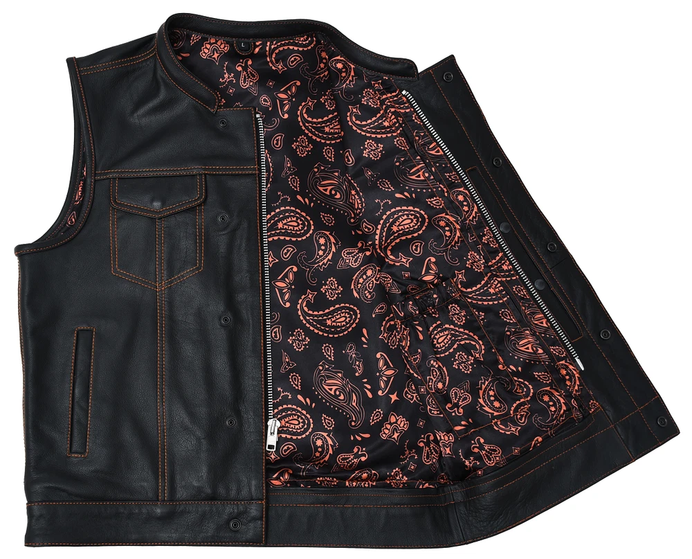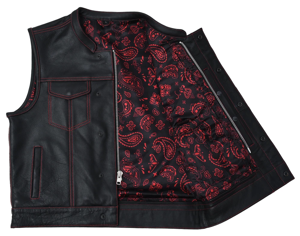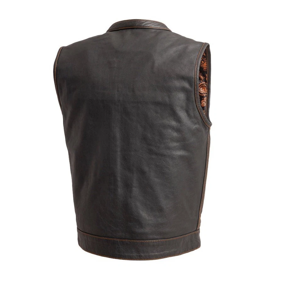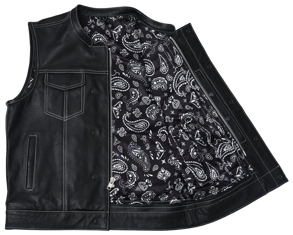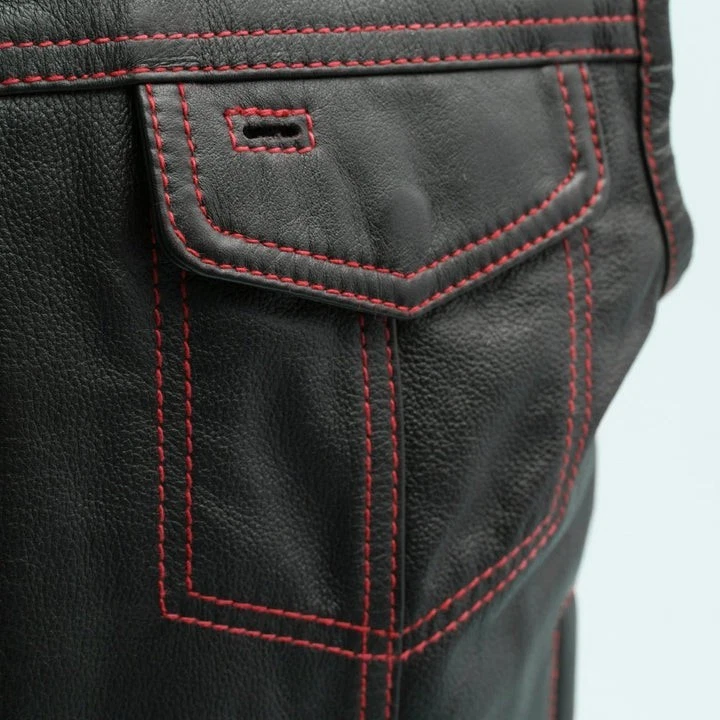 Leather club style vest, that fits just like standard club vests. It's got a one-inch collar, and cropped center zipper for comfort while sitting on the bike. A Satin lining keeps you comfortable, and also has an easy access zip so you can easily add patches or embroideries. And of course, it's got our conceal carry pockets! Features: Premium 1.1 mm Diamond Naked Cowhide Leather – Durable, supple, and built to last Club Style Design – Clean front with a one-inch collar , covered snaps , and a hidden cropped center zipper for a sleek, low-profile look Sharp contrast that enhances the vest’s overall aesthetics Functional Storage – Two snap-down chest pockets Two snap-down slash hand pockets One interior conceal carry pocket (right side) One quick-access conceal carry pocket (left side) One interior cellphone pocket (left side) Mesh Lining with Access Panels – Designed for easy patchwork or embroidery application Heavy-Duty YKK Zippers – Known for reliability and strength Perfect for Riders & Club Members – Combines classic styling with tactical functionality