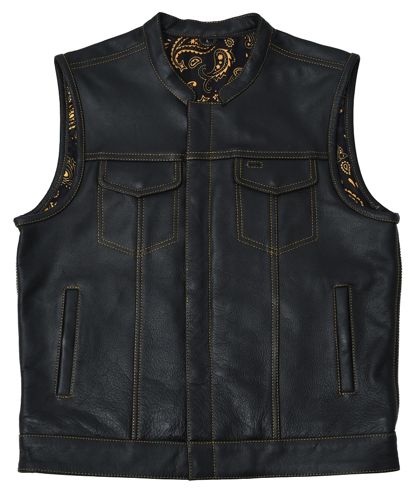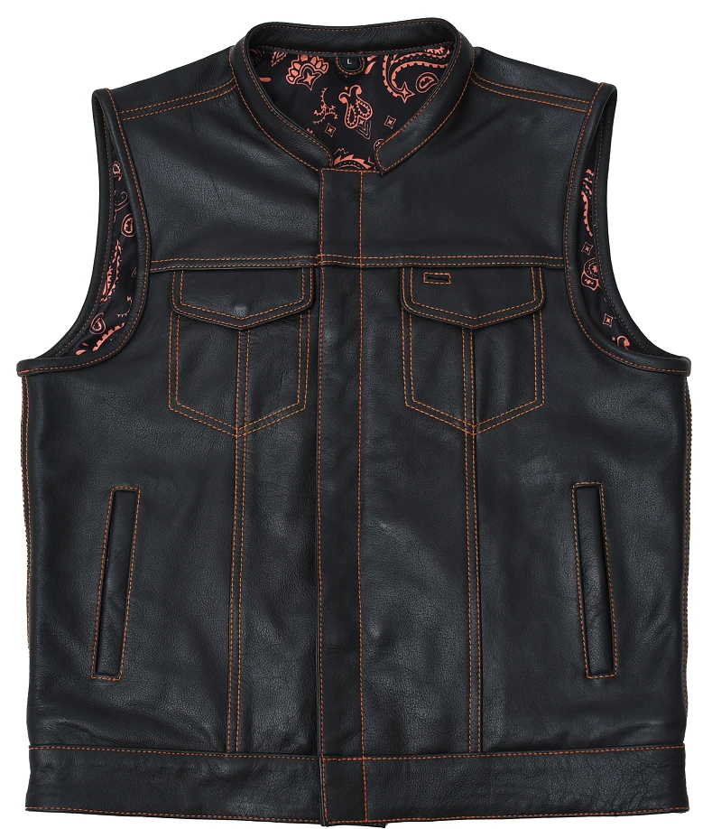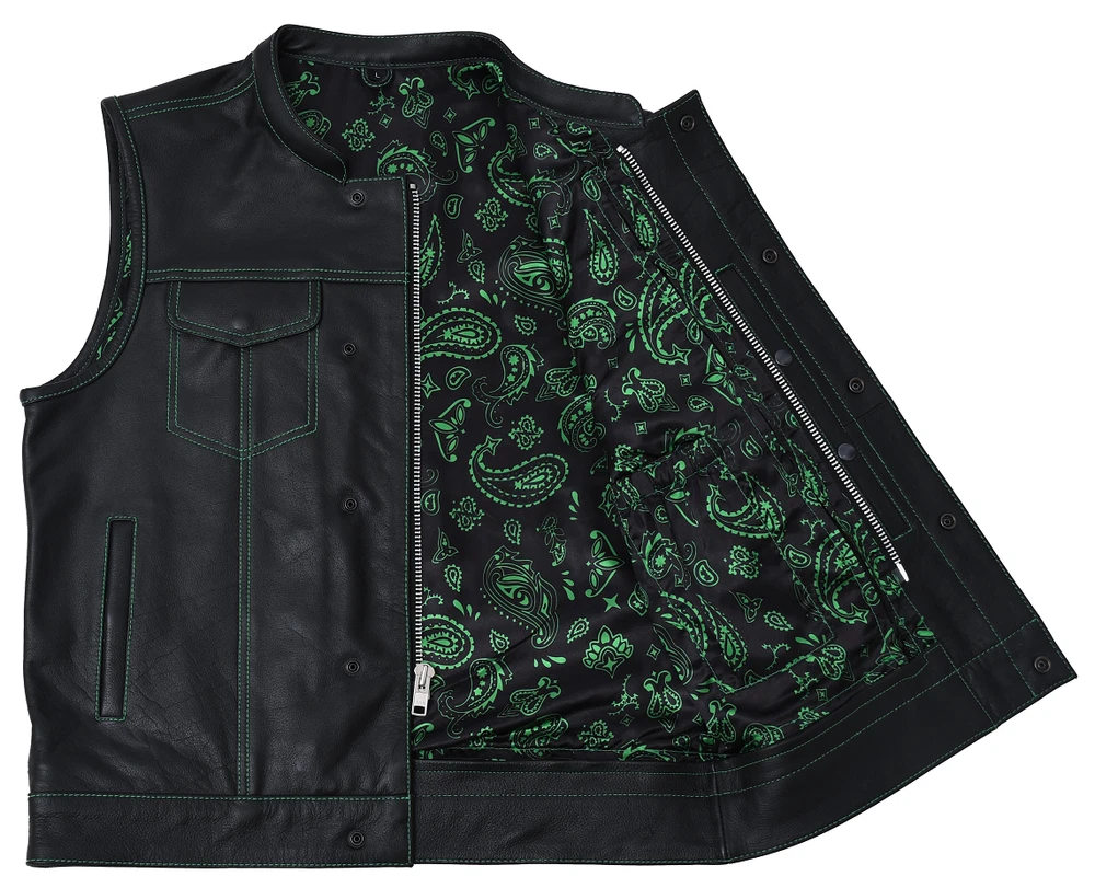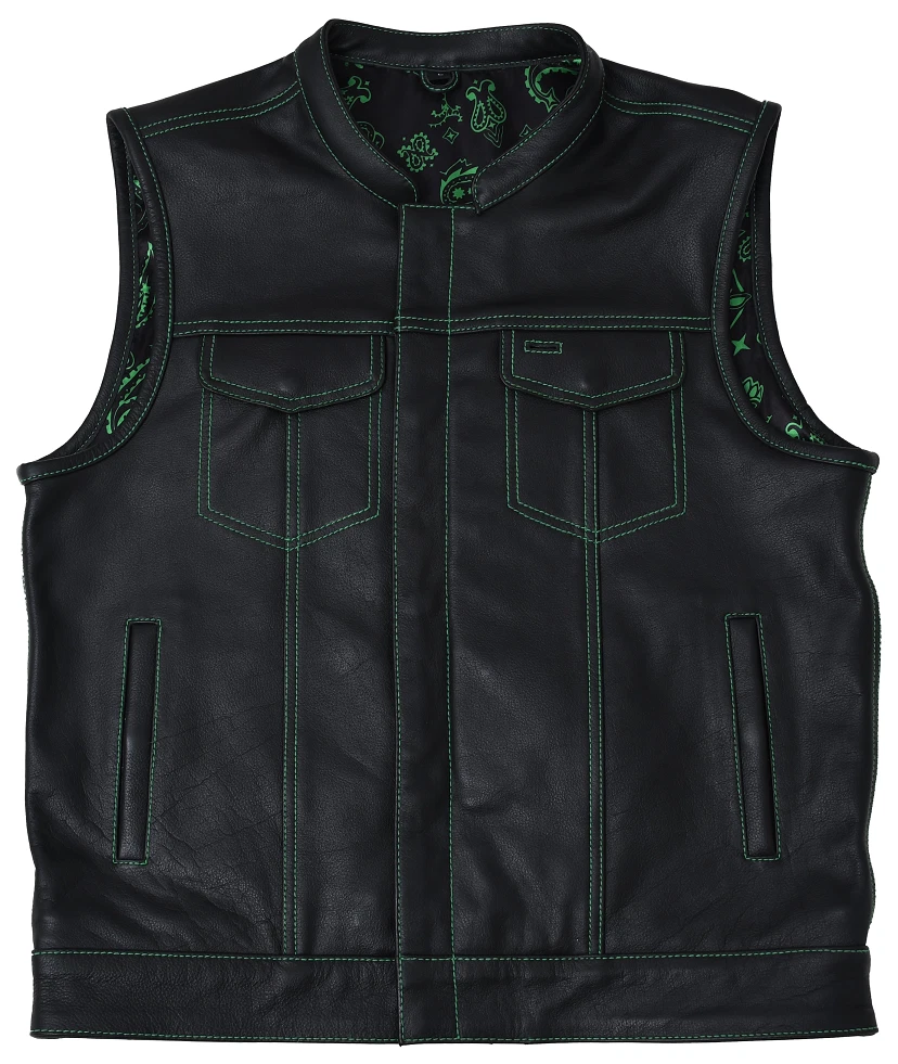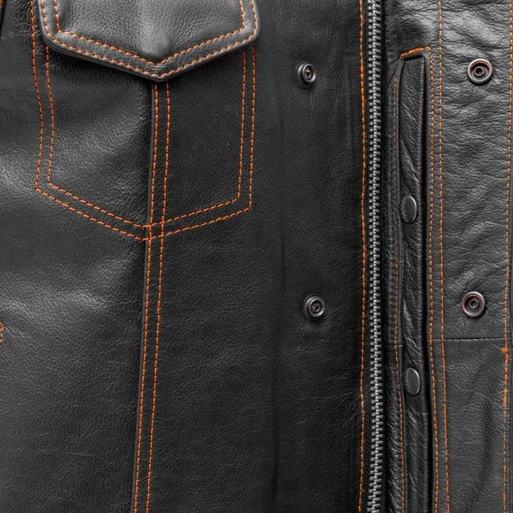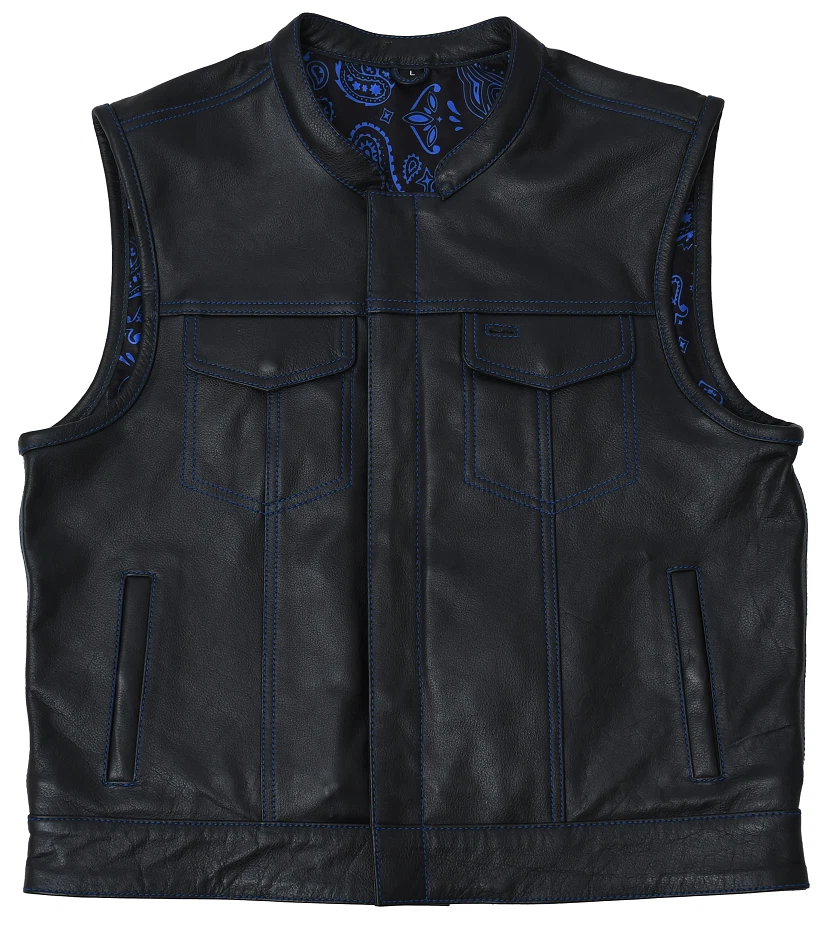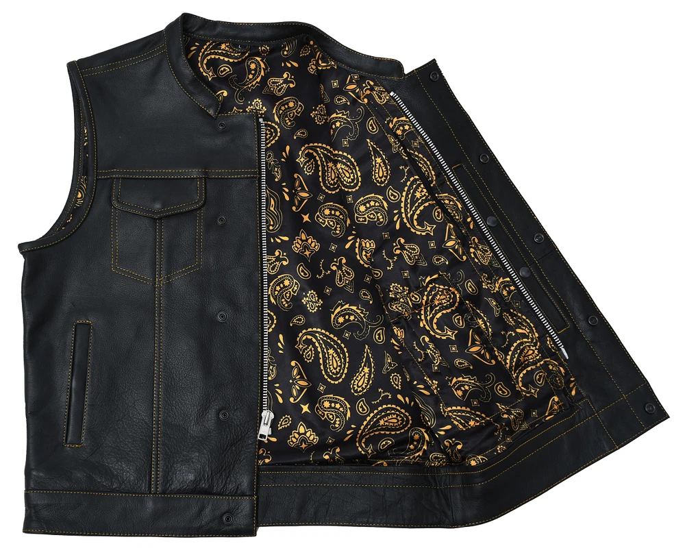 Leather club style vest, that fits just like standard club vests. It's got a one-inch collar, and cropped center zipper for comfort while sitting on the bike. A Satin lining keeps you comfortable, and also has an easy access zip so you can easily add patches or embroideries. And of course, it's got our conceal carry pockets! Features: Premium 1.1 mm Diamond Naked Cowhide Leather – Durable, supple, and built to last Club Style Design – Clean front with a one-inch collar , covered snaps , and a hidden cropped center zipper for a sleek, low-profile look Sharp contrast that enhances the vest’s overall aesthetics Functional Storage – Two snap-down chest pockets Two snap-down slash hand pockets One interior conceal carry pocket (right side) One quick-access conceal carry pocket (left side) One interior cellphone pocket (left side) Mesh Lining with Access Panels – Designed for easy patchwork or embroidery application Heavy-Duty YKK Zippers – Known for reliability and strength Perfect for Riders & Club Members – Combines classic styling with tactical functionality