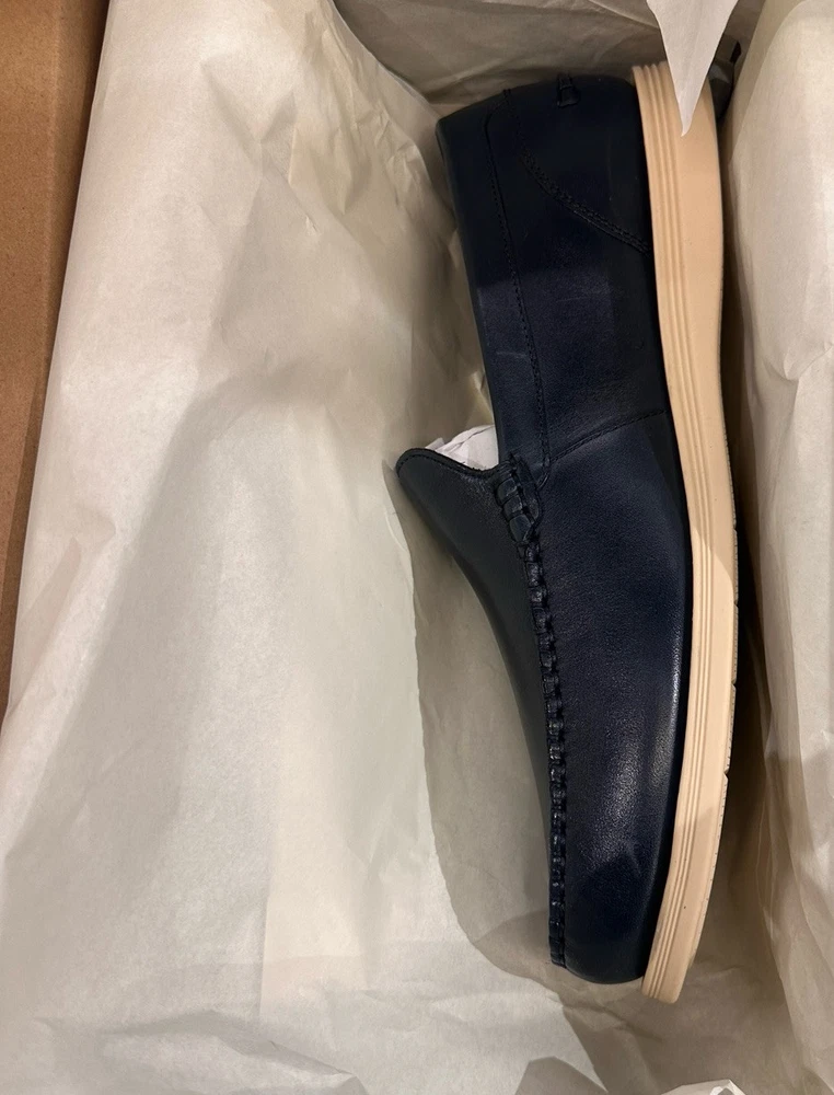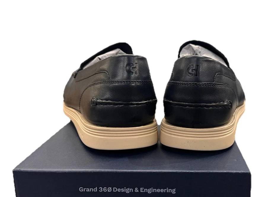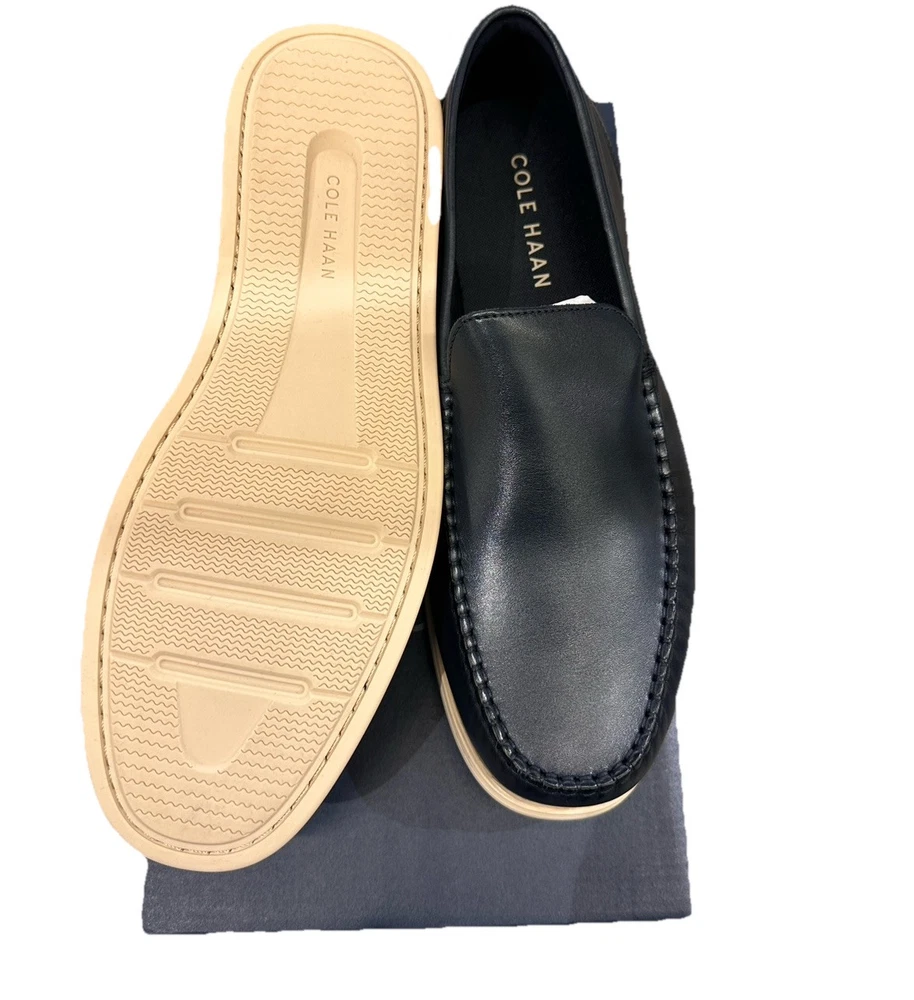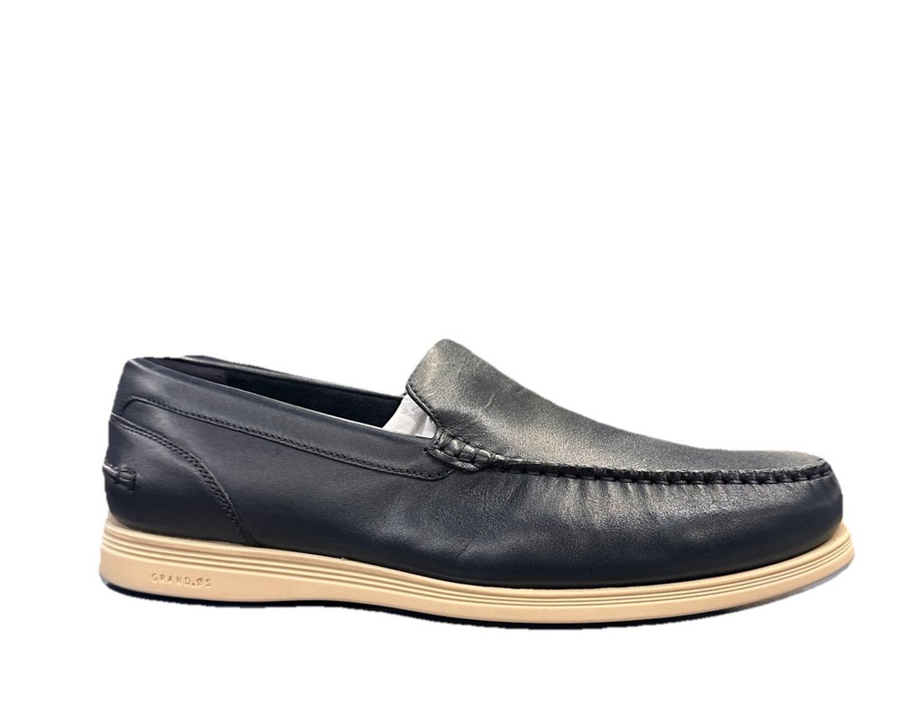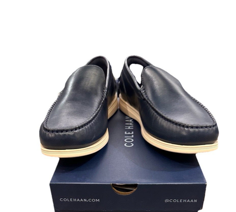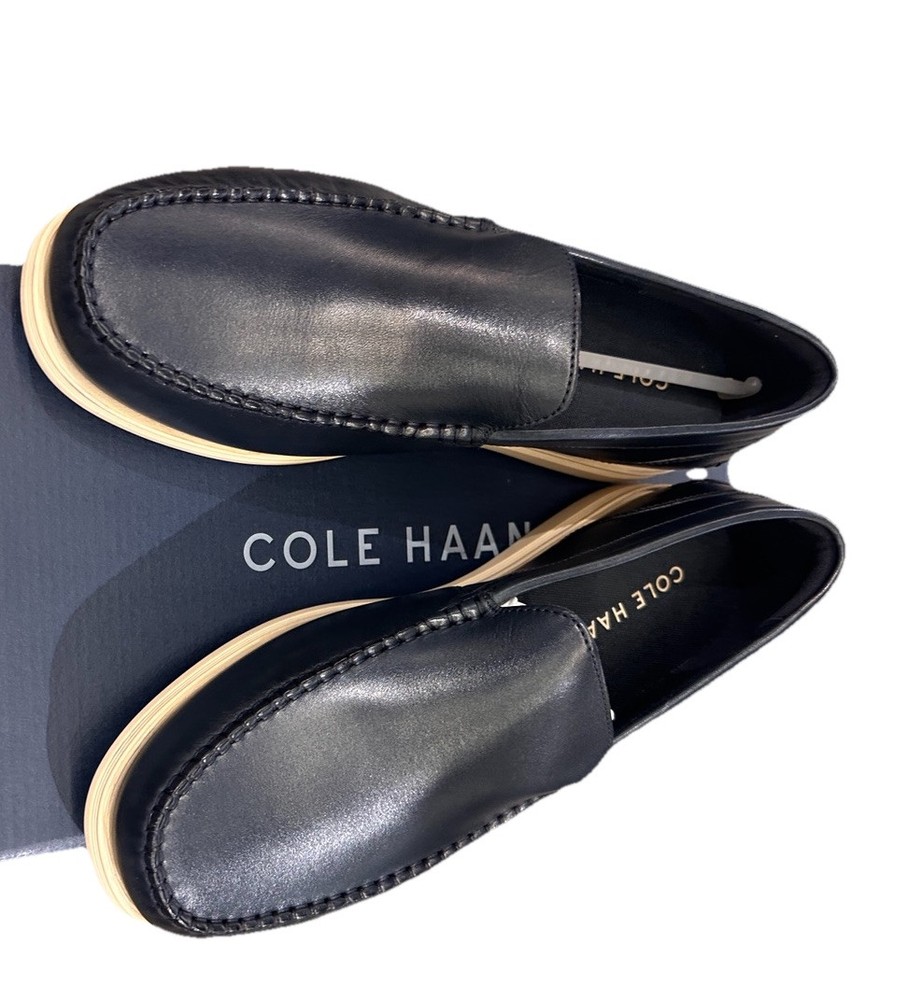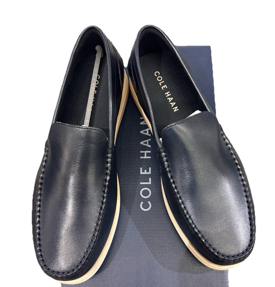 Men's Cole Haan Harwich Venetian loafers in a stylish navy blue and angora color combination. These slip-on dress shoes feature a solid pattern, round toe shape, leather upper and lining, with a lightweight and comfortable design. Ideal for going out in the city or a preppy look, these loafers have a cushioned insole, breathable outsole, and are suitable for all seasons.