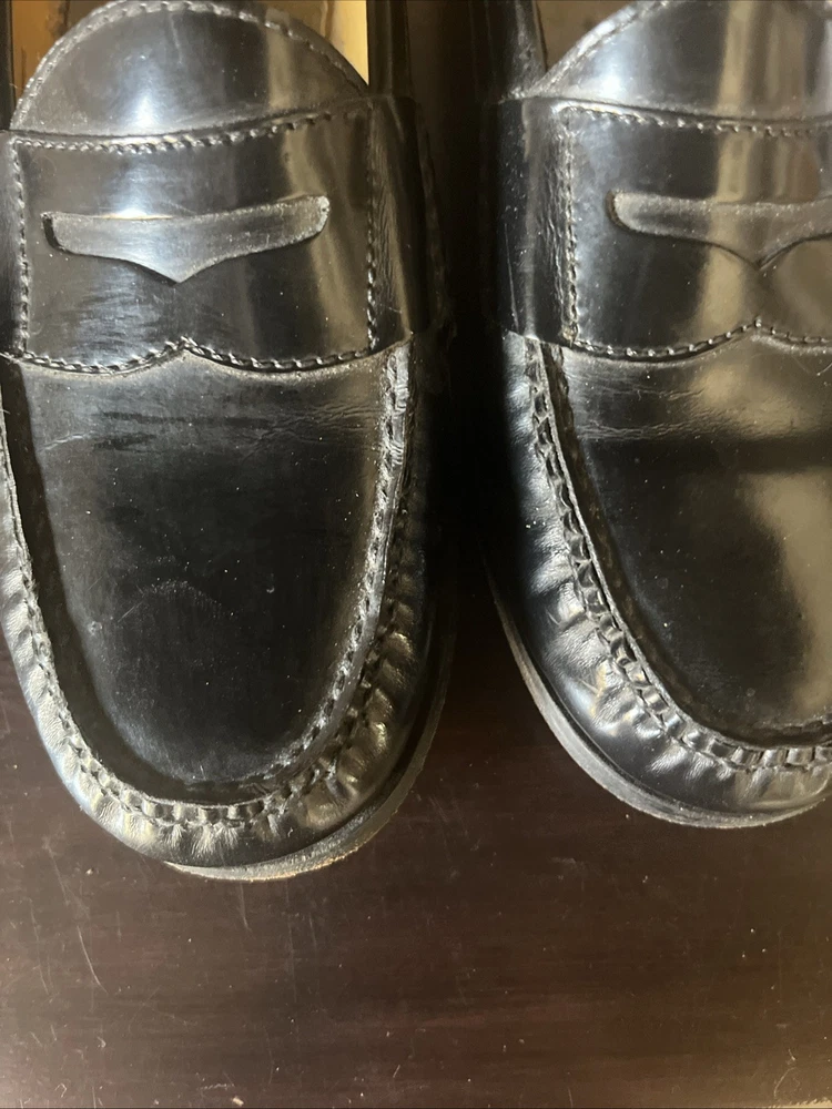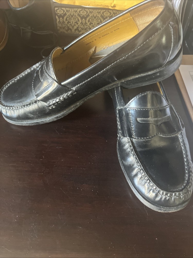 The product is a pair of Men’s Cole Haan Classic Black Penny Loafers in size 8D. These dress shoes are crafted from black leather with a D width and leather insole. The outsole is also leather, making them durable and stylish for any formal occasion. These loafers are part of the Cole Haan Pinch product line, combining classic design with modern comfort and quality. Ideal for those looking for a sophisticated and timeless addition to their wardrobe. These insoles were removed to accommodate orthotics. Otherwise they are in mint condition. If you utilize orthotics, these will be the perfect pair for you. Priced to sell!