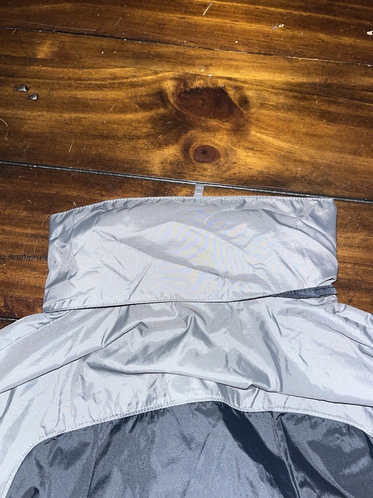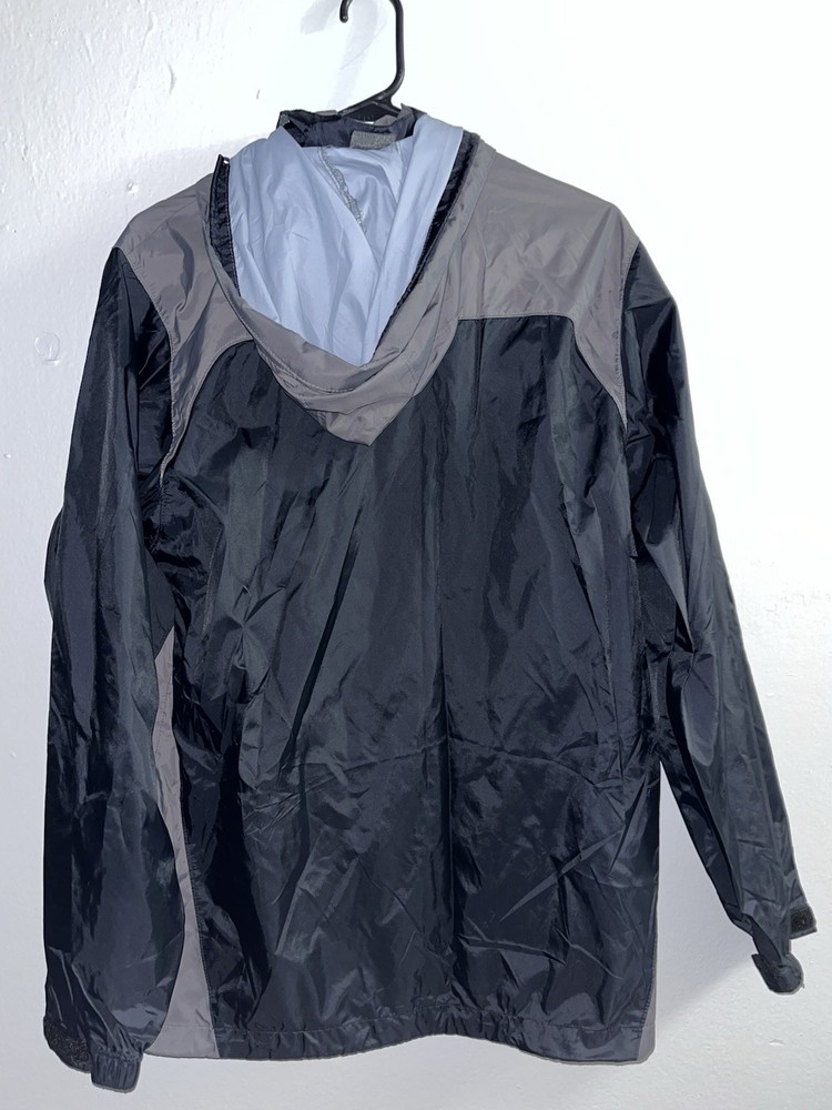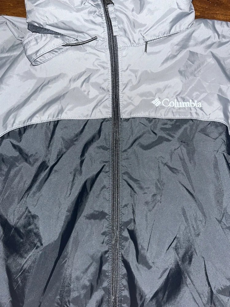 This men's Columbia black gray hooded windbreaker jacket features a mid-length design with a softshell nylon outer layer and zip closure. It has an embroidered Columbia logo on the front, making it a stylish choice for travel, casual wear, or work. This jacket is perfect for outdoor activities during the winter, fall, or spring seasons, and includes zipped pockets for added convenience. Made with polyester insulation, this classic jacket from the Columbia Omni-Shield line is machine washable and designed for various sports and fitness activities.