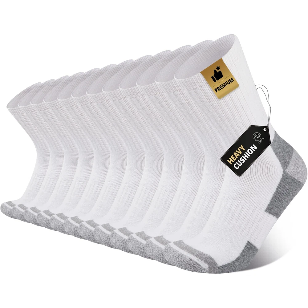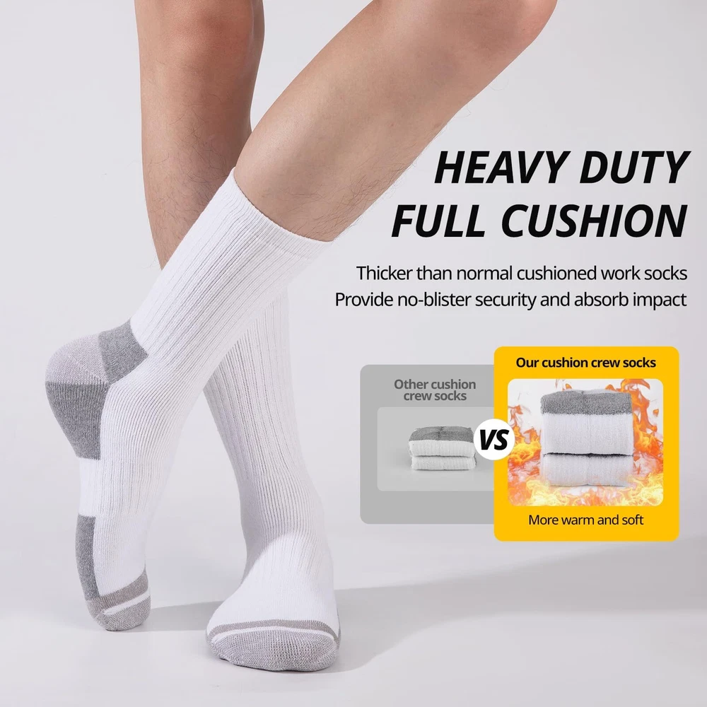 [COMFORT COTTON CREW SOCKS]: Our mens crew socks use soft recycled cotton to absorb sweat and keep feet dry during work, running and sports. These crew socks for men with polyester and spandex knitting to provide durability and retain mens socks shape even after repeated washings. Our mens athletic socks fit US men's shoe size 6-12, mens socks size 10-13. [FULL CUSHION MENS WORK SOCKS]: These mens socks crew designed with heavy cushion for ultimate support in any work boot or athletic shoe. Socks for men add thick moisture wicking cushion to provide extra comfort, reduce friction and prevent blisters. These boot socks for men suitable for heavy duty work or daily activities. [DURABLE CREW WORK SOCKS]: Our men's crew socks have reinforced toe and heel to enhance work socks durability in high stress areas and increase the life of socks. These cotton crew socks for men suitable for all seasons. Work socks for steel toe boots is a great present for men. [GREAT ELASTICITY-ARCH SUPPORT]: These athletic crew socks men with elastic rubber bands in the leg and feet arch areas to make crew socks fit and comfortably against your calf. [BEST CUSTOMER SERVICE]: There are white crew socks, black crew socks and grey crew socks. Please buy our mens socks confidently! If you have any questions, please contact us. We will respond within 24 hours and solve your problem.