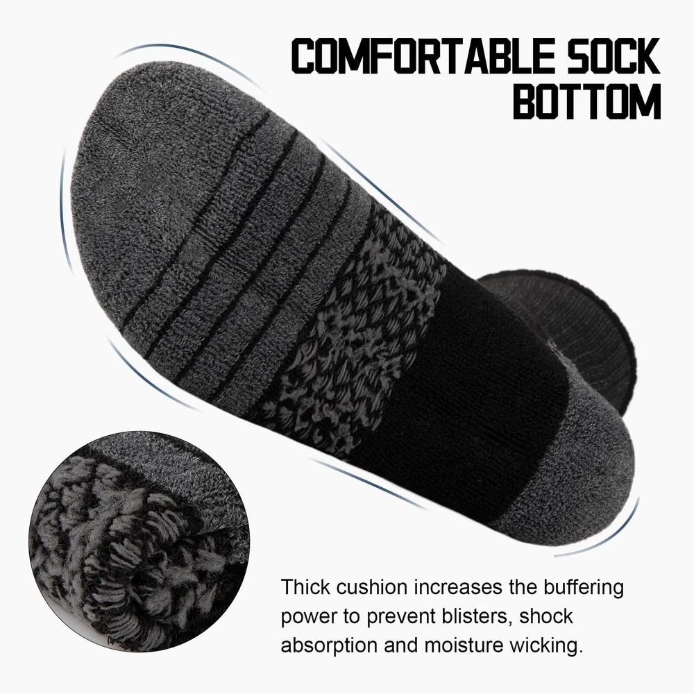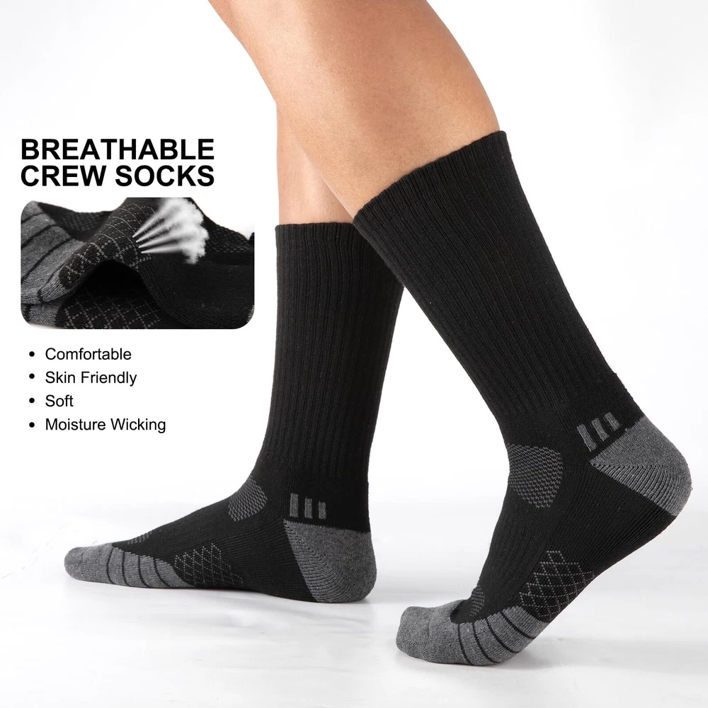 [Moisture Wicking & Comfortable]:The crew socks for men are made of 95% polyester and 5% spandex. These mens crew socks are designed with breathable mesh to quickly wick away moisture and keep feet dry.Suit for US Mens Shoe Size 6-12(Mens Sock Size 10-13). [Thick Cushion Athletic Socks]:These mens socks crew designed with heavy cushion,which provides good cushioning and shock absorption when you are walking, running or doing other sports. It can reduce the pressure on the feet, reduce the impact of sports on the joints and bones of the feet, and protect the health of the feet. [Durable Reinforced Design]:Reinforced toe and heel design increases the abrasion resistance and longevity of the mens socks, providing you with a more reliable wearing experience.men's crew socks are designed for durability to ensure they stand up to the rigors of everyday wear and outdoor activities. [Great Elasticity-Arch Support]: The elasticized cuff fits snugly around the leg, preventing the athletic crew socks men from slipping off without putting pressure on the leg.Arch support reduces fatigue and discomfort during prolonged wear, providing good protection and support for your feet. [Best Customer Service]:There are white crew socks, black crew socks and grey crew socks.Each package contains 6 pairs of mens socks.If you have any problem about our work socks, please contact us! We will solve your problem as soon as possible till your satisfaction.
