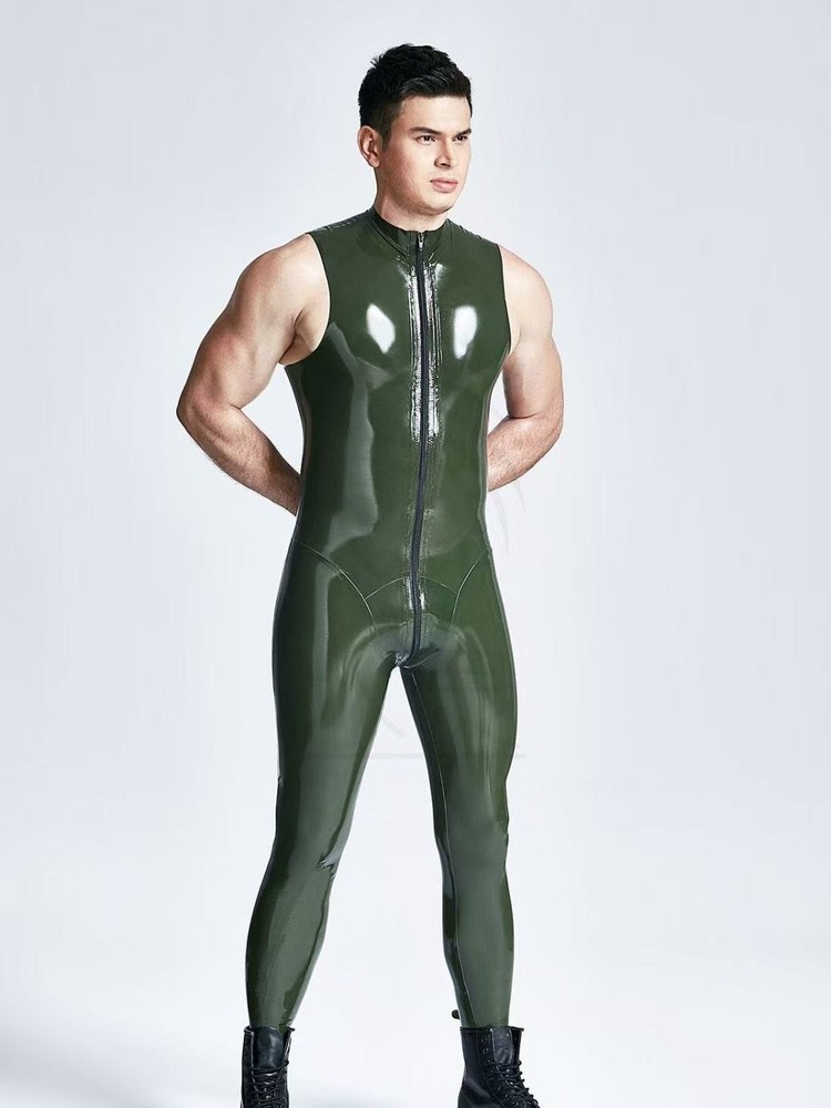 Mens Dark Green sleeveless latex catsuit with Front zipper for Fetish Clubwear