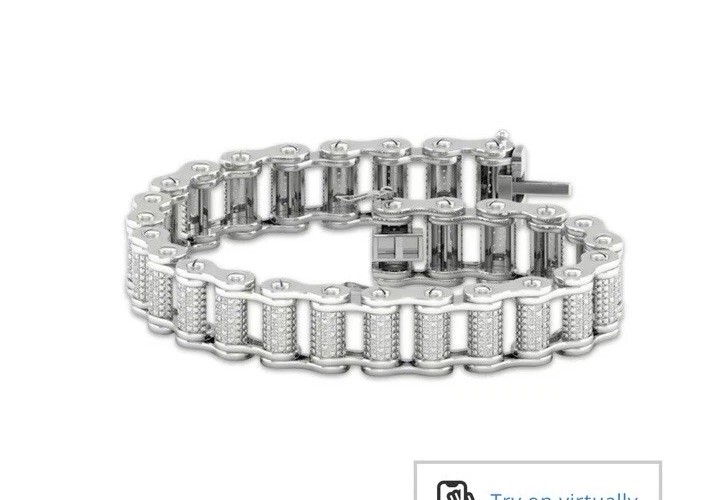 Why We Love It A unique choice, this bicycle chain bracelet is sure to grab attention in the best way. Sterling silver Swivel links are adorned in round-cut diamonds Total diamond weight is 1 carat 8.5 inches with box clasp Details Item #: 112078100 Stone(s) icon Stone(s) Stone(s) Specs Total Weight (CT. T.W.):1 Color:I Clarity:I3 Lifetime Diamond Commitment:Yes Stone Type:Diamond Stone Color:White Stone Shape:Round Stone Carat Range:1 Ctw - Under 3 Ctw Stone Class:Natural Stone Setting:Prong Metal(s) icon Metal(s) Metal(s) Specs Metal Type:Sterling Silver Metal Color:White Bracelet Design icon Bracelet Design Bracelet Design Specs Bracelet Style:Fashion Bracelet Length:8.5 Bracelet Clasp Type:Box Product Details icon Product Details Product Details Specs Length:8.5 in Clasp Type:Box