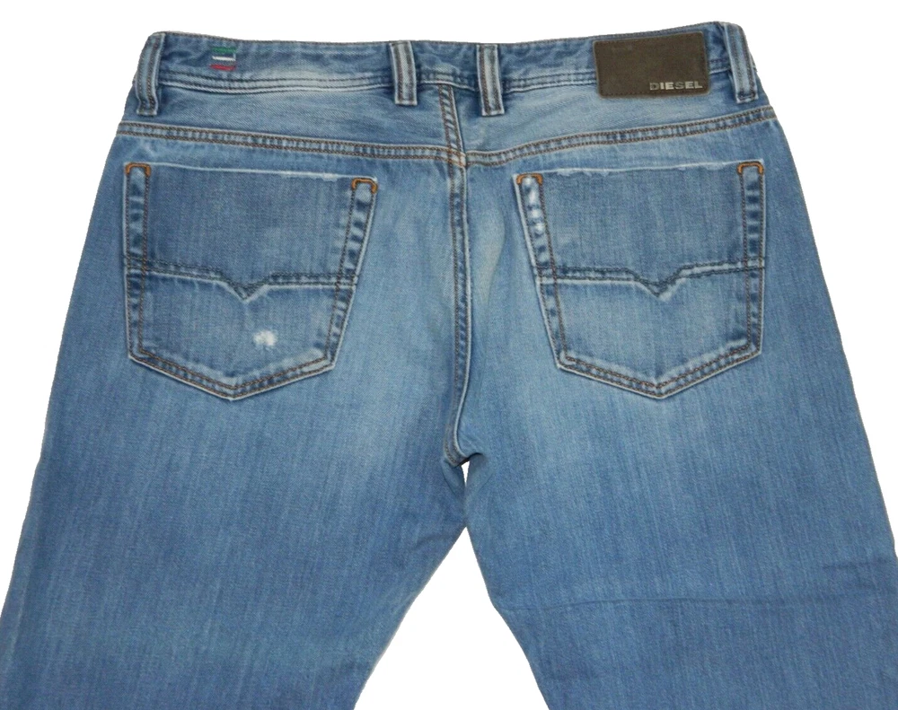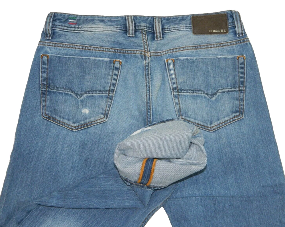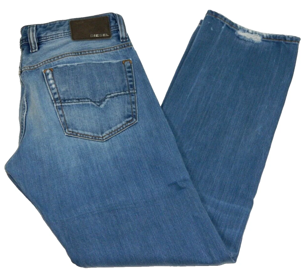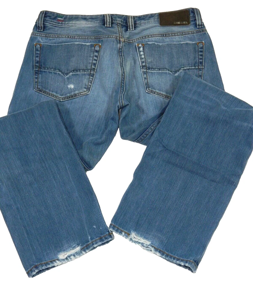 Destroyed pair of Diesel Brand Viker Slim Straight Button Fly Premium Denim Blue Jeans. Tag Size: W34 L32. Not quite this size now. Measured in inches: Waist: 16, Inseam: 31, Front Rise: 9.5, Leg Opening: 8.5. Worn below the waist. 100% Cotton. BWO3