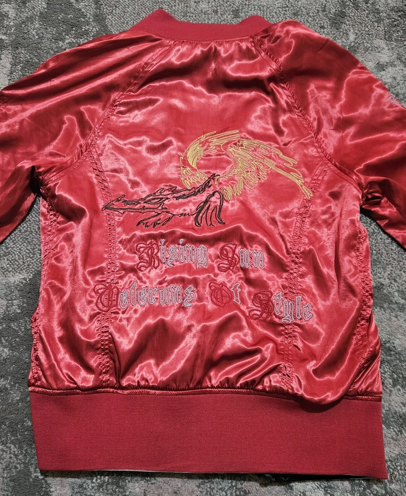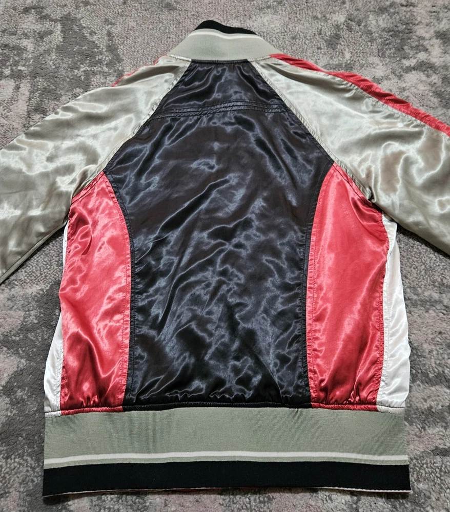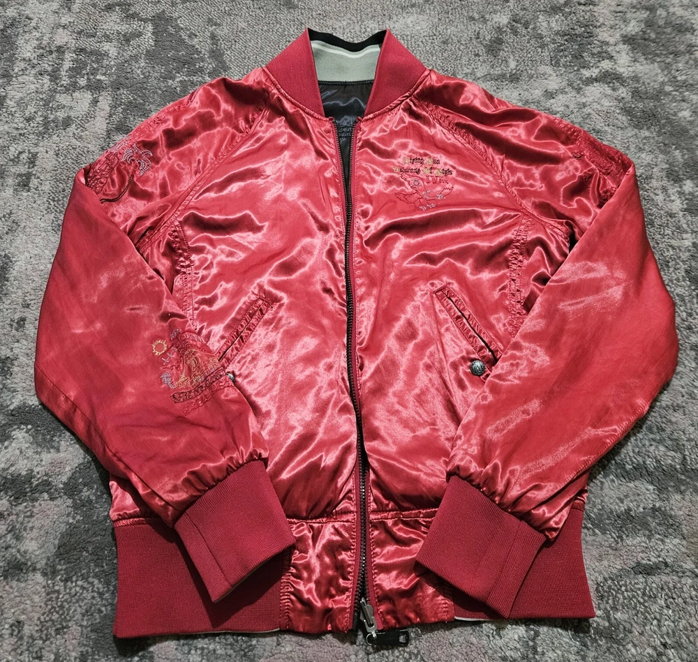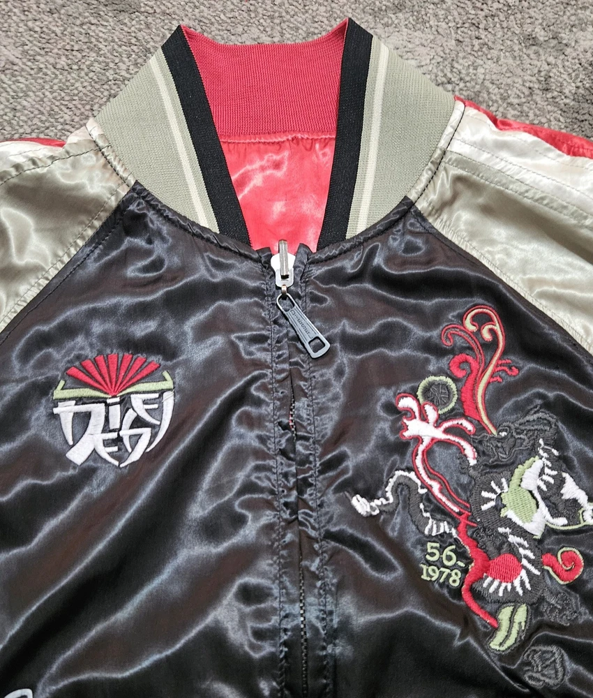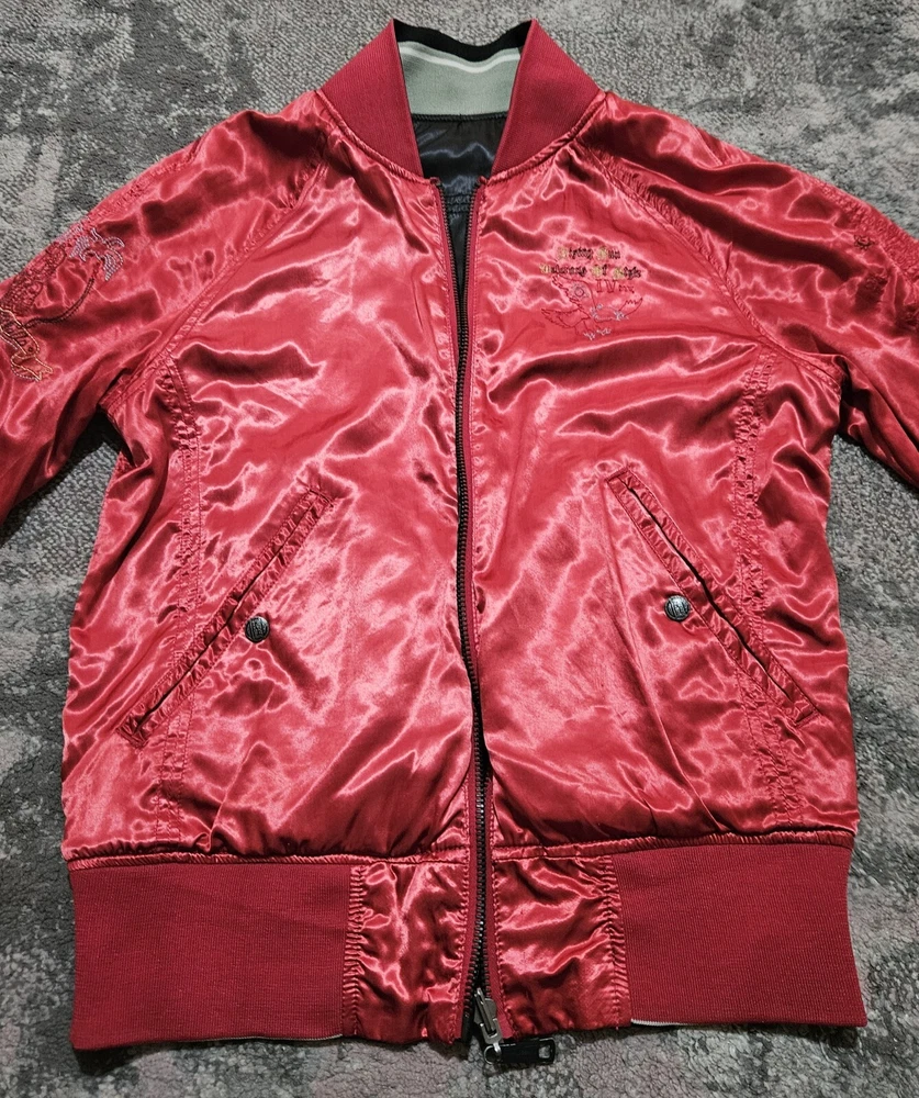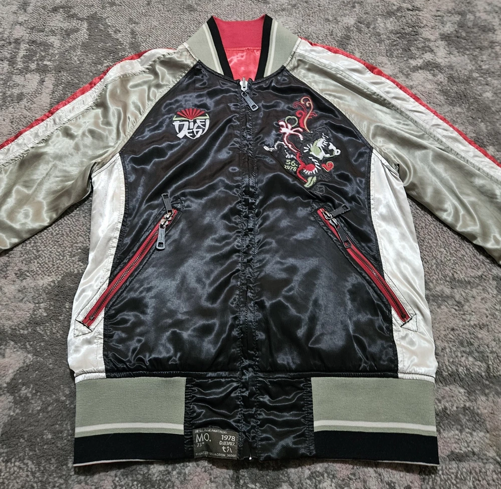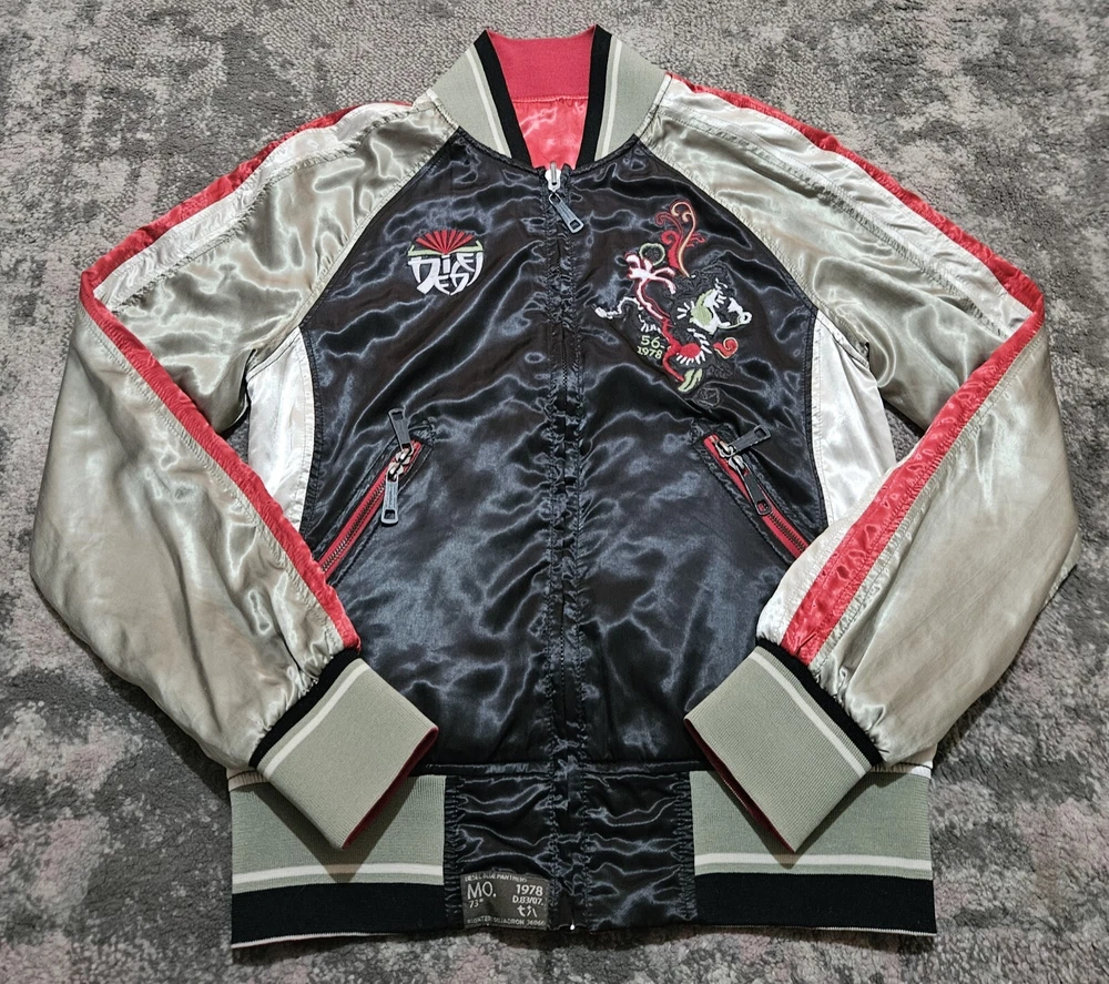 Men’s Diesel Reversible Satin Embossed Jacket Vintage Black Green Red Medium Great Condition Please refer to pics for approx measurements if required before purchasing