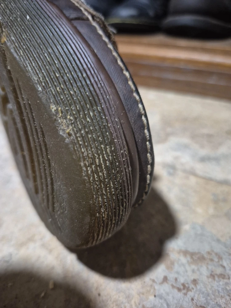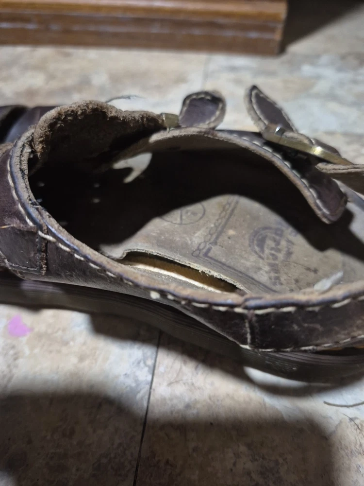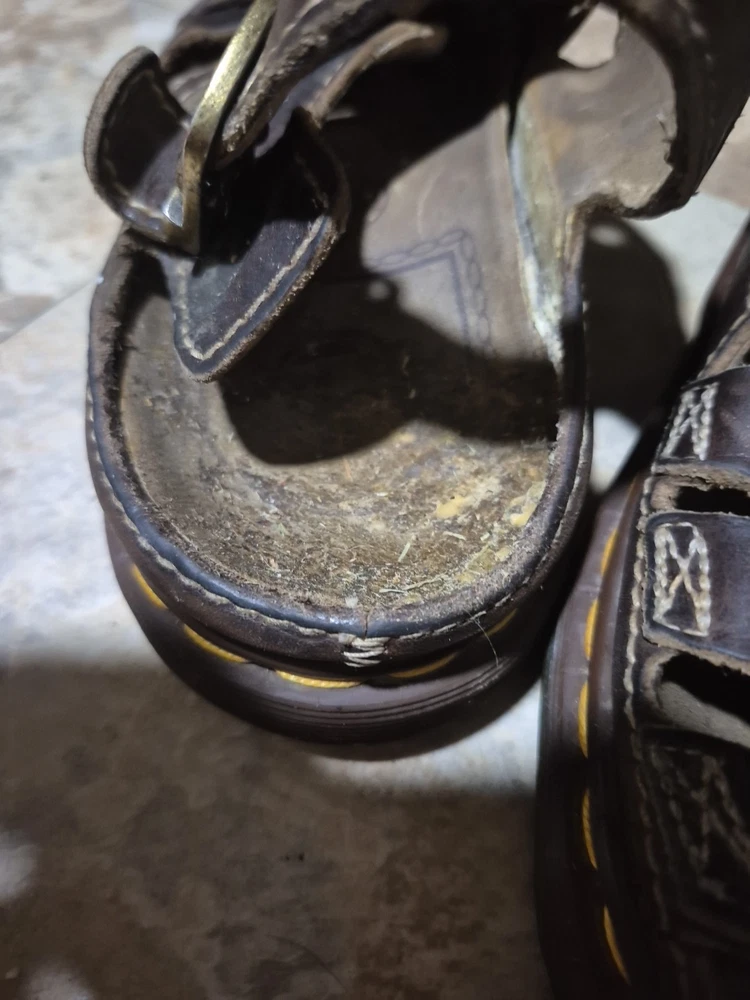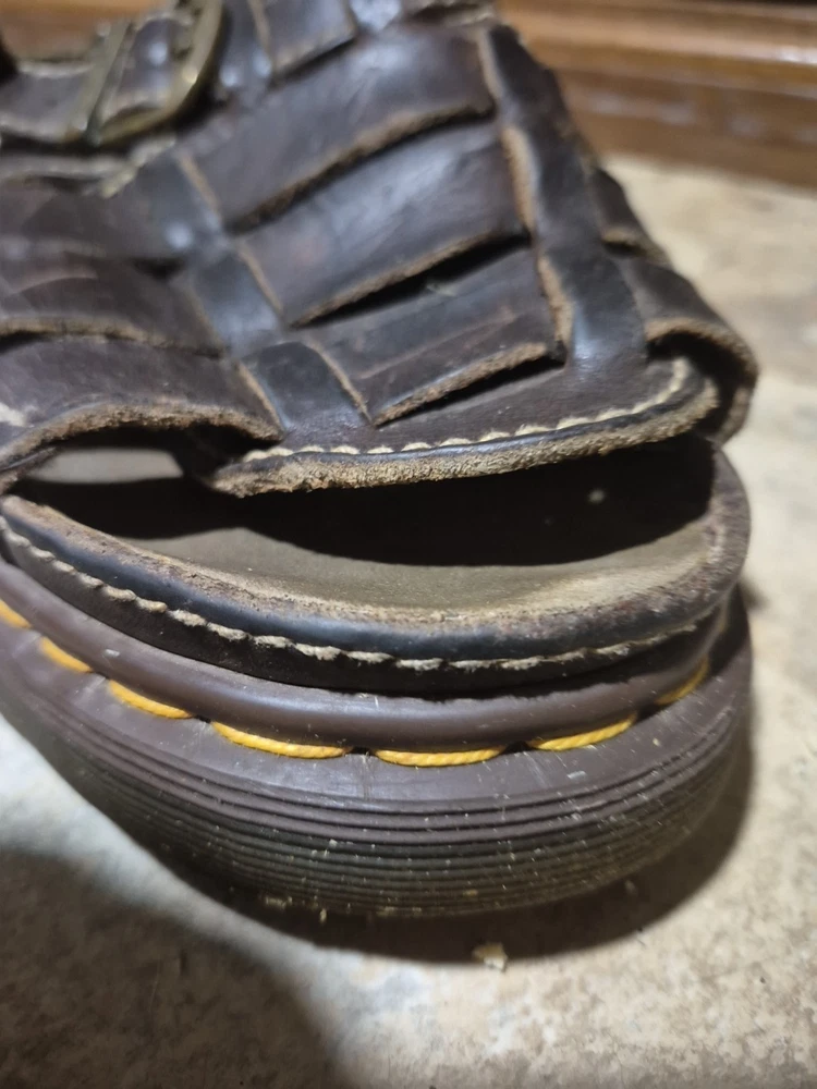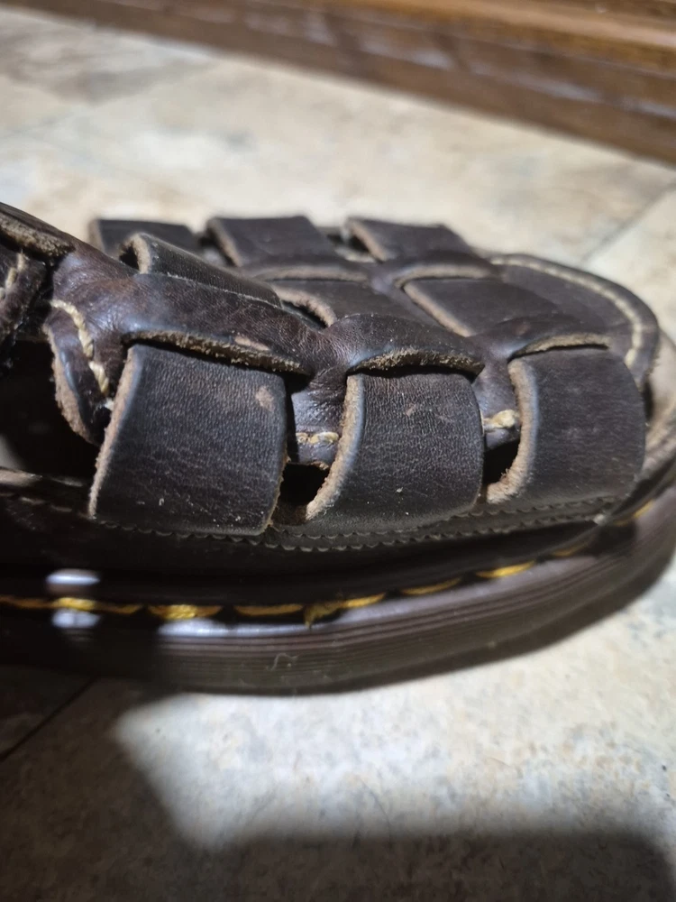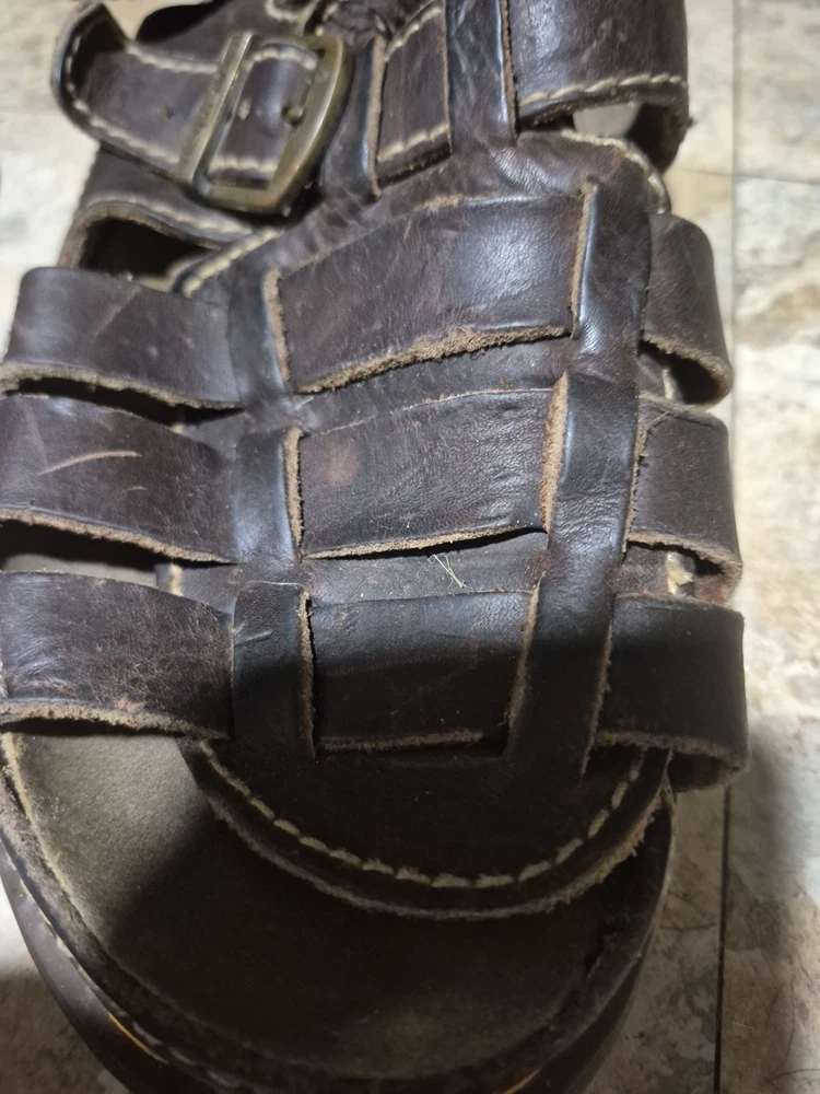 The product is a pair of Doc Dr. Martens Men's Sandals in brown leather, made in England and in size 10. These sandals feature a solid pattern, fisherman character, and a slip-on style with a adjustable buckle closure. The outsole is synthetic, and they are designed for casual occasions with a retro 90s outdoor theme. Made by the iconic brand Dr. Martens, these sandals showcase their signature logo accents and offer durability and style for the modern man.