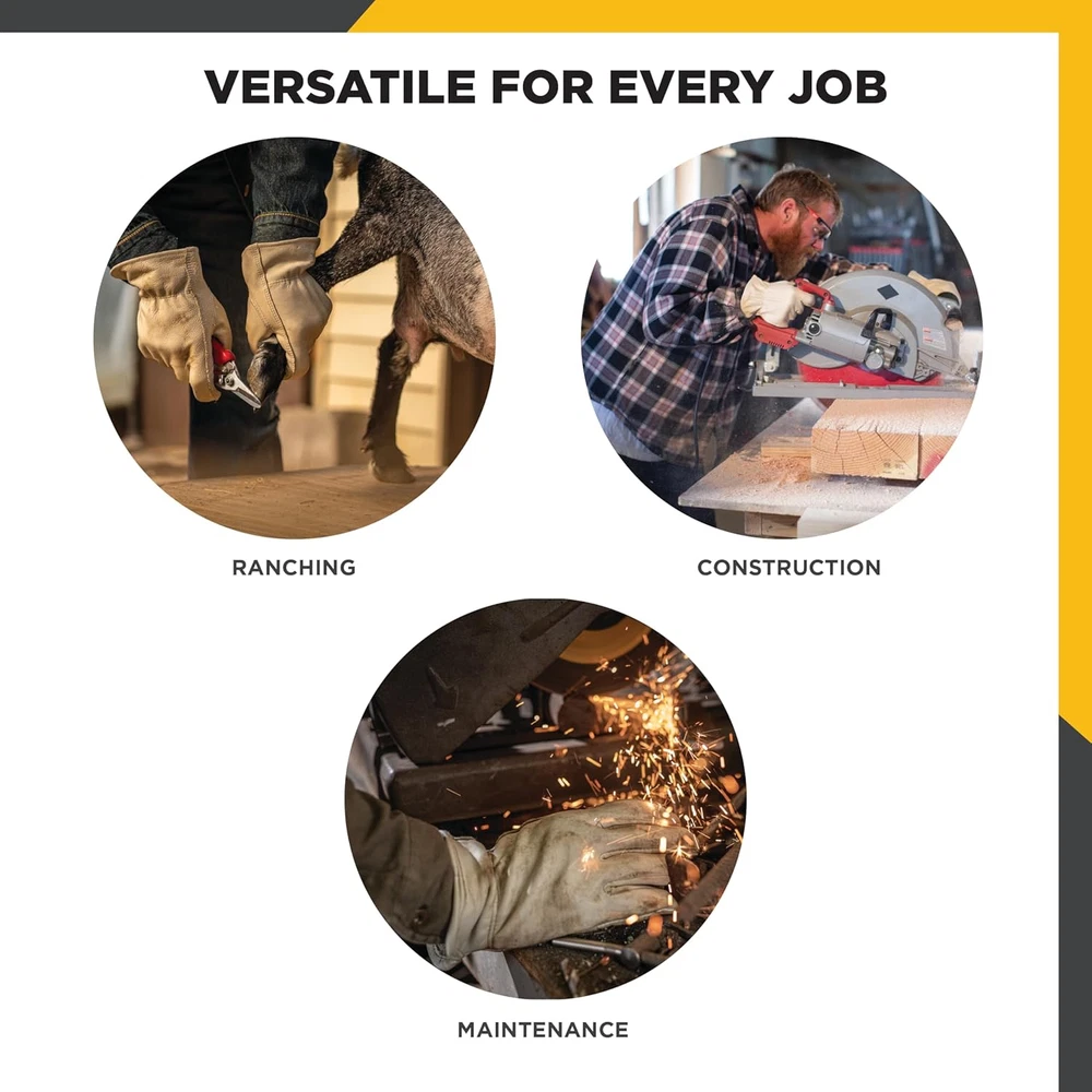 100% GRAIN COWHIDE LEATHER: Superior abrasion and puncture resistance, ensuring long-lasting durability for tough tasks REINFORCED PALM: Added leather palm patch increases grip, wear resistance, and overall glove longevity SECURE ELASTIC WRIST: Keeps gloves securely in place while blocking out dirt, debris, and other elements VERSATILE USAGE: Ideal for construction, yardwork, farming, ranching, motorcycle riding, and general maintenance tasks ERGONOMIC DESIGN: Keystone thumb and reinforced stitching provide enhanced comfort, dexterity, and durability Product Description The Wells Lemont 1130L Grain Cowhide Leather Work Gloves with Reinforced Suede Palm Patch are perfect for your everyday yard work. Made of cowhide leather, these gloves are built to last. Get great protection and flexibility for your hands while working. The palms of the gloves have high-quality reinforced suede for better protection for your hand, gripping, and abrasion resistance. The keystone thumb allows you better comfort and maximum flexibility when working on your projects. The gloves are leather bound to avoid rips or tears in the gloves for longer lasting life and durability. Having a double-shirred wrist allows you to keep a snug fit on your hand while keeping dirt out. Whatever your project may be, gardening, landscaping, or handling tough projects, these Wells Lamont Grain Cowhide Leather Work Gloves with Reinforced Suede Palm Patch will help you get the job done. Wells Lamont - Stubborn about Quality since 1907. From the Manufacturer This men's glove is has palomino grain cowhide leather. It has a straight thumb, thumb shield, bound hem and is gunn cut. The shirred wrist makes the glove easier to take on and off. Large men's.