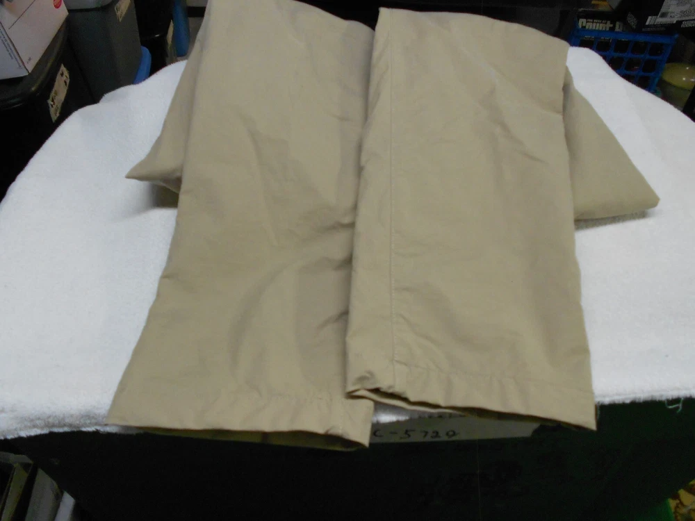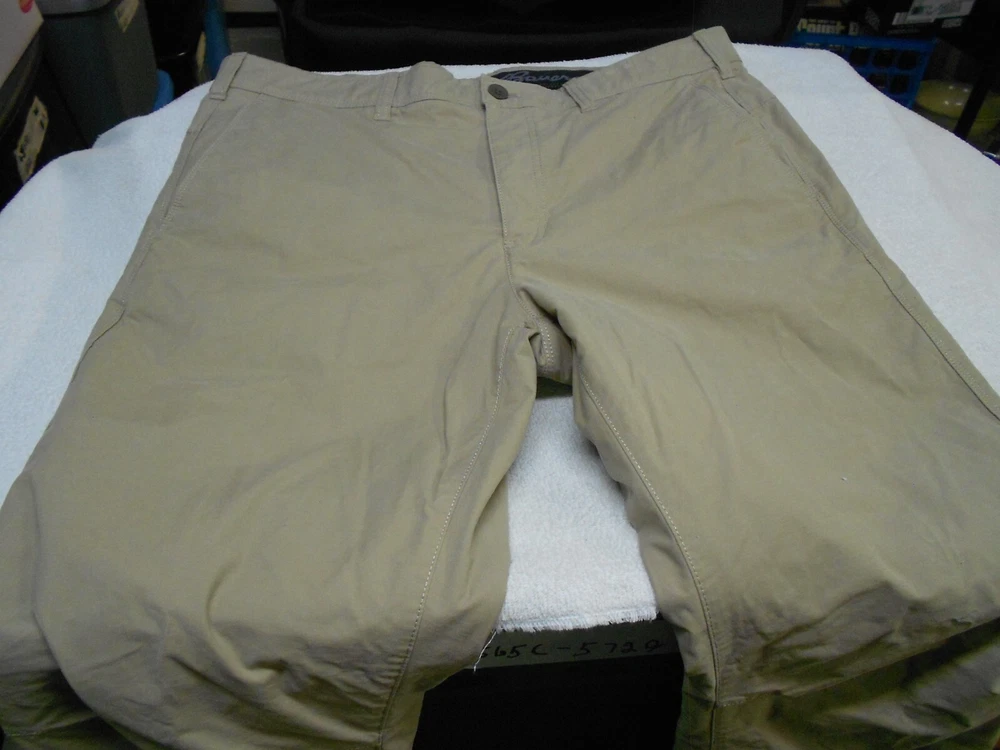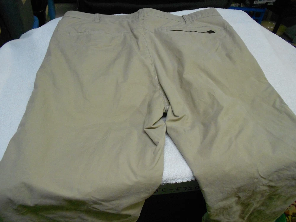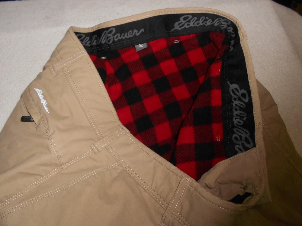 Quantity of 1 pair of men's EDDIE BAUER TAN CHINO KHAKIS 4 Pockets STRETCH 1 BUTTON WAIST 7 BELT LOOPS FLEECE LINED SHELL 67 percent cotton - 28 percent nylon - 5 percent spandex LINING 100 percent polyester Marked Size 36 x 34 Actual measurements are 36 x 34 with an 8 1/4 inch leg opening . EXCELLENT condition with no defects and hardly any wear N O RESERVE PANTS PICTURED ARE ACTUAL ONES FOR SALE. ALL USED PANTS ARE LAUNDERED PRIOR TO LISTING L118241411 561U221109