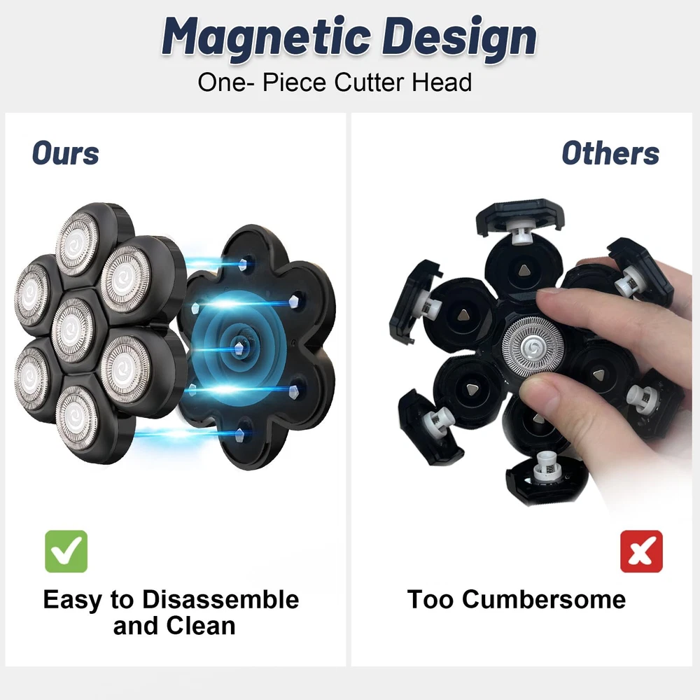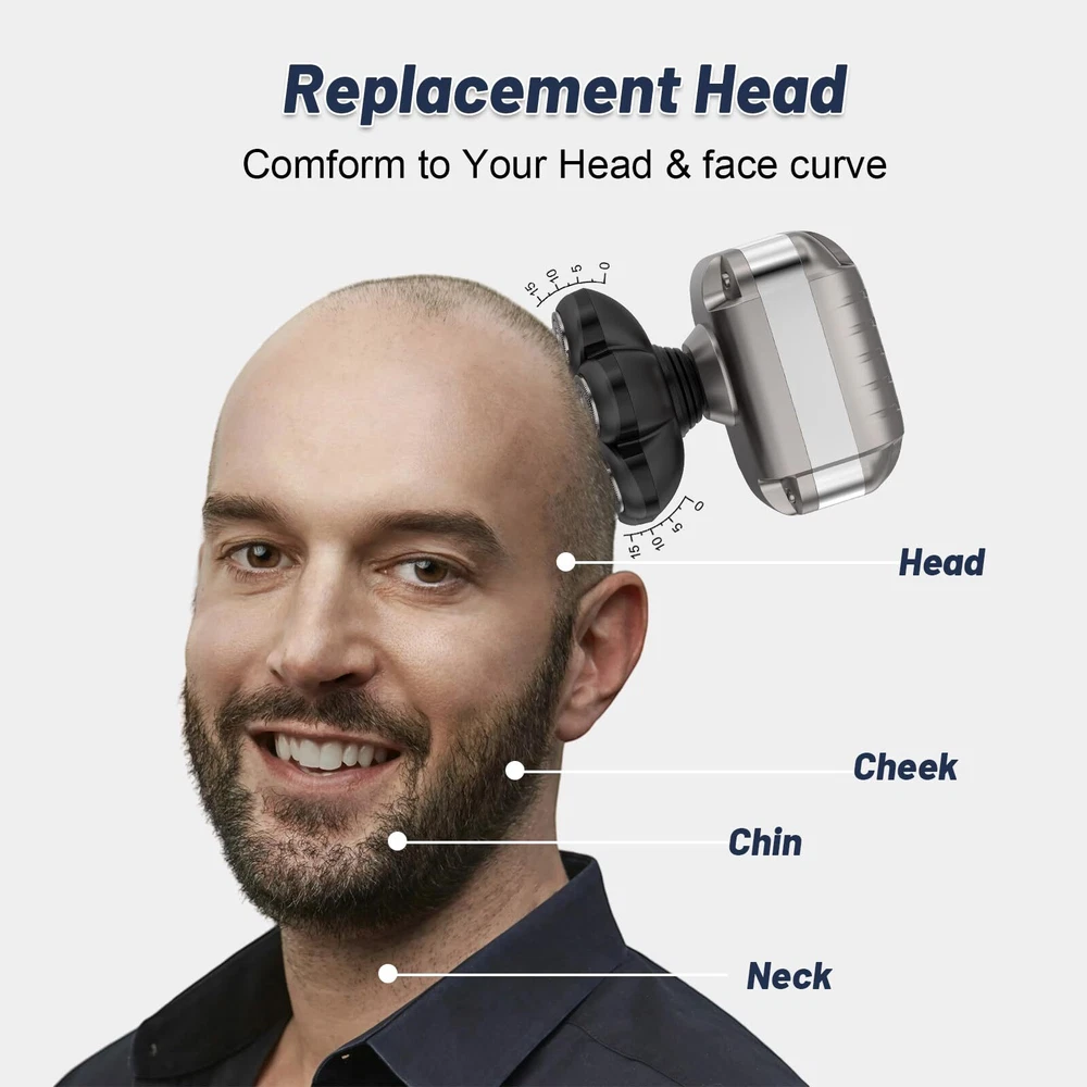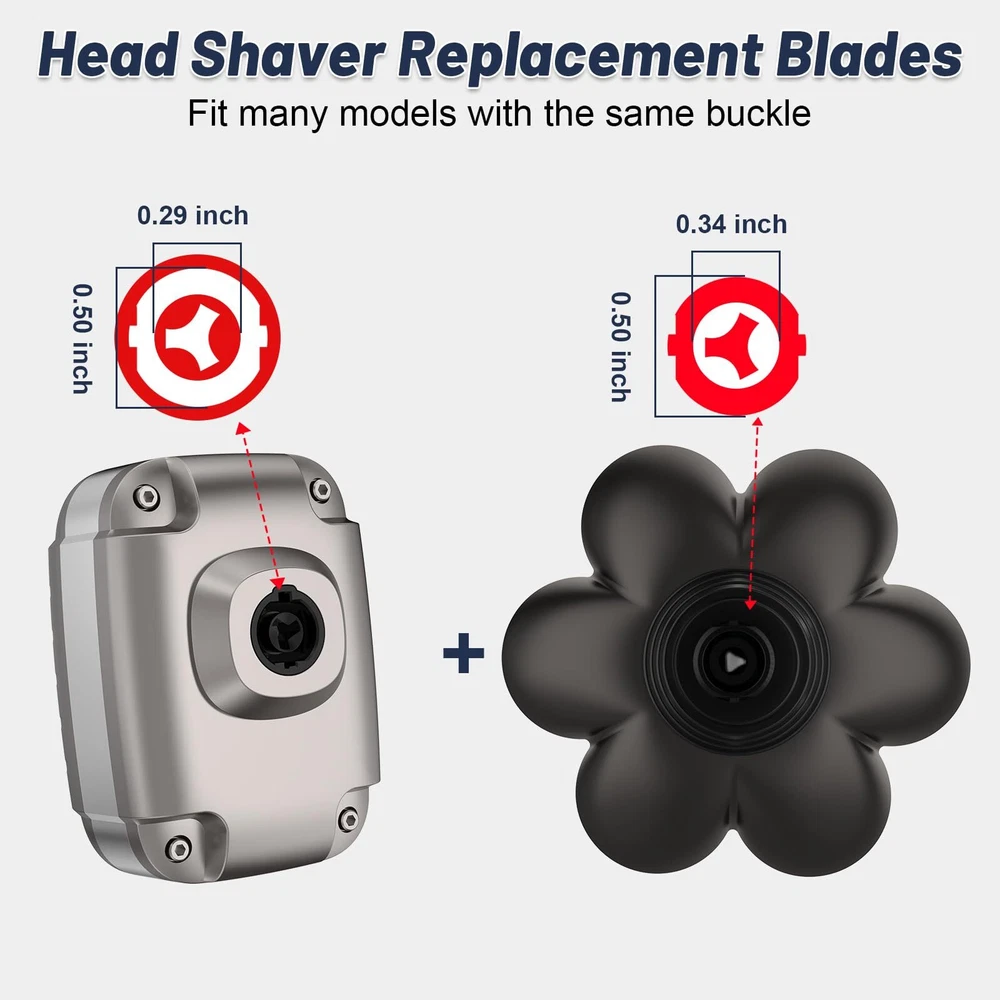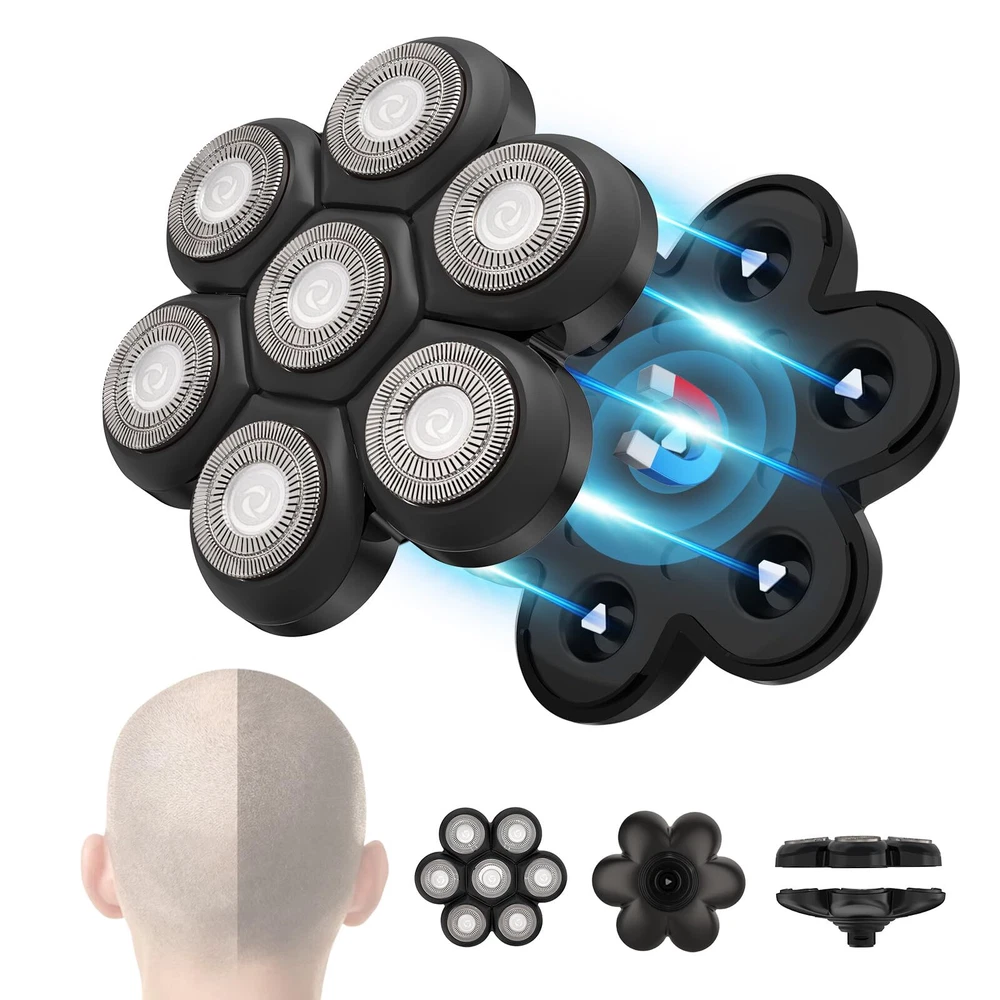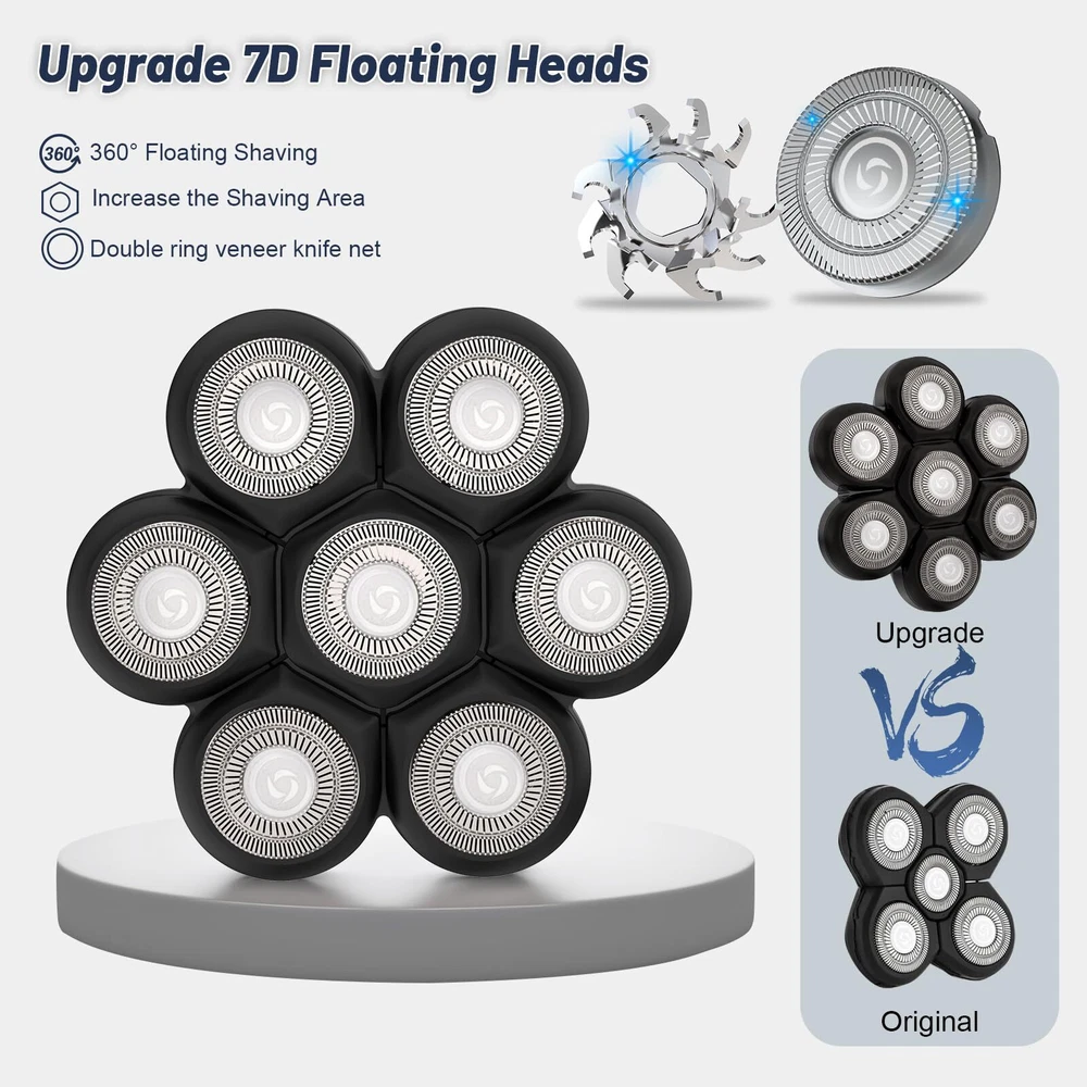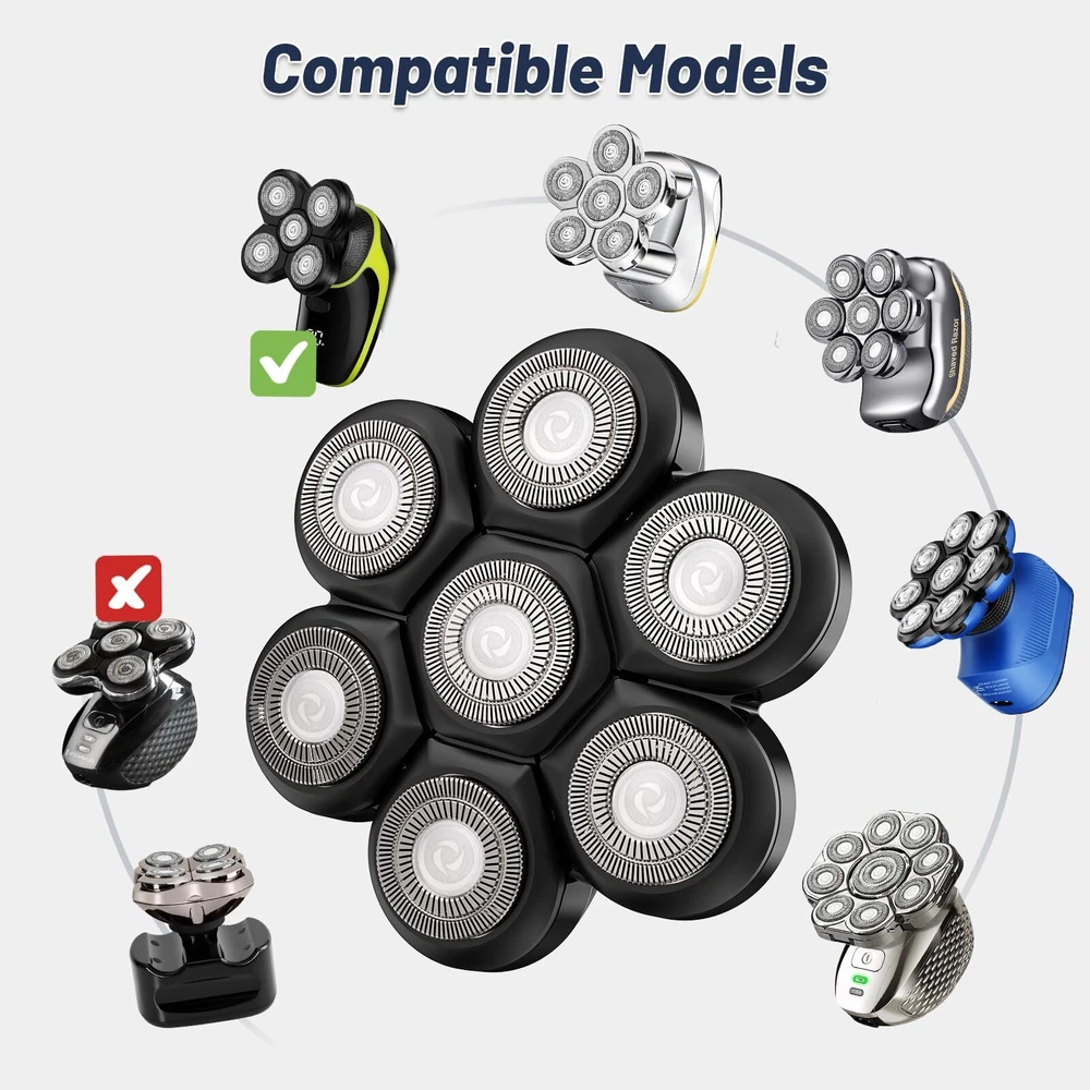 7D Floating Magnetic Electric Razor Head: This shaver heads adopts precision blade technology, the flexible head can 360° fits the contours of the face, neck and even chin for fast, increases the shaving area and saves shaving time,providing you a smooth and comfortable experience. Our razor heads is adopts with magnetic structure design, with a gentle pull, the razor head can be easily separated for easy clean.Say goodbye to a time-consuming single disassembled shaver heads, saving you time. Compatible Fit For Brands: Head shaver blades replacement heads fit with most brands head shavers that have 5/6/7/8 heads. Such as such as Free*** groom***, AidallsWell**, Vifyci*, SHPAVVE* ,AsaVe*, Aroama*, Rozi*, Roziap**, Roziahom*, Everfu*, Vsmoot*, OriHe*, WOOPOW**, Tiklea*, PaiTre*, SEFO*, Telfu* ZumY*, YEMIUG*, SKE*, Upmor*, MANL*, Asome*, ELECTRFIR*, GOOLEE*, CHI*,kense*,Kib*y and so on.(Before buying, pls check the buckle slot or base of your shaver and make sure it matches ours) Washable Shaver Blade Heads for Rotary Shavers: The head shaver replacement heads for head razor for men is waterproof, you can enjoy both wet and dry shaving. The blade razor head also can work with shaving cream, gel, foam, provide you with an exceptional shaving experience. The 7d shaver replacement blade is easy to use. Just mount it on the shaver body, and turn the shaver on. Precision Shaving: The shaver replacement heads uses the double-layer durable stainless steel blade and double protective net to accurately capture long and short hairs, skin-friendly, leaves no nicks or any irritation. The flexible rotation of the blade replacement heads and its ability to conform to the contours of the skin make the shaving process more comfortable. The blade materials and designs make them sturdy and durable, maintaining excellent shaving performance even after multiple uses. Easy to Clean: As a professional blade replacement heads for electric shavers, the magnetic design makes it easy to open, and can be cleaned underwater. For maximum shaving performance, it is recommended to replace your shaving unit once every 6 months. If you have any problem or suggestion, you can contact me at any time.