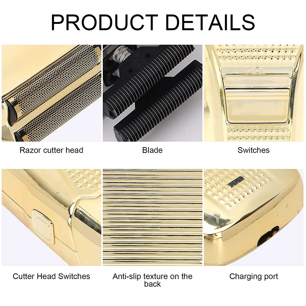 Des c ri p tion: Comfortably Fits Facial Contours: Alternate shaving design, elastic facial adjustment system, conforms comfortably to facial contours, no residue after shaving. Double Blade Design: Slim Screen Knife Net, Floating Face Adjustment to Quickly Capture Beard. Double blade design, fast cutting beards, incisive and not glued. Dual-purpose charging plug: Dual-use charging and plug, USB charging design, equipped with USB charging cable, can be connected to a variety of USB power ports, convenient charging. Multifunctional: Multifunctional, can be used to shave the bald head and shave the beard. Conforms to the ergonomic design, easy to grip and use. Easy to carry: Light and small in size, equipped with a storage bag, easy to carry when going out. Condition: 100% Brand New Item Type: Razor Material: ABS Color: Gold/Gray Power: 3w Charging Time: 5 Hours Use Time: 50 Minutes Battery: Lithium Battery 600mAh Battery Model: 14500 Razor Size: Approx. 12.5 x 6.5 x 3cm / 4.9 x 2.6 x 1.2in Weight : 270g(with box) Package List: 1 x Razor 1 x Storage Bag 1 x Transparent Cover 1 x Head Cover 2 x Half-Round Knife 1 x Cleaning Brush 1 x Manual 1 x USB Charging Cable