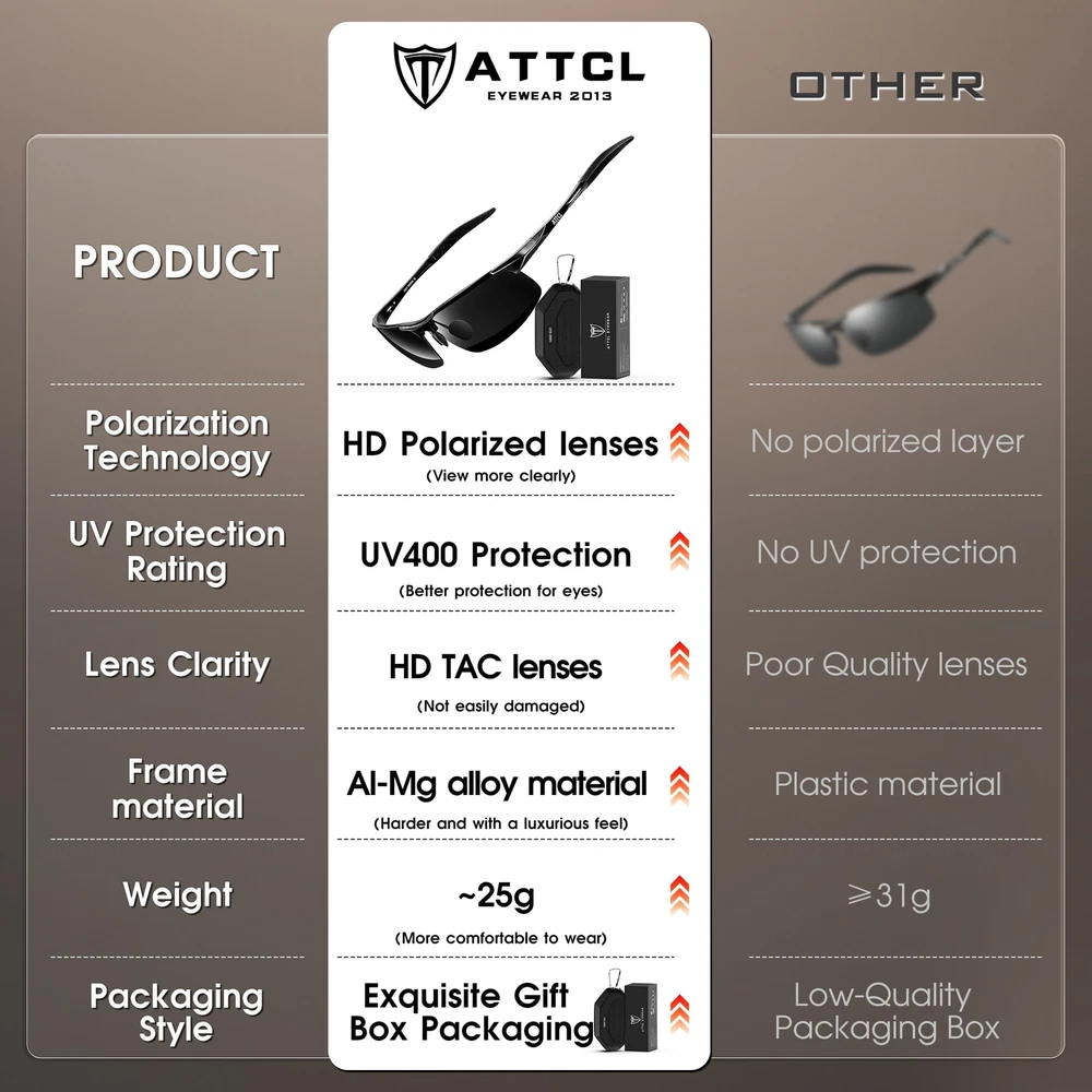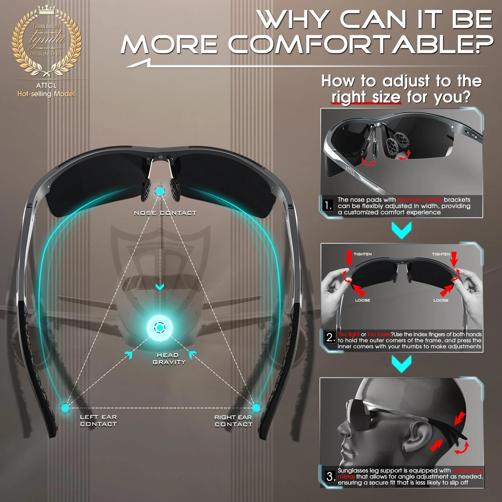 POLARIZED LENS - UV400 protection coating, blocks harmful UVA & UVB Rays. Polarized sunglasses reduce glare reflected off of roads, bodies of water, snow, and other horizontal surfaces. Restore true color, eliminate reflected light and scattered light and protect eyes perfectly. Polarized sunglasses for men cut glare and haze so your eyes are more comfortable and you can see better. ALUMINUM MAGNESIUNM METAL ALLOY make frame Strong and light.The sunglasses weigh approximately 25g, You can hardly feel them on your face, but they are unbreakable. Best forMotorcycle.The Sports Sunglasses for Men Cycling Bicycle, Driving, Running, Fishing,Racing, Skiing and Climbing, Trekking Or Other Outdoor Activities Enthusiasts REAL UV400 PROTECTION -- lenses are engineered to block 99.of all harmful blue light up to 400 nanometers including UVA(320-400 nm),UVB(280-320 nm)and UVC(100-280 nm). EXQUISITE PRESENT OPTIONS & PREMIUM PACKAGE: polarized sunglasses for men are wonderful present for Father, Husband, Son, Boy Friend or Family. Each pair includes a zipper case, box, microfiber pouch, cleaning cloth, and polarization test card. VERSATILE OUTDOOR EYEWEAR FOR OUTDOOR SPORTS ENTHUSIASTS 24/7 ONLINE INFORMATION INQUIRY: If you have questions about the fit, lens clarity, or frame durability of your sunglasses, please click our name below and select 'Ask A Question.' WE WILL PROVIDE PROMPT ASSISTANCE TO ADDRESS YOUR CONCERNS