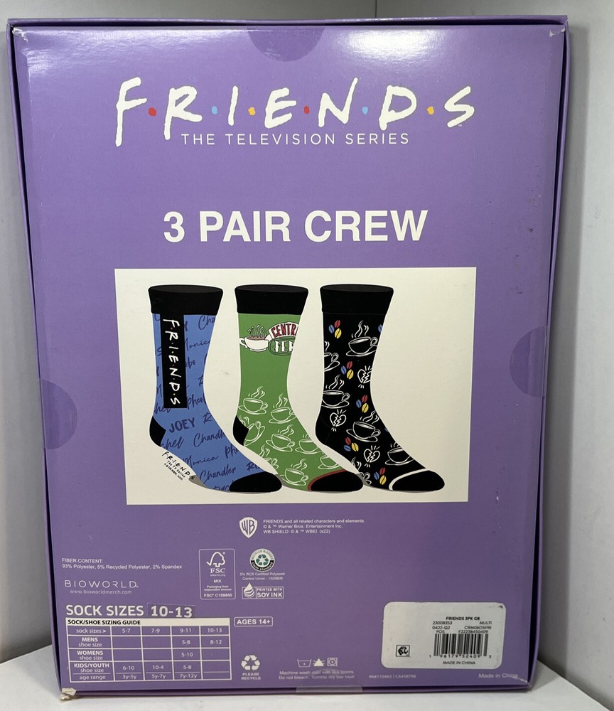 BioWorld FRIENDS TV Show Men’s CREW SOCKS 3 Pairs Novelty Shoe Sz. 8-12 Box Set Brand New See Box For Complete Details and size chart
