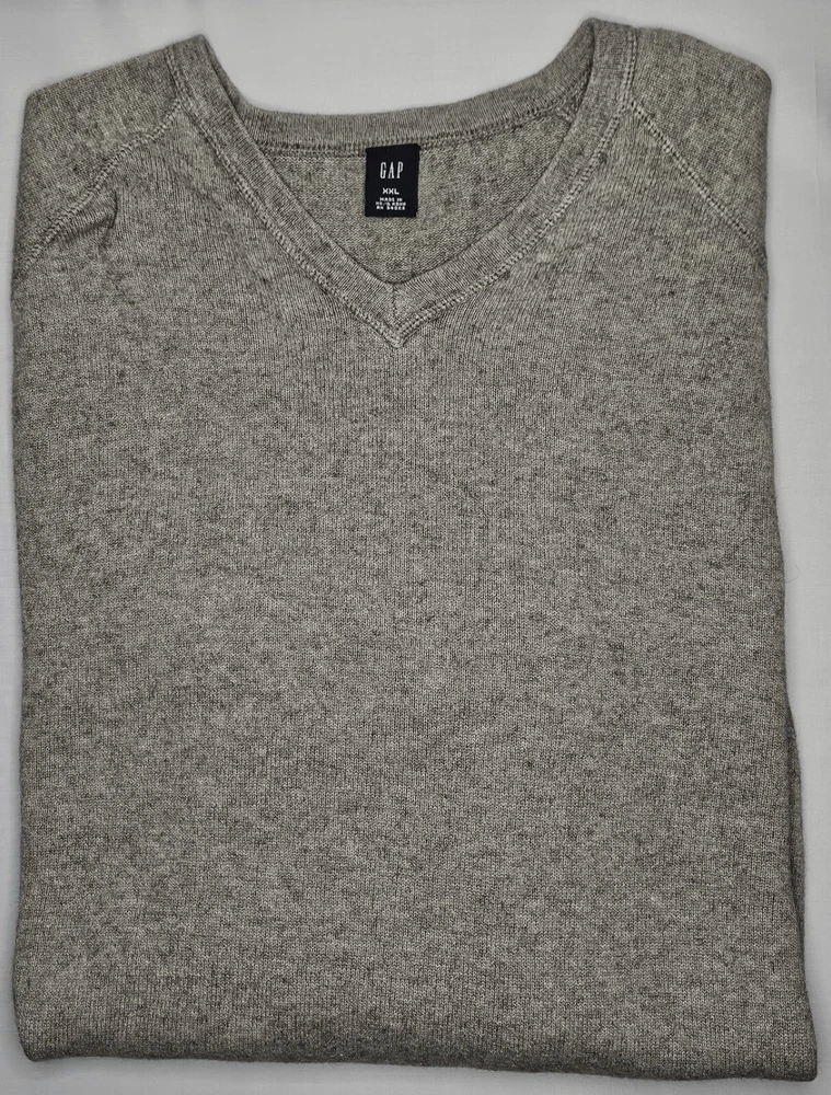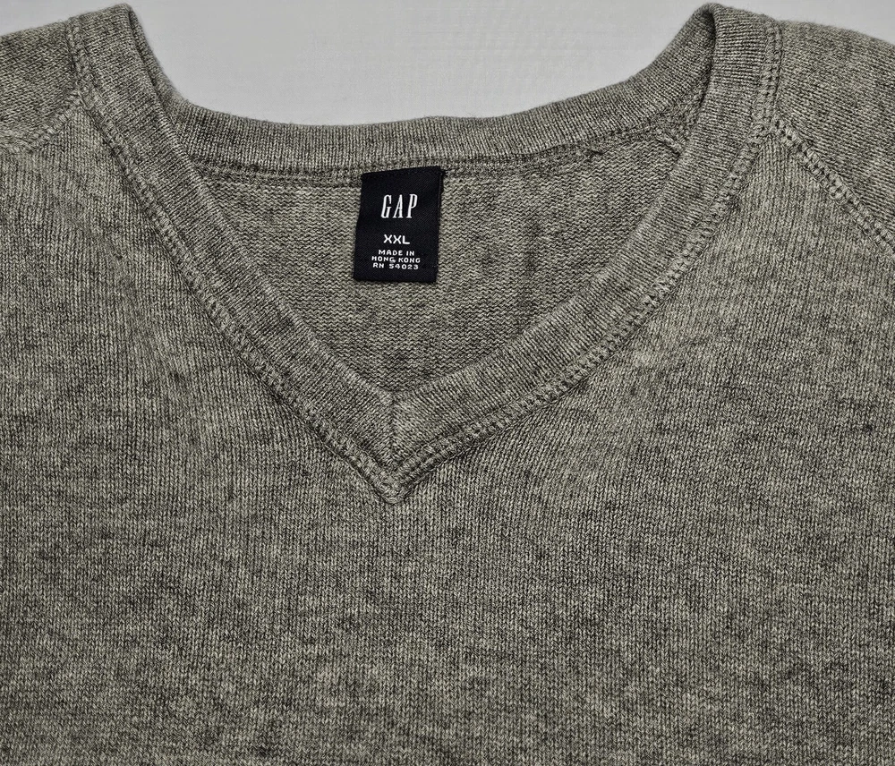 Mens Gap Long Sleeve Gray Wool Blend Vee Neck Sweater Size XXL 84-16 cotton/wool blend Great looking gray long sleeve vee neck sweater Wide elasticized banded hem Excellent used condition VERY NICE SWEATER FROM SMOKE FREE HOME. FAST SHIPPING WITH TRACKING INFORMATION PROVIDED.