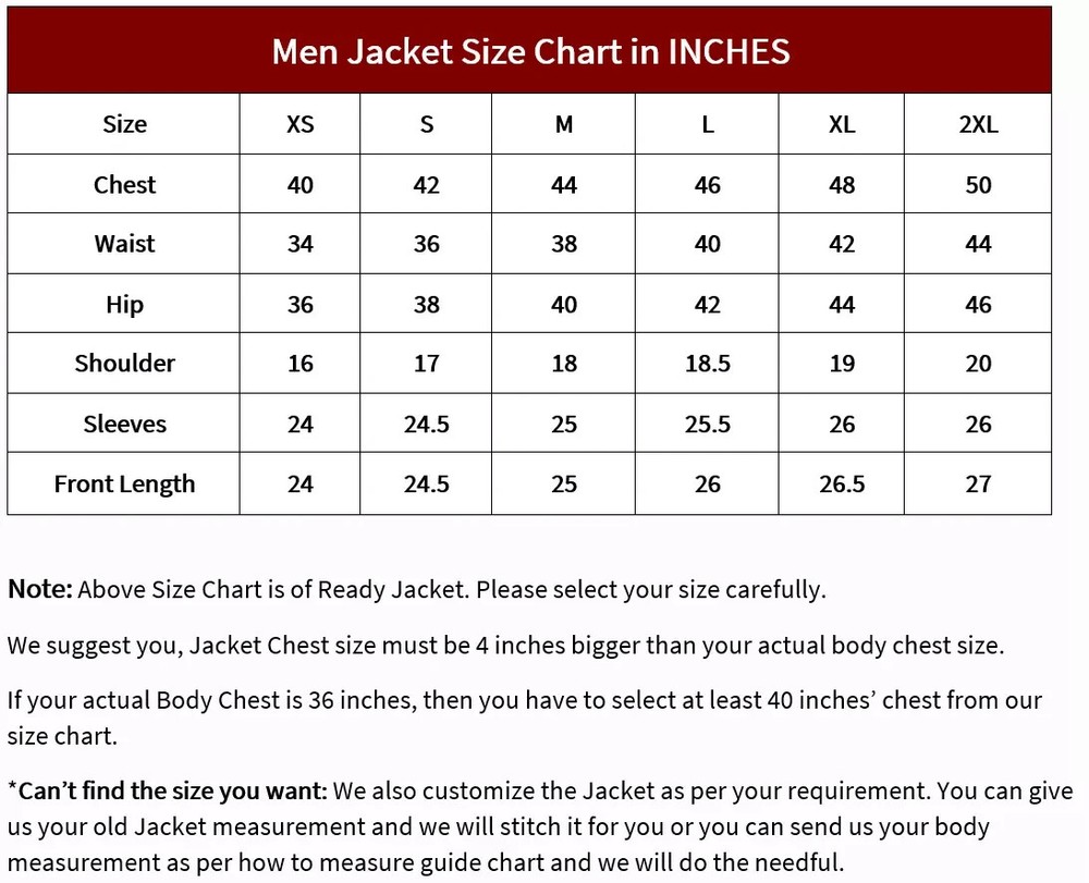DESCRIPTION: Color: As Image Comfort: Soft Satin inner lining comfort during all seasons Fit: Tailored fit for a sharp, modern silhouette Durability: Heavy-duty zippers and reinforced stitching for long-lasting wear Pockets: As image and 1 inside pocket Payment Policy: Ebay Shipping Policy: Ebay Shipping within 10 to 12 working days. Tracking number will be provided after shipment. In case of unavailability of your item size in our stocks due to any issue, we'll ship it directly from our overseas manufacturing premises. Returns/Exchange Policy: Ebay Returns/Exchanges are accepted within 30 working days of receiving the item in genuine condition. Our QC checks each and every item thoroughly before shipping it out to the customer so it is rarely possible that you may found any issue other than sizing. Postage & packaging charges are not refundable in any circumstances, the cost of return and postage charges of second jacket in case of exchange would be paid by buyer, therefore please select your size by reading our size charts carefully to avoid later issues. Note : If you have any issue with product or service please contact us before Ebay even you want to return or refund we do exchange and we will resolve the issue for sure because customer safety is our first priority. thank you
