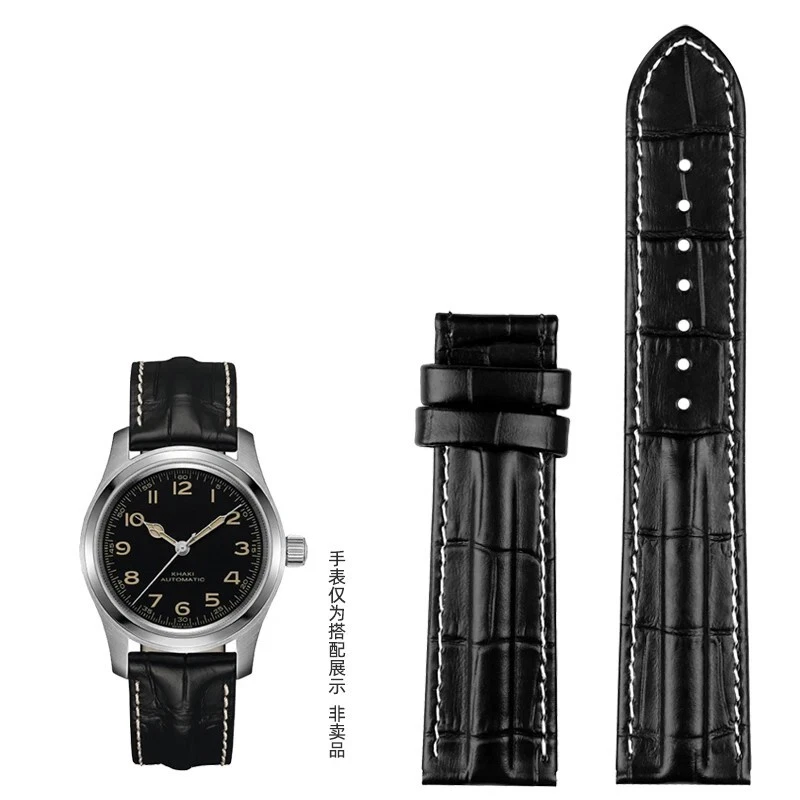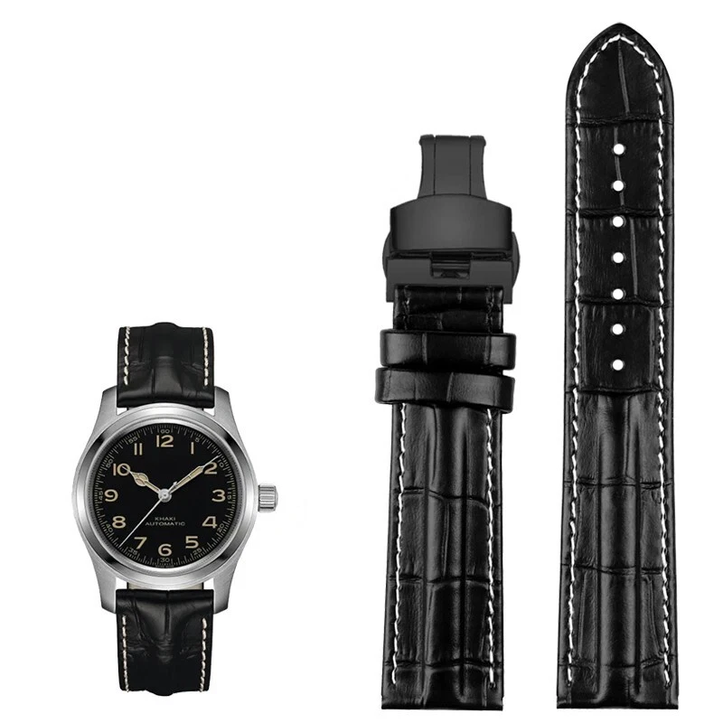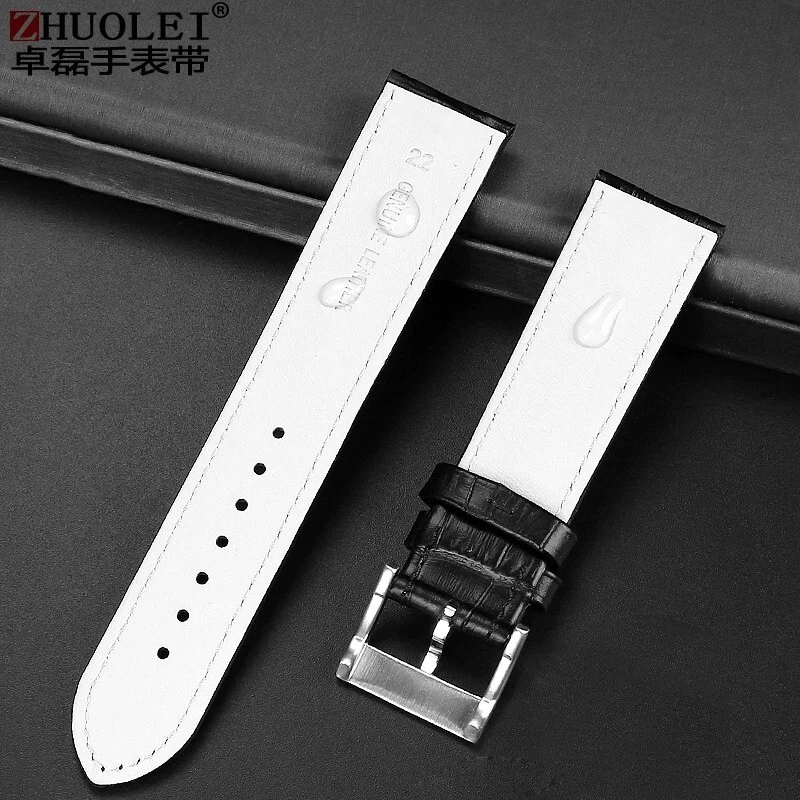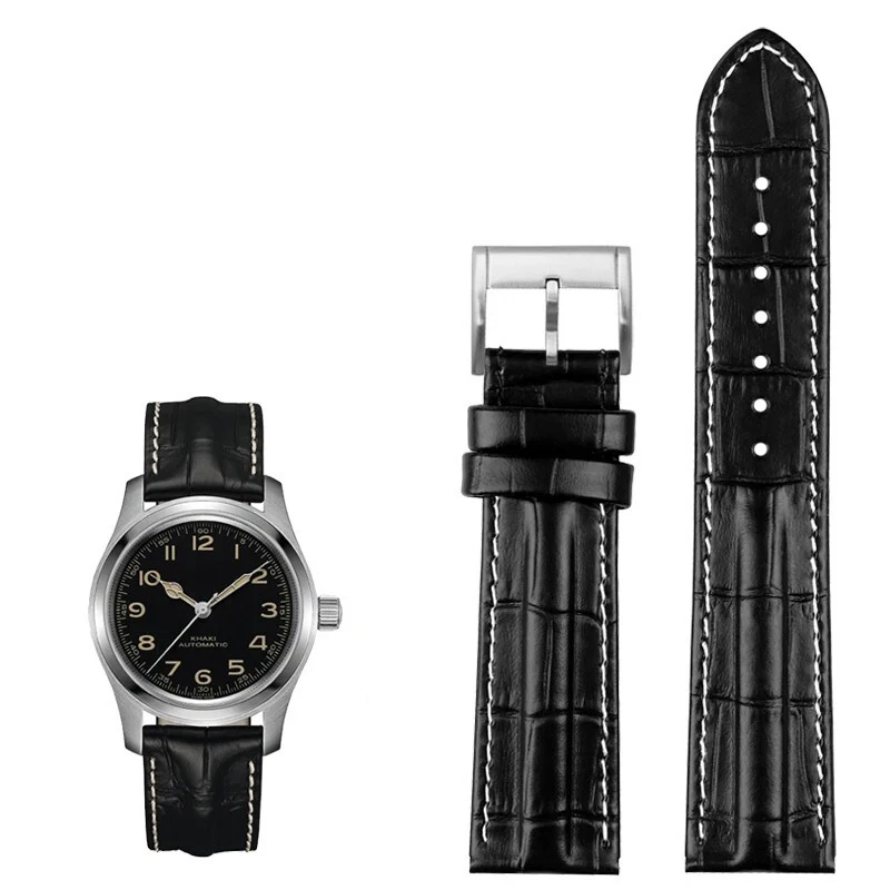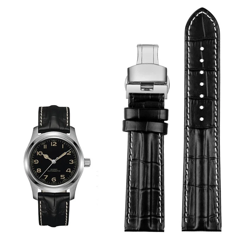 Description: Band Width: 20mm, 22mm Material: Genuine leather Color: Black / Brown / Black White Buckle: Stainless Steel Clasp Length: about 120+75mm Thickness: about 3-5mm Type: Fashion Package: 1 x watch strap 1 x loading strap tools 3 x hand ears (pins)